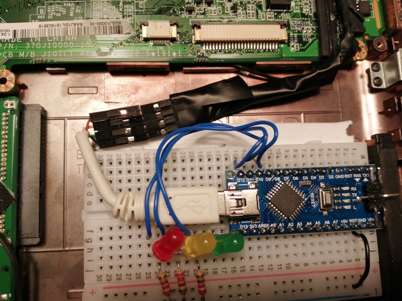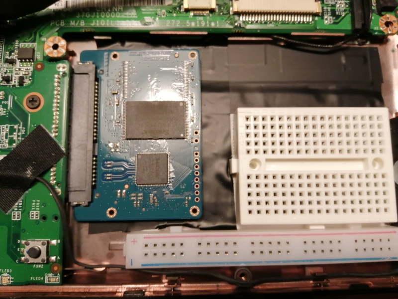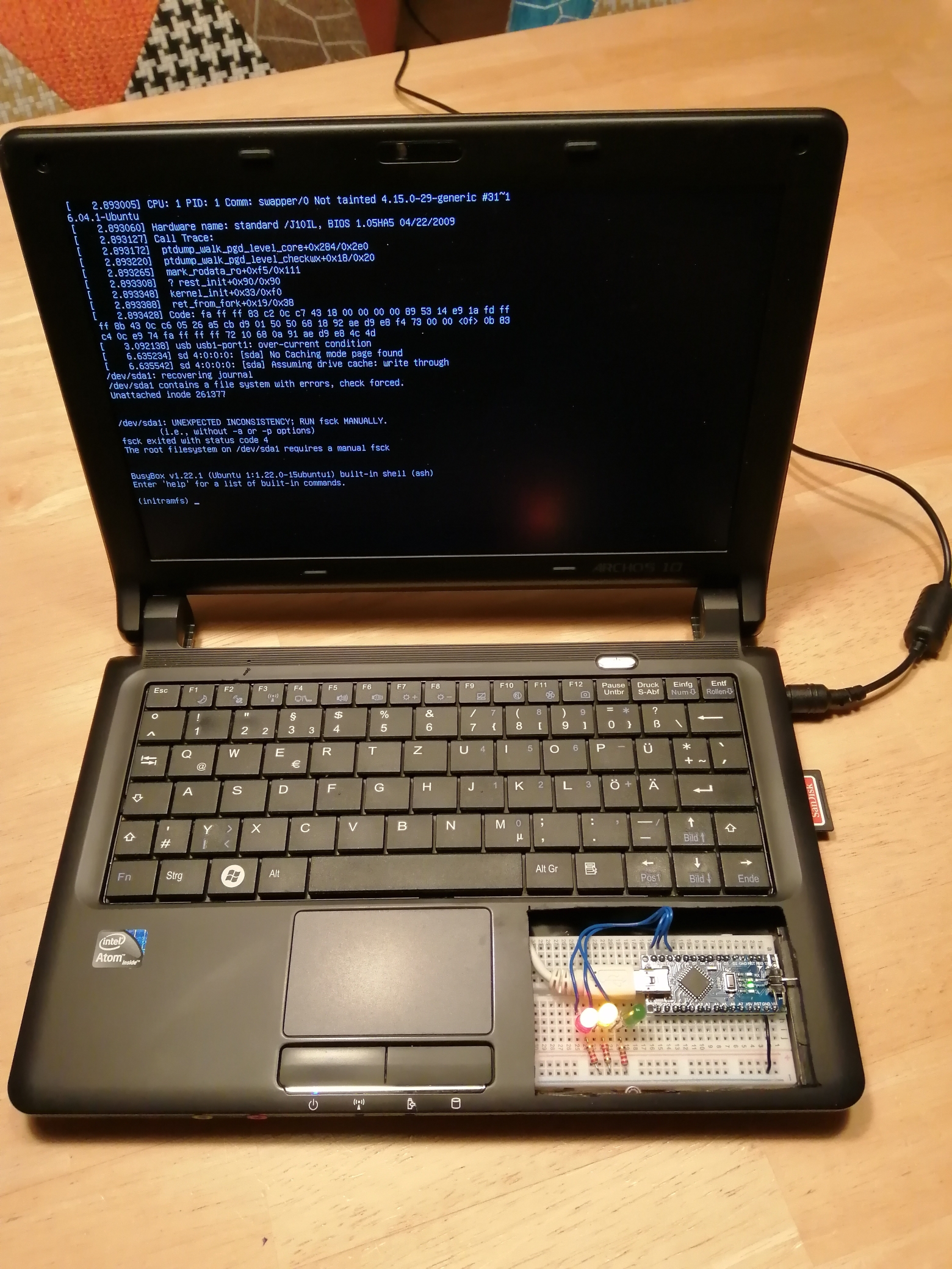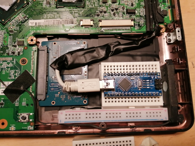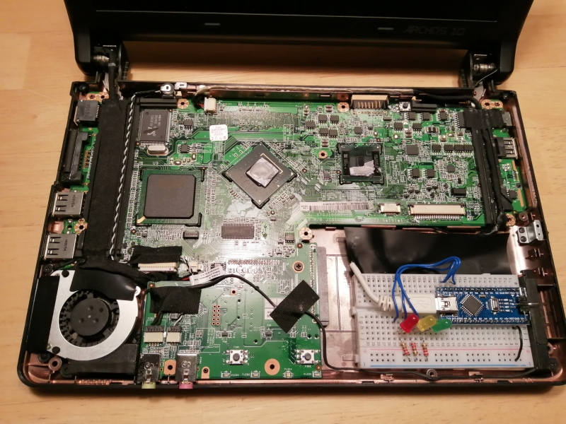 Da in einem Netbook grundsätzlich Platzmangel herrscht, wurde die Festplatte ausgebaut und stattdessen ein Breadboard mit einem Arduino Nano eingebaut, wofür ein Teil des Netbook-Gehäuses mit einem Dremel und einer dünnen Trennscheibe "herausgesägt" wurde. Anschließend sollte ein Linux-Betriebssystem auf eine "schnelle" SD-Karte installiert werden: