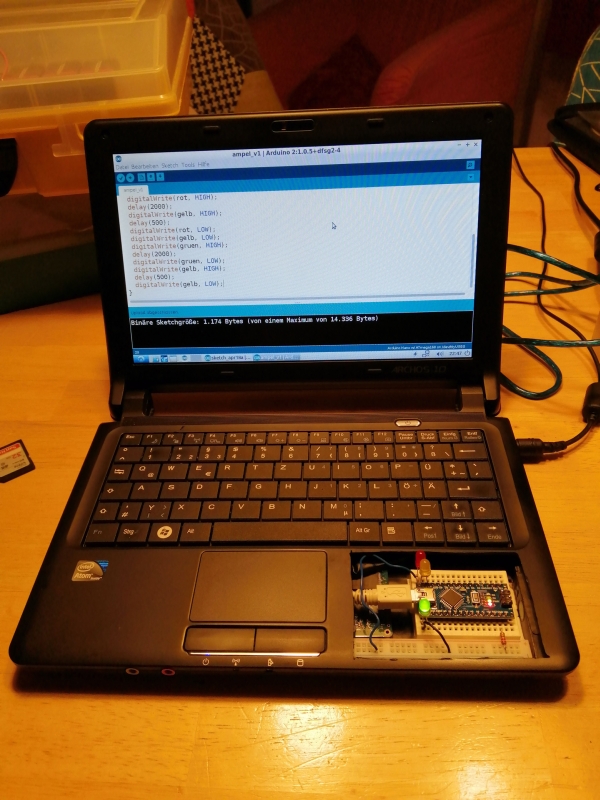 Nach einem Test der eingebauten LED in Pin 13 wurde eine Ampelschaltung mittels 3 verschiedenfarbigen LEDs, je einem 220 Ohm Widerstand und einigen Verbindungskabeln aufgebaut und ein passender Sketch mit der Arduino IDE dafür geschrieben, wie auch in dem Video gut zu sehen ist: