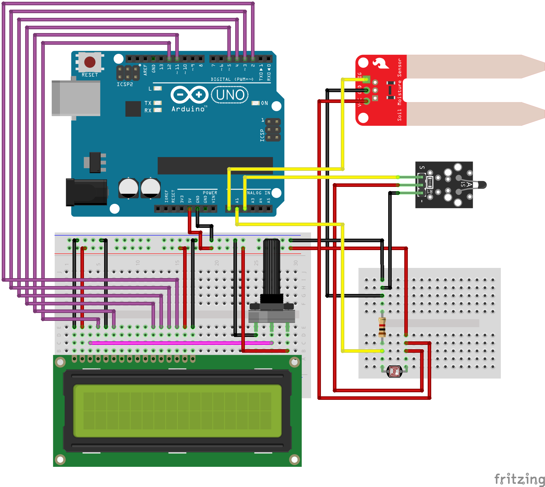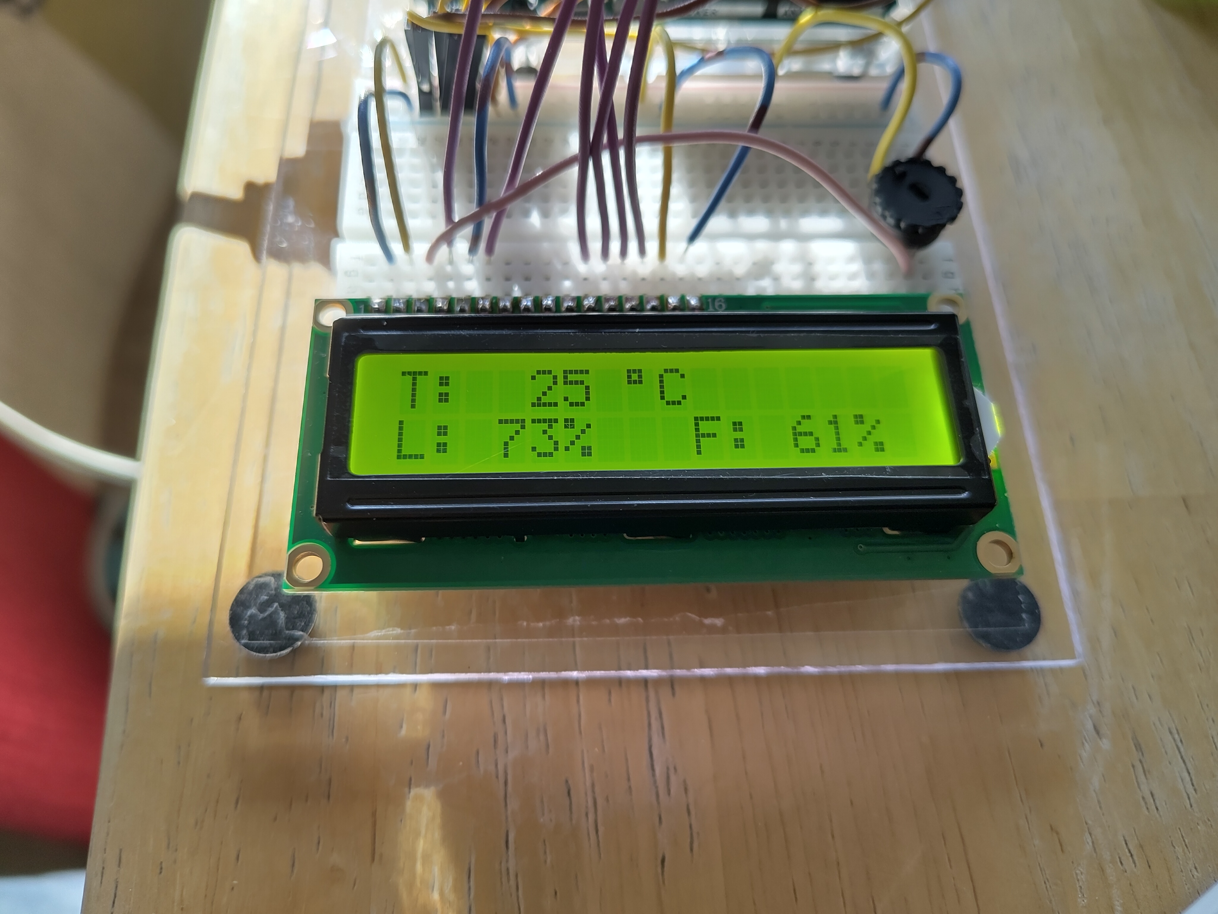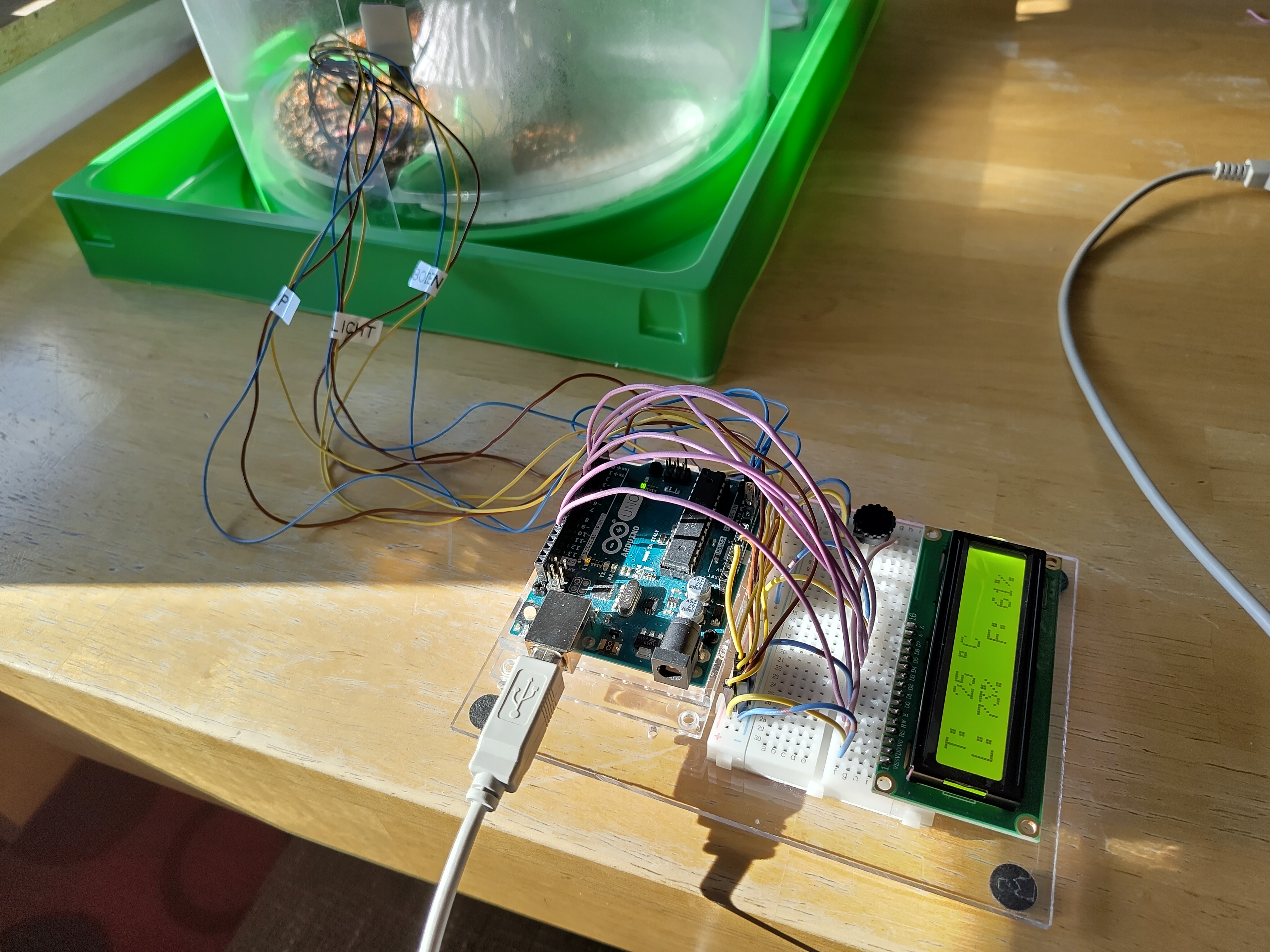 Der Arduino-Mikrocontroller wurde ebenso wie das Breadboard zunächst auf einer Plexiglasscheibe im DIN A6-Format befestigt, um der gesamten elektronischen Schaltung eine kompaktere und gleichzeitig stabilere Form zu geben und das LCD-Display und dessen Anschlusskabel zu fixieren. Durch das nur sporadische Einschalten der Elektronik mittels 9V-Batterie-Anschlusskabel dürfte auch der Bodenfeuchtigkeitssensor keinen permanenten Schaden trotz längerer Verweildauer im Boden nehmen.