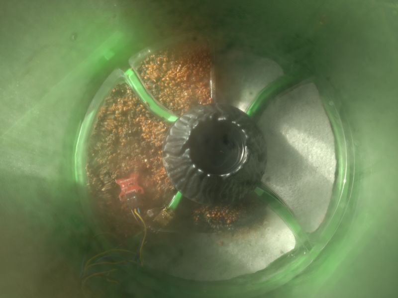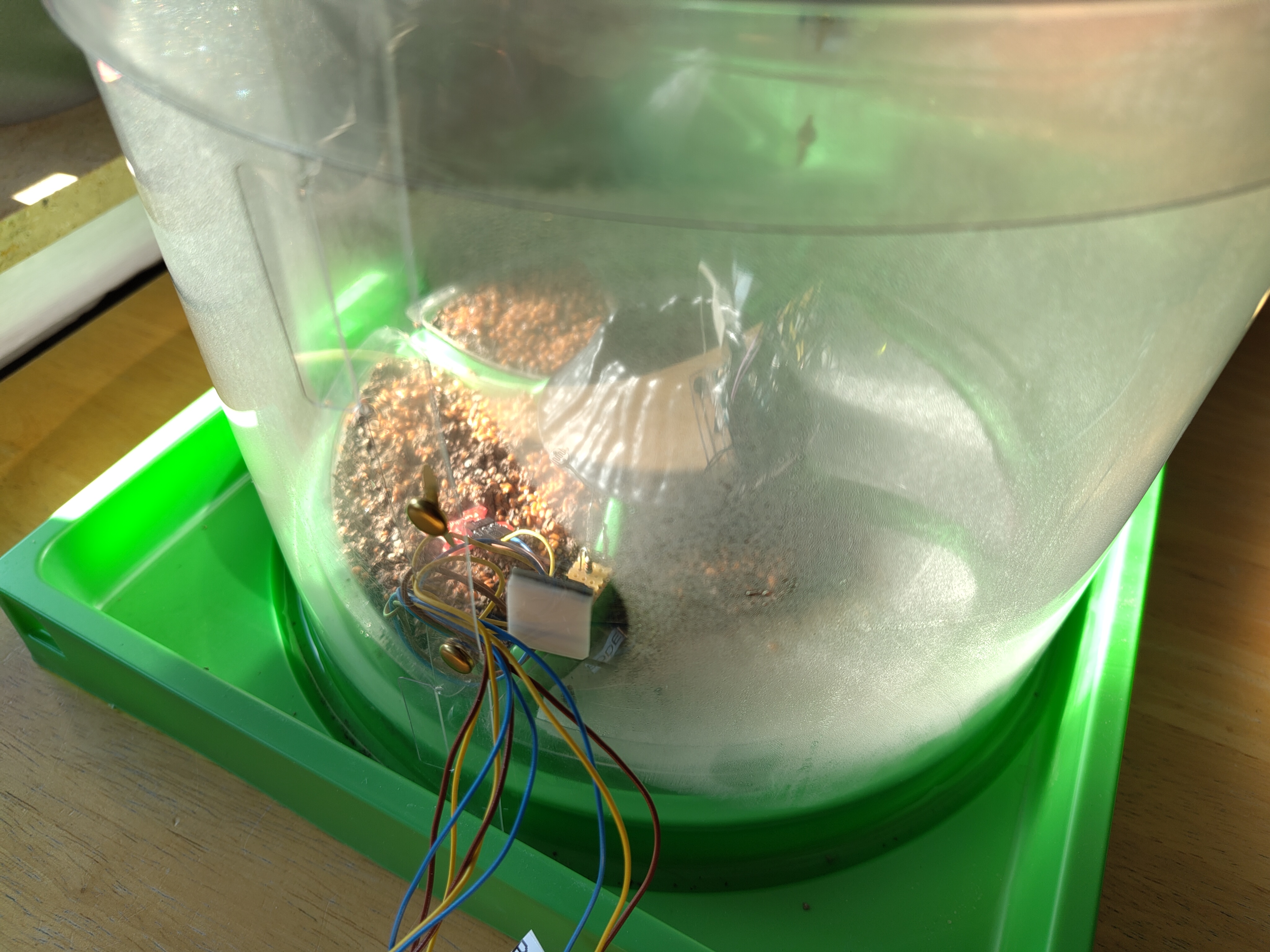 Anschließend galt es, die drei Sensoren so innerhalb des Kunststoffzylinders unterzubringen, dass die Sensoren optimal innerhalb des Biotops positioniert wurden. So wurde der Temperatursensor mittels doppelseitigem Klebeband von innen etwa auf halber Höhe an den Kunststoffzylinder geklebt, der Lichtsensor wurde auf eine der Unterteilungen zwischen den einzelnen Pflanzschalen befestigt und der Bodenfeuchtigkeitssensor wurde direkt in eine der Pflanzschalen gesteckt. Die insgesamt neun Kabel konnten dank der Stecktechnik des Kunststoffzylinders so nach außen geführt werden, dass möglichst wenig Feuchtigkeit entweichen konnte.