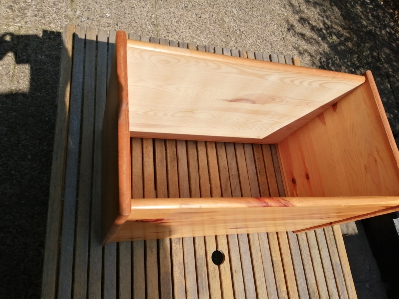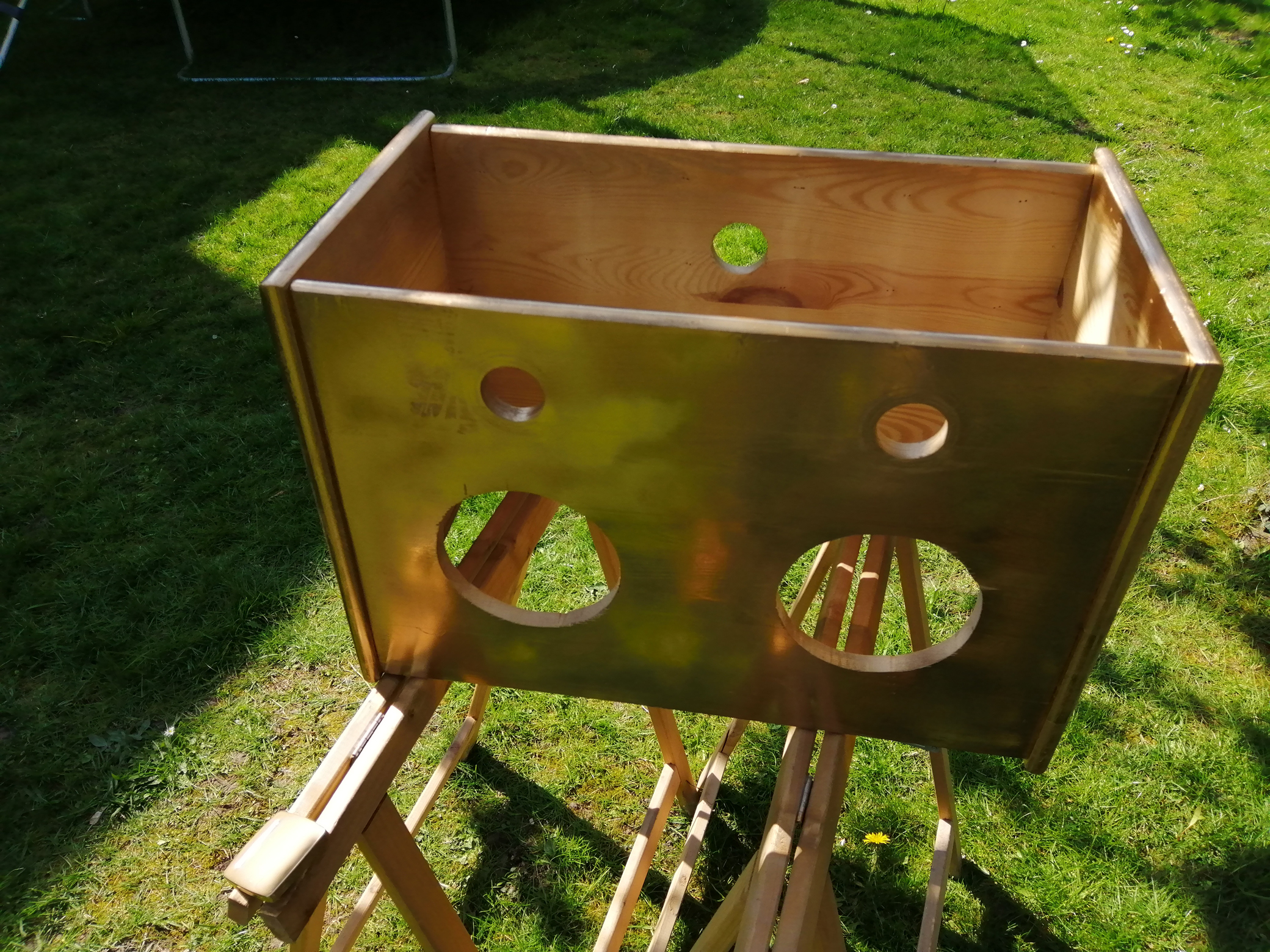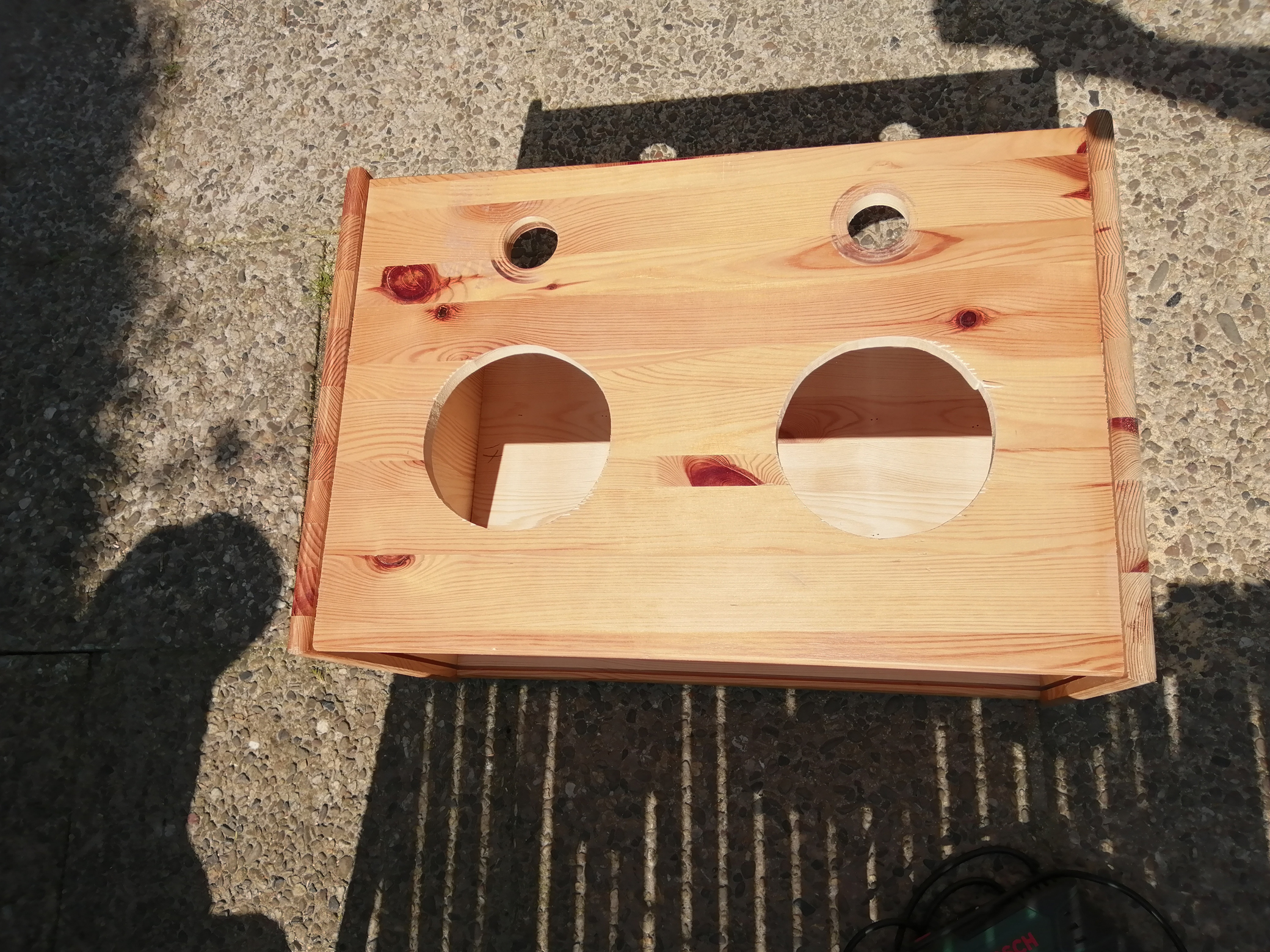 Zunächst musste der alte Schubladenschrank bis auf vier Seiten "entkernt" werden, auch die Rollen wurden abmontiert und später wieder an anderer Stelle angebaut. Anschließend wurden die Aussparungen für die 2 großen und kleinen Lautsprecher in eine Seitenwand gesägt, während auf der gegenüberliegenden Seitenwand Aussparungen für einen Schalter und das Bassreflexrohr in das Holz gesägt wurden: