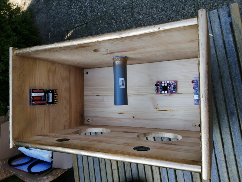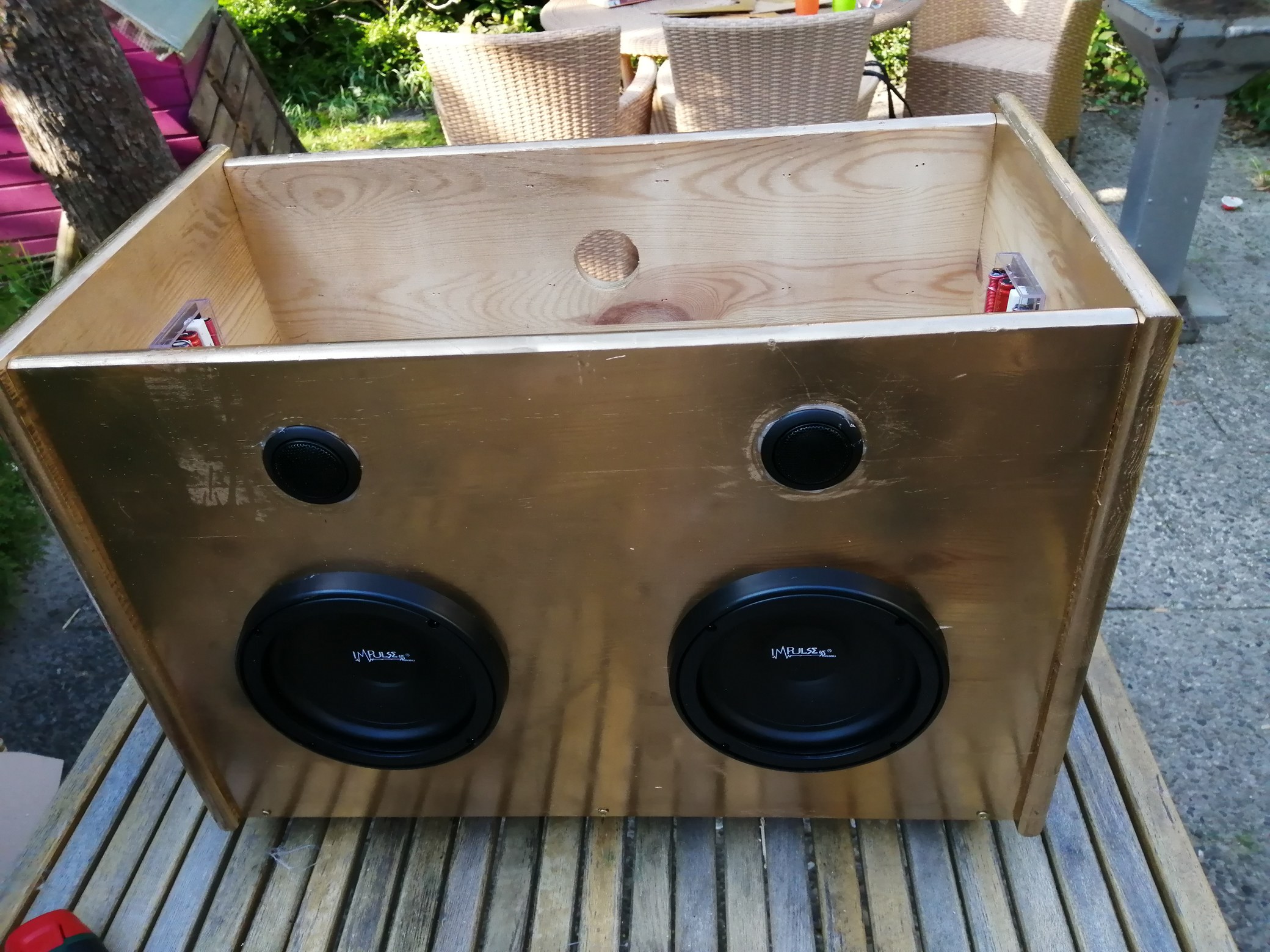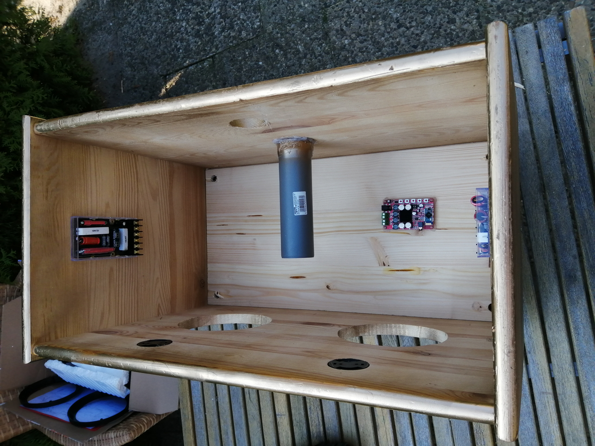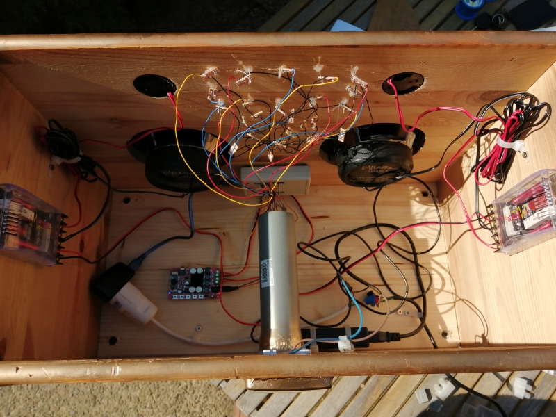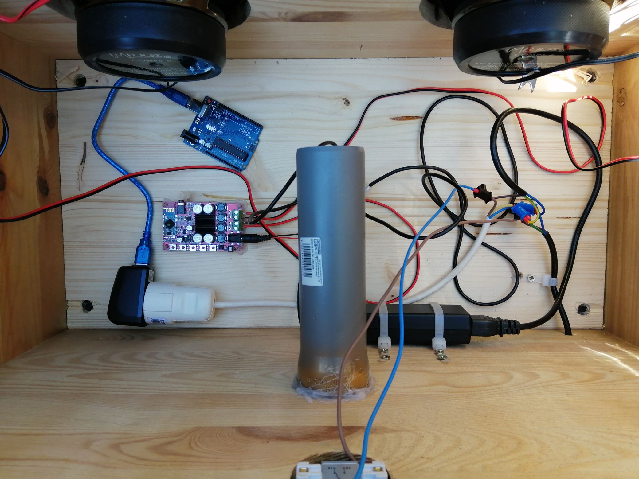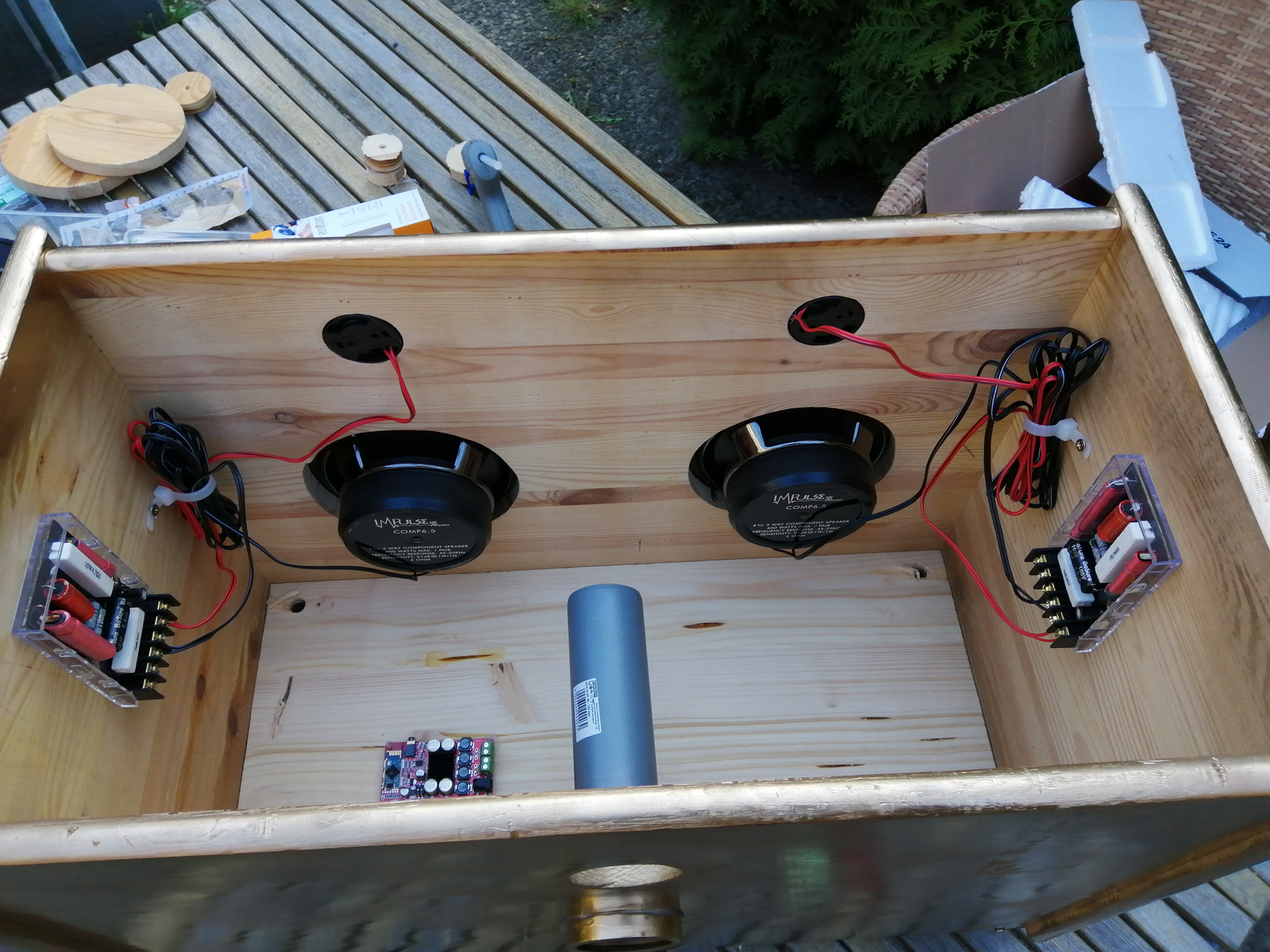 Im nächsten Bauabschnitt wurde es ernst: Die Frequenzweichen wurden an den Bluetooth-Verstärker angeschlossen und dieser wiederum an das 19V-Notebook-Netzteil. Außerdem wurde eine kleine Steckdose für das 5V-Steckernetzteil eingebaut und dieses über das USB-Kabel mit dem Arduino Uno verbunden. Beide Netzteile wurden über einen eingebauten, handelsüblichen Wandschalter mit einem 220V-Anschlusskabel verbunden und alles wurde ordentlich mittels Kabelbinder fixiert. Ein erster Soundcheck mit einem per Bluetooth angeschlossenen Smartphone lief super!