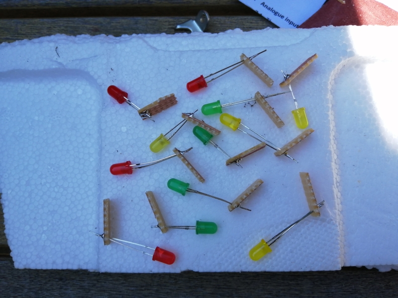 Von diesen Mini-Lochrasterplatinen ausgehend wurden alle GND-Kabel der LEDs auf einer größeren Lochraterplatine miteinander verbunden und schließlich über ein weiteres Kabel an den GND-Anschluss des Arduino Unos angeschlossen. Der Pluspol der LEDs wurde dagegen jeweils auf einer weiteren Mini-Lochrasterplatine mit einem 220 OHM Widerstand verbunden und von dort an die I/O-Pins D2 bis D13 des Arduino Unos angeschlossen. Das Ergebnis sieht etwas chaotisch aus, funktionierte aber (fast) auf Anhieb: Nachdem eine "Blink-LED" gegen eine gewöhnliche LED ausgetauscht wurde - eine Verwechslung, die für einige Verwirrung sorgte und eine vergebliche Fehlersuche im Arduino-Sketch zur Folge hatte - leuchteten die LEDs wie gewünscht und lassen sich nun jederzeit über den Arduino Uno in beliebiger Weise als Blink-, Lauf- oder Dauerlicht programmieren: