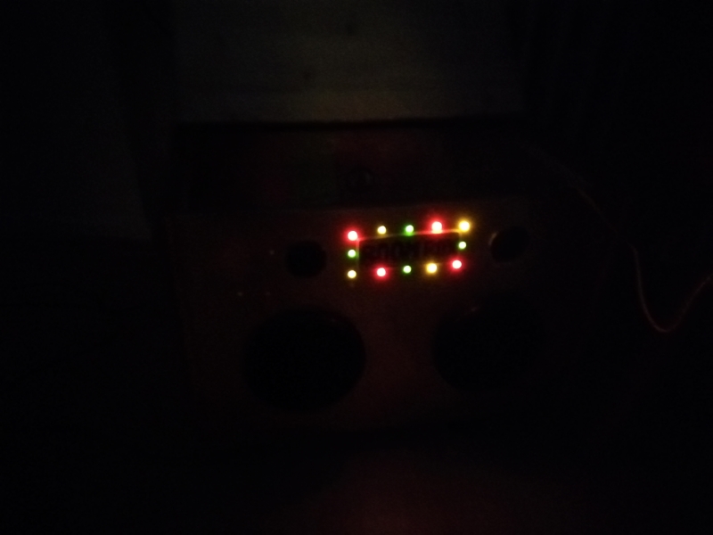 Schließlich musste noch das BoomBox-Schild angeklebt und von 12 LEDs beleuchtet werden. Dazu wurden die passenden Löcher gebohrt und die LEDs wurden auf eine Mini-Lochrasterplatine gelötet: