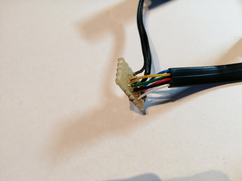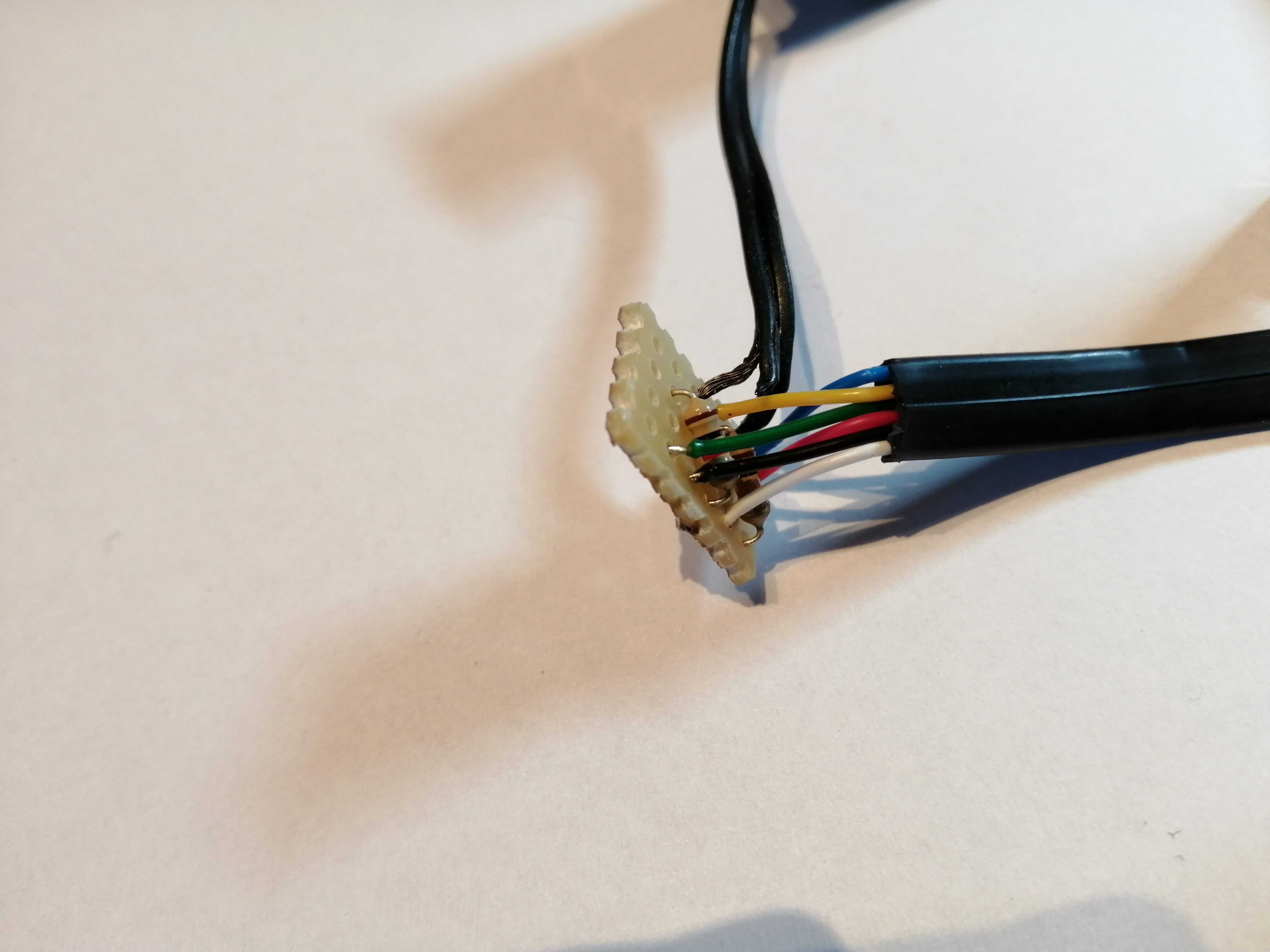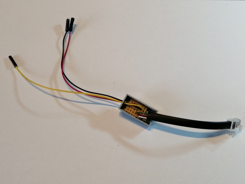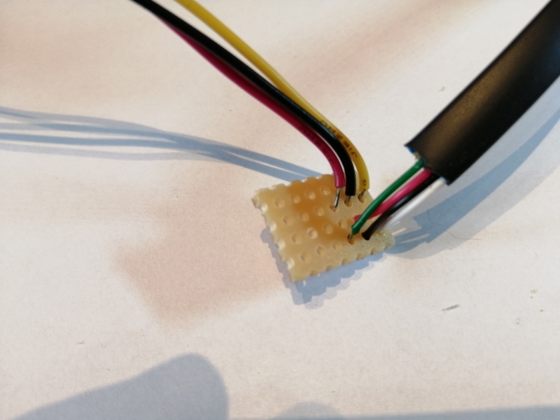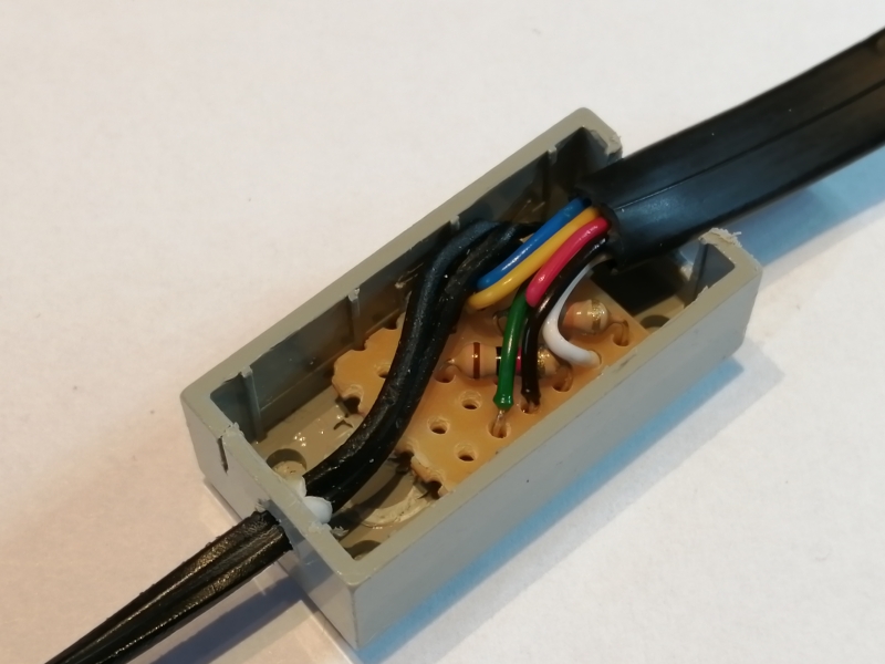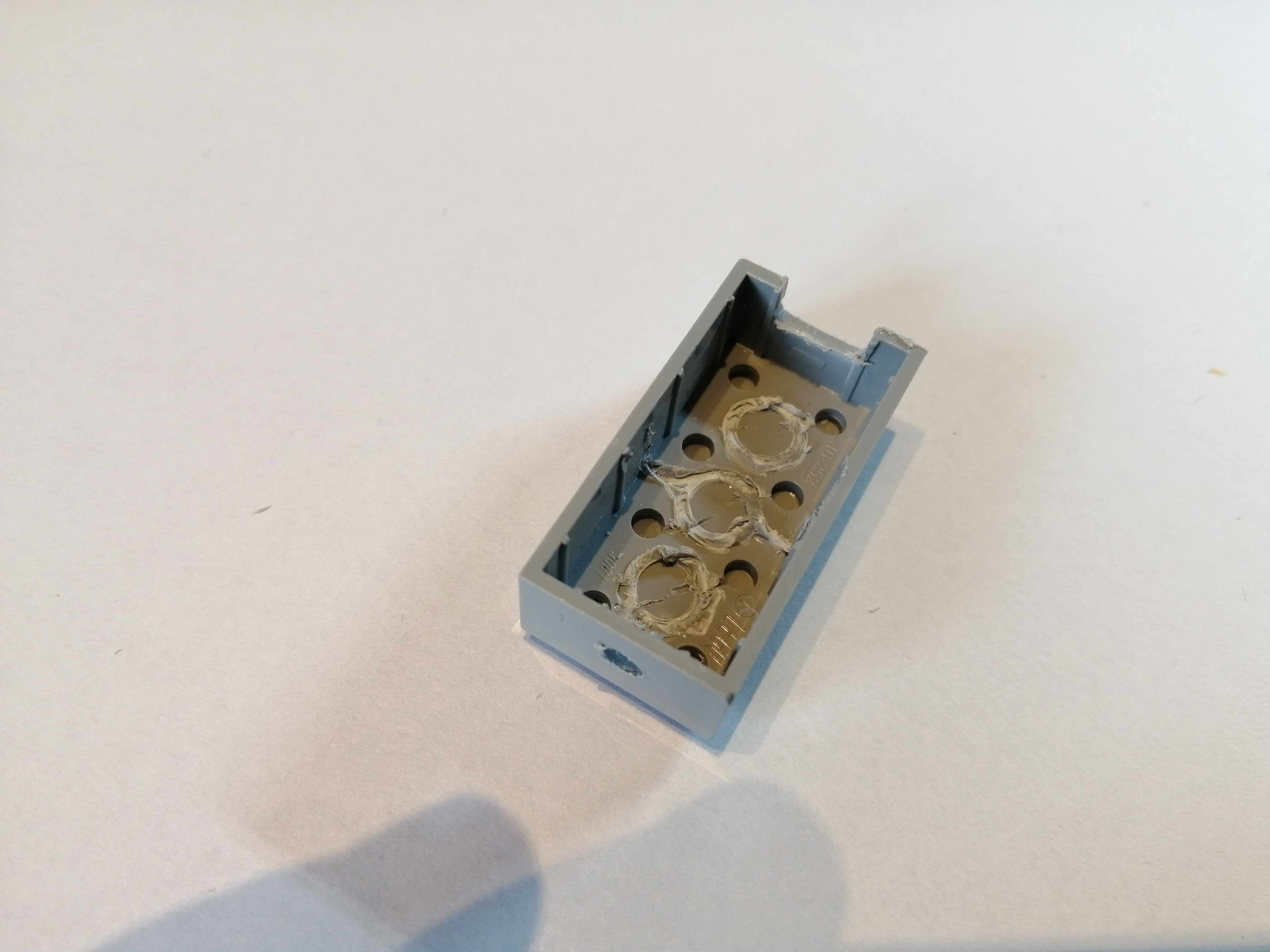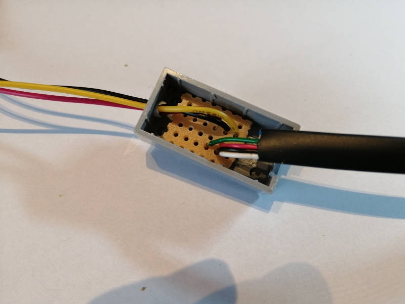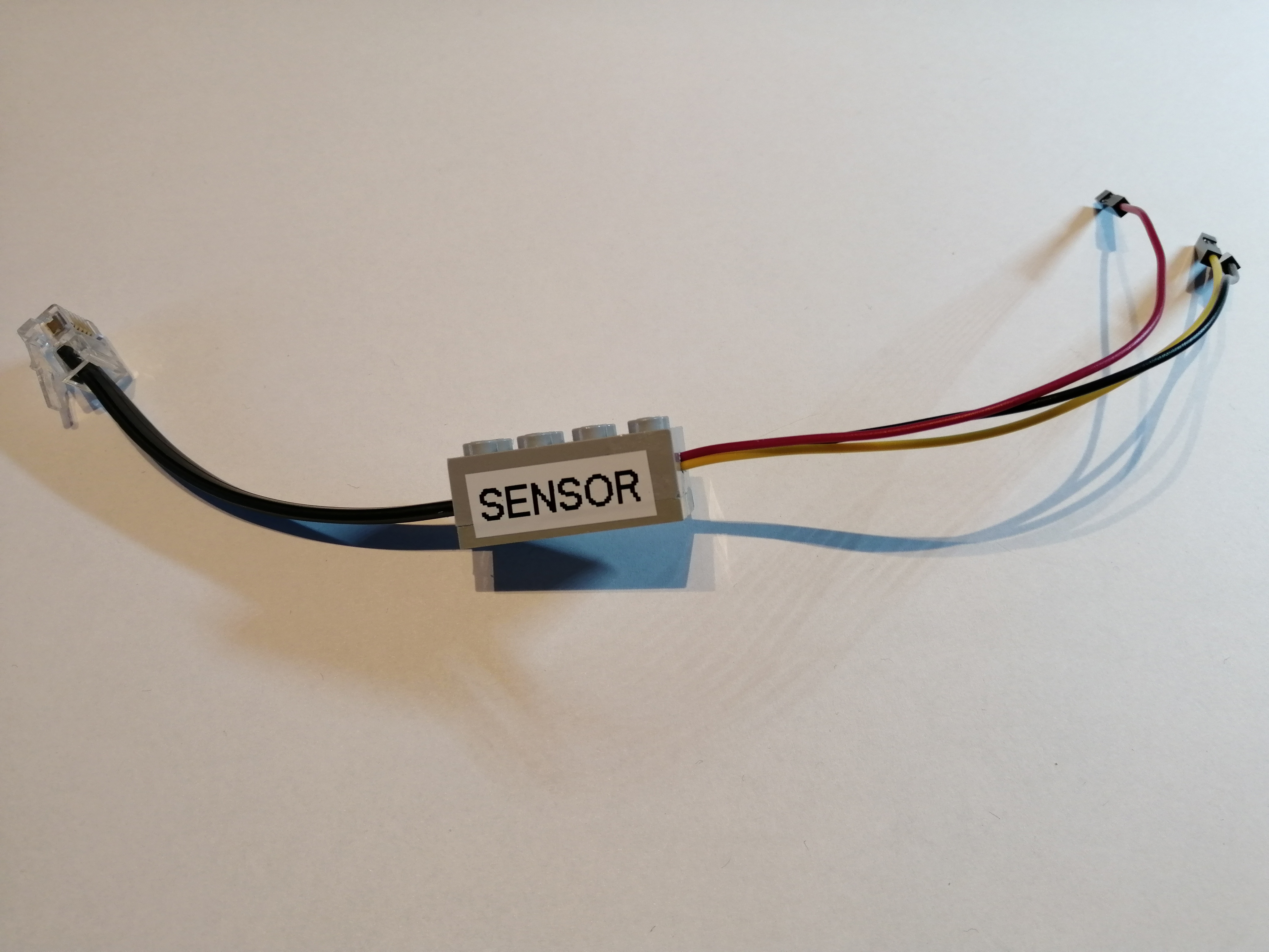 Für das EV3-SENSOR-Adapterkabel wurde zunächst eine Aussparung auf der einen Seite des Legosteins herausgeschnitten, während für die Sensor-Anschlusskabel auf der anderen Seite ein passendes Loch gebohrt wurde. Anschließend wurden die Adern der beiden Kabel gemäß der o.a. Schaltung auf der Leiterbahnplatine miteinander verlötet: