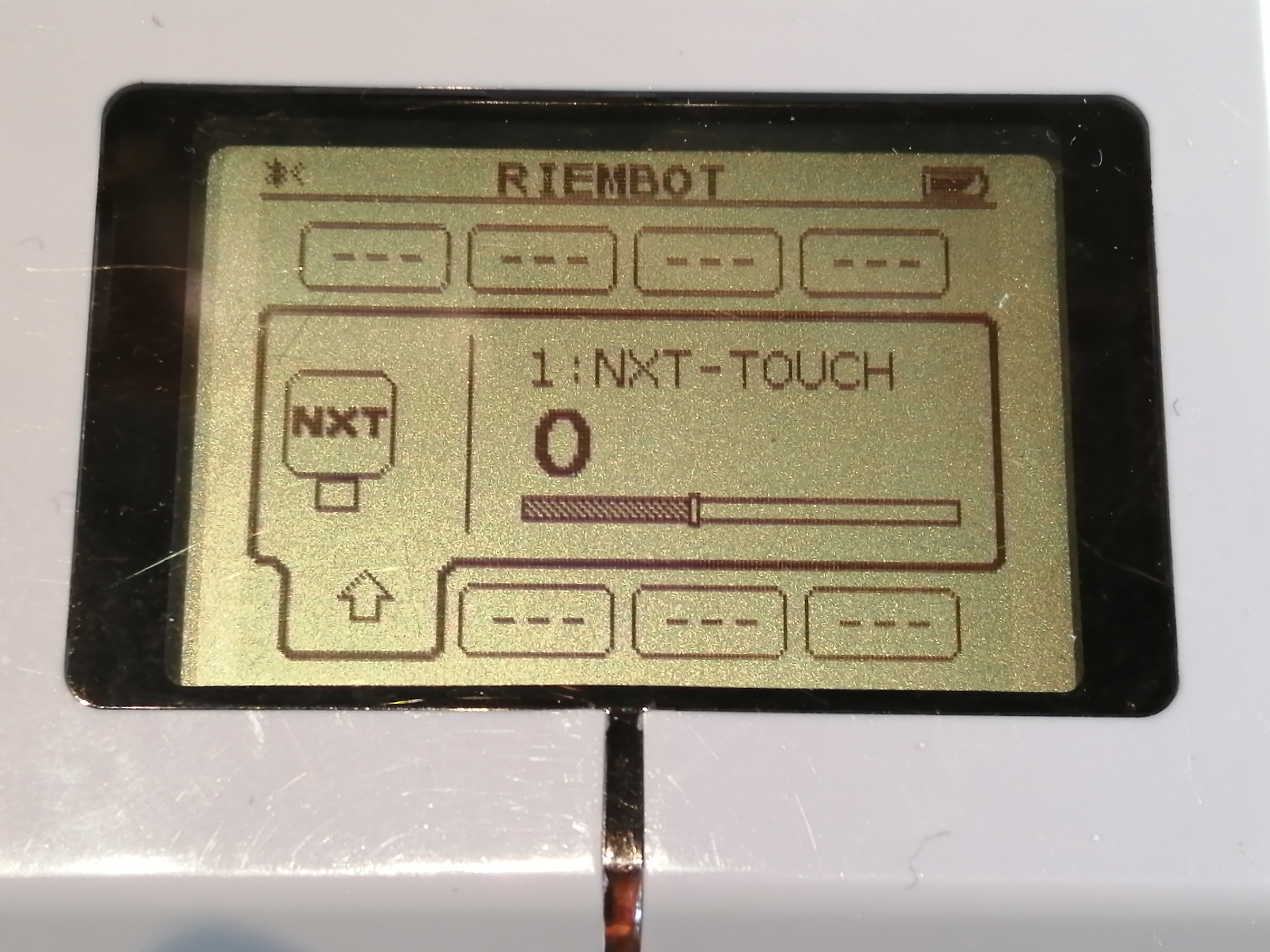 Auf den nächsten Bildern sieht man deutlich, dass ein angeschlossenes Potentiometer als "NXT Touch-Sensor" erkannt und die eingehende Spannung als analoger Messwert (Balken unterhalb der Anzeige "0" oder "1") exakt angezeigt wird: