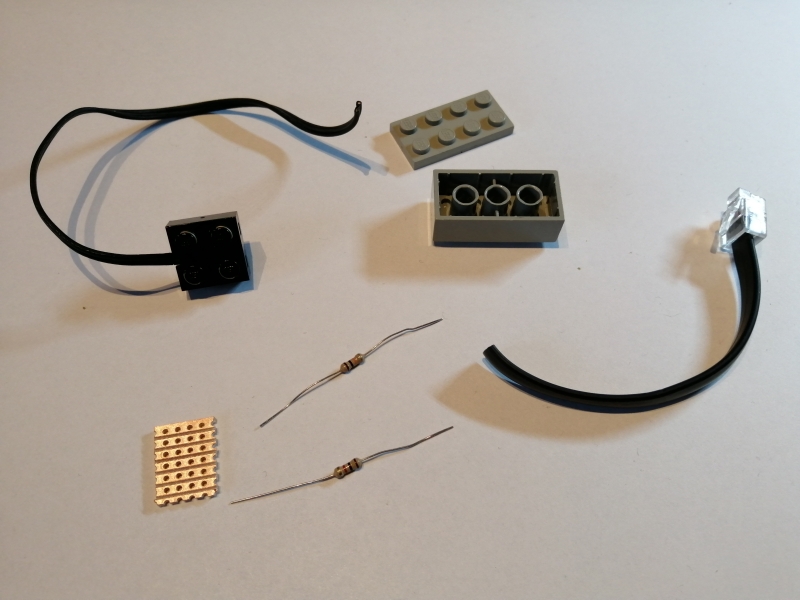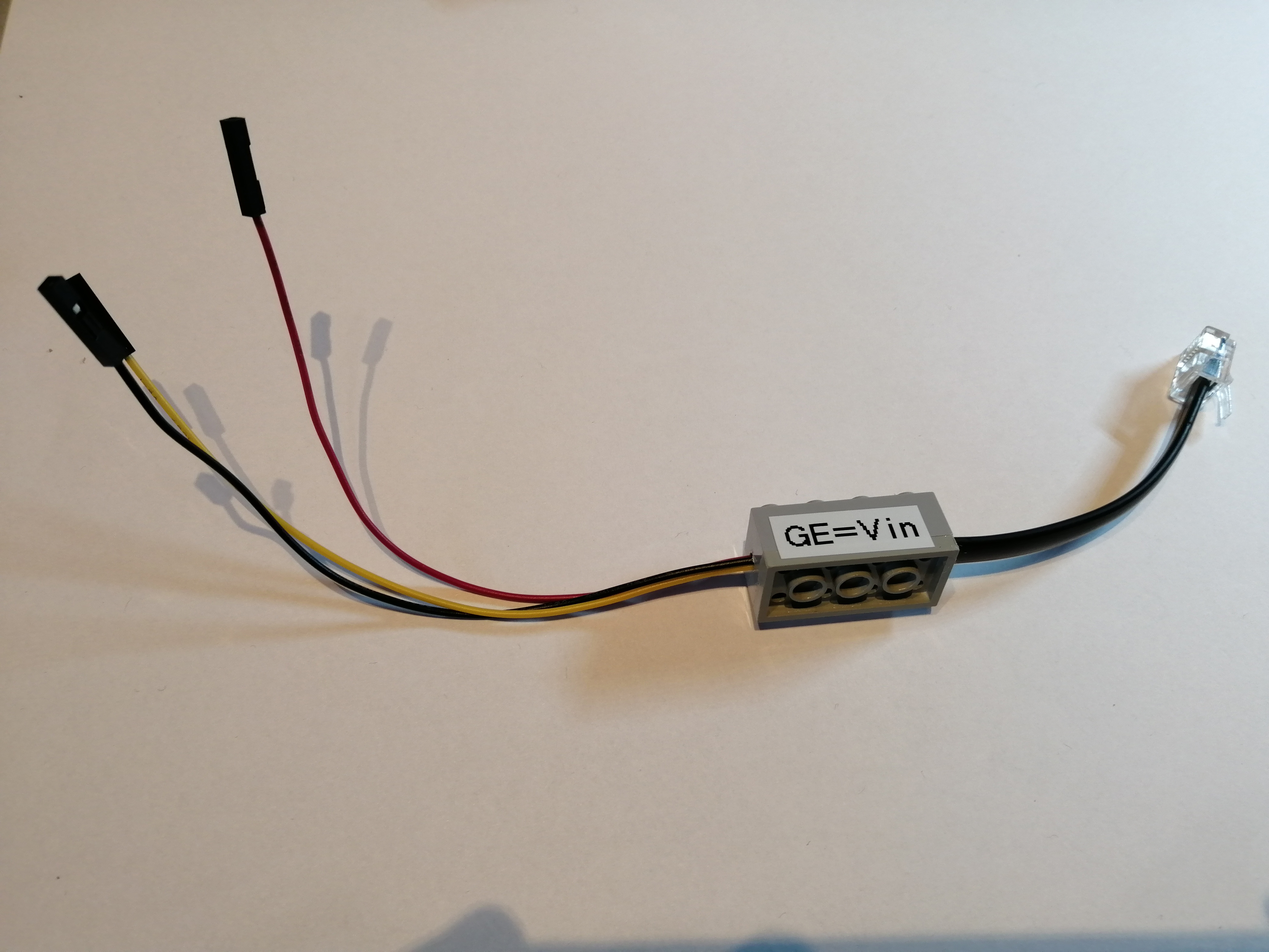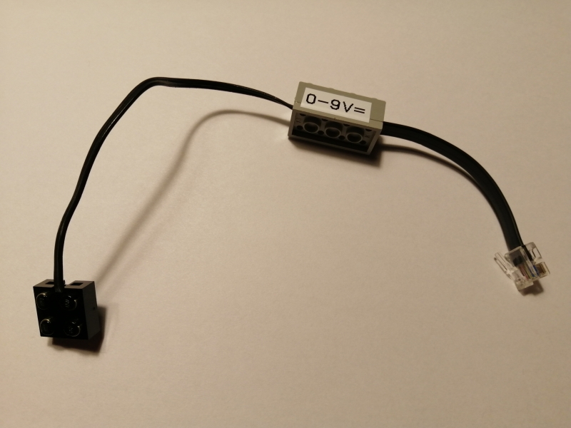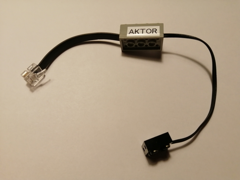 Ziel dieses Projekts war es, Adapterkabel sowohl für Sensoren als auch für Aktoren zu basteln. Hierfür wurde jeweils als verbindendes Element ein 4x2 Legostein genutzt, dessen Inneleben entfernt wurde. In diesem nun leeren Gehäuse wurde ein EV3-Originalkabel auf der einen und ein Anschlusskabel auf der anderen Seite hinausgeführt. Beide Kabel wurden im Gehäuse mittels einer kleinen Leiterbahnplatine miteinander verlötet. Zum Schluss wurde eine 4x2 Legoplatte von unten mit dem 4x2 Legostein fest verklebt.