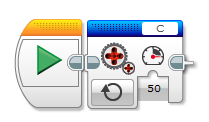 Die Motorports geben eine Gleichspannung von 0 bis 9 Volt aus. Möchte man diese regelbare Ausgangsspannung nutzen, müssen hier allerdings zwei Widerstände (1 Kiloohm und 10 Kiloohm) so verdrahtet werden, dass die LEGO® EV3-Einheit einen "NXT-Motor" erkennt. Auf diese Weise lassen sich beliebige Aktoren an die E3-Einheit anschließen: Motoren, LEDs, Lampen, Relais, usw. In der MINDSTORMS® Software wird der Block "Ungeregelter Motor" mit dem passenden Motorport (hier: Port C) verbunden, um über den Geschwindigkeitswert die Ausgangsspannung festzulegen.