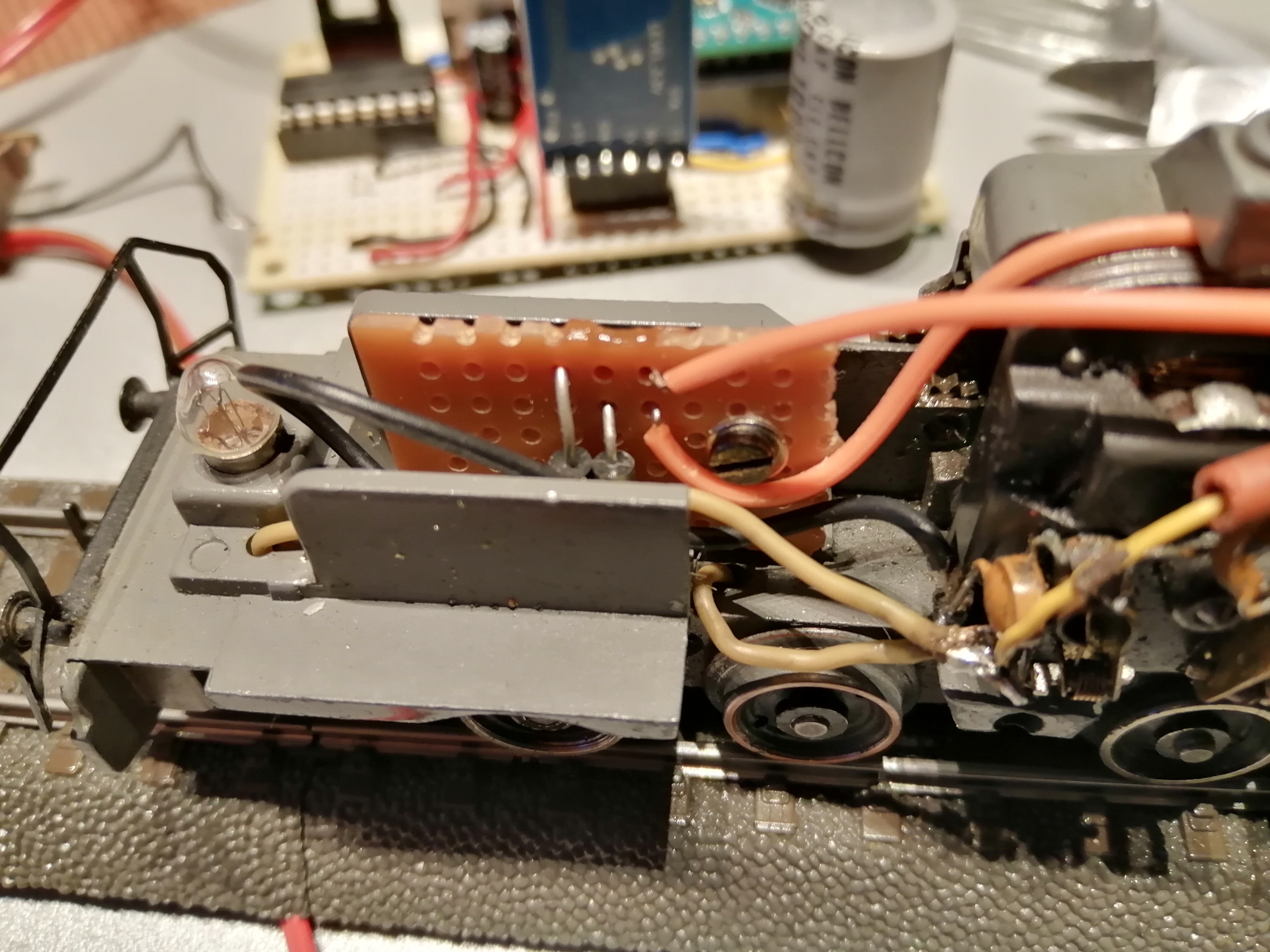 Die Märklin-Lokomotiven müssen für dieses Projekt zu Gleichstromlokomotiven umgerüstet werden, damit sie über einen Motortreiber (hier: L293D) angesteuert werden können. Dazu ist es zunächst notwendig, das für den Fahrtrichtungswechsel benötigte Stromstoßrelais auszubauen und durch eine kleine Platine zu ersetzen, auf der 2 Dioden verlötet sind: Beide Dioden sind mit umgekehrter Polarität so zu schalten, dass die eine Seite der Dioden jeweils mit einer der Motorspulen verbunden wird, während die andere Seite jeweils miteinander und mit Masse (= Schienen) verbunden wird. Der andere Motorkontakt wird mit dem Fahrstrom (= Mittelleiter) verbunden. Auf diese Weise wird bei einem Polaritätswechsel des Motortreibers immer die jeweils andere Motorspule mit Strom versorgt, was automatisch zu einem Fahrtrichtungswechsel führt. Die Regulierung der Geschwindigkeit wird mittels PWM-Signal seitens des Motortreibers realisiert.