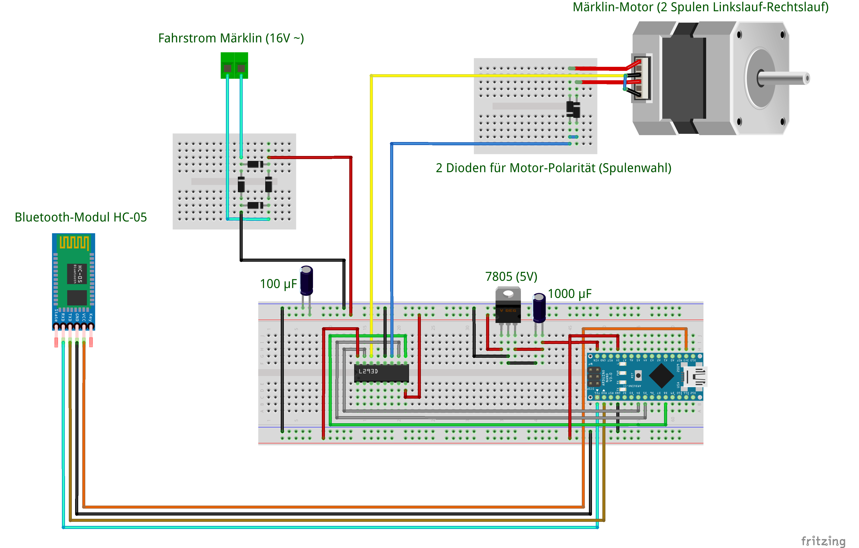 Um eine dauerhafte Verkabelung für viele Einsätze in der Schule und gleichzeitig eine stabile Stromversorgung zu gewährleisten, sollten die Breadboards durch fest verlötete Platinen mit gesockelten Arduino Nanos ersetzt werden. Der Anschluss eines Original Märklin-Trafos und die Verwendung eines Brückengleichrichters auf der Platine stellen sicher, dass die Polarität der externen Stromquelle nicht verwechselt werden kann, was bei Spannungen von bis zu 24V~ schnell zur Zerstörung der kompletten Schaltung inkl. Mikrocontroller führen kann. Darüber hinaus sieht eine gelötete Schaltung einfach ordentlicher aus.