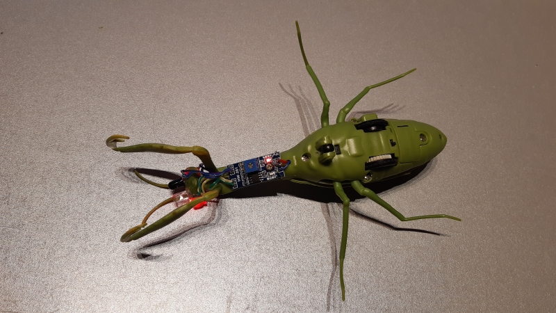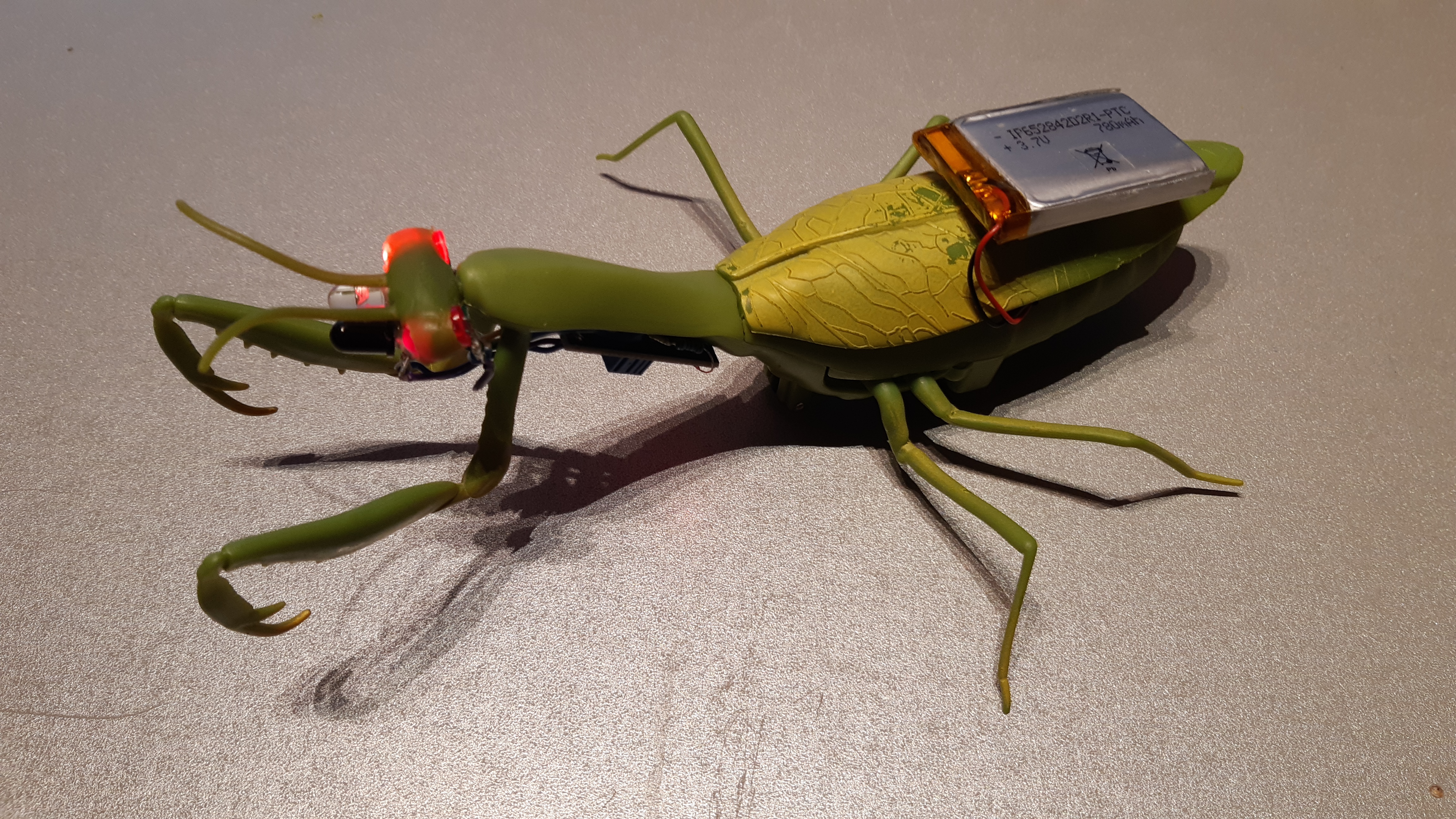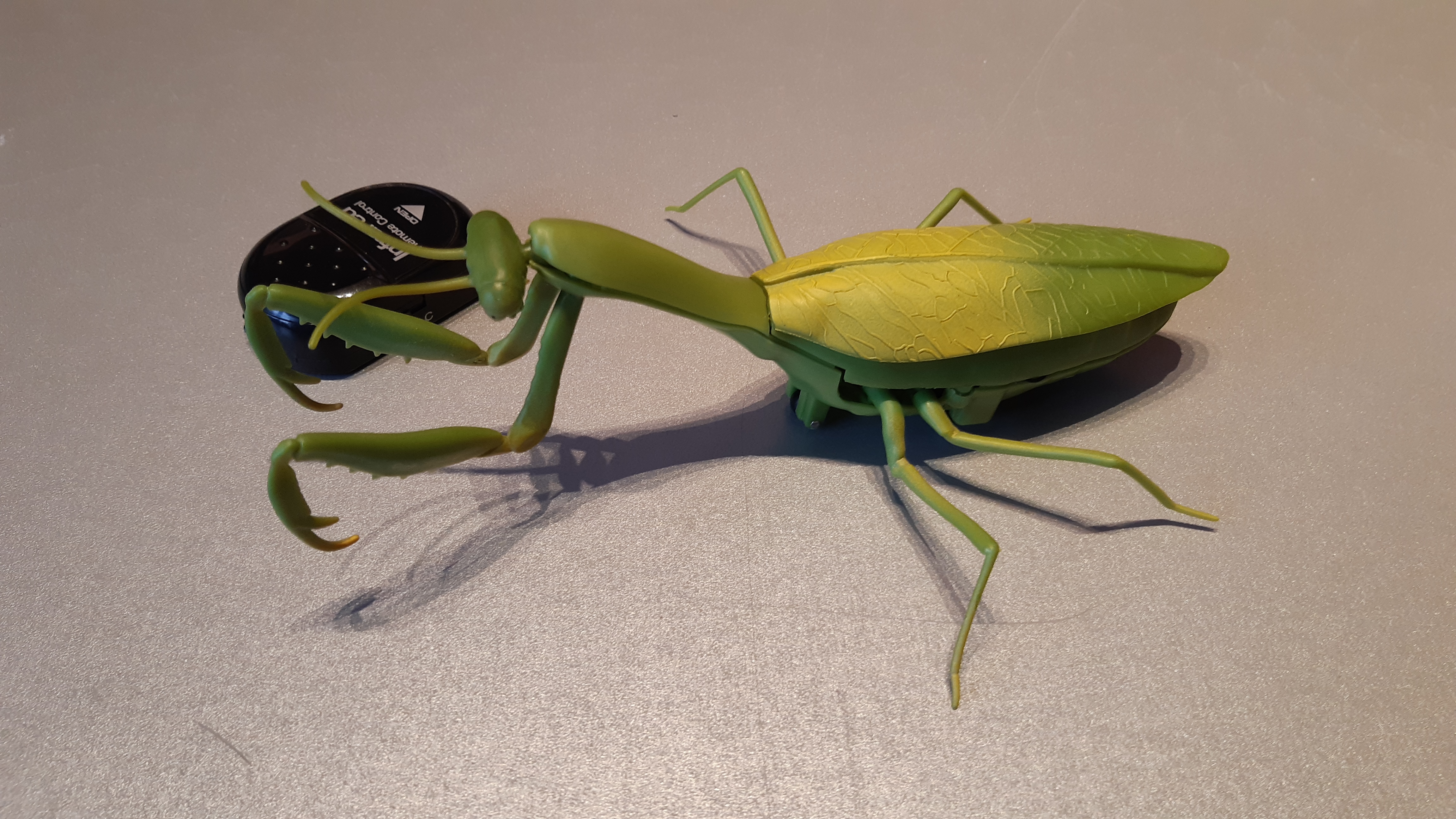 So entstand die Idee, eine bereits vorhandene Spielzeug-Mantis (oder Gottesanbeterin) mit Infrarot-Steuerung so umzubauen, dass sie später - ausgestattet mit Sensor, Motortreiber und Mikrocontroller - programmiert und autonom oder per Smartphone gesteuert werden kann: