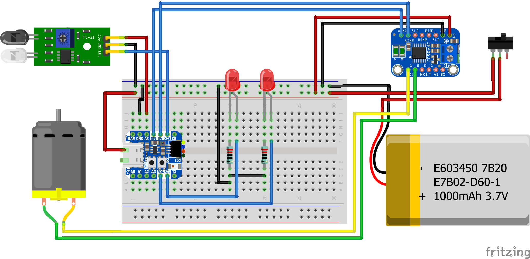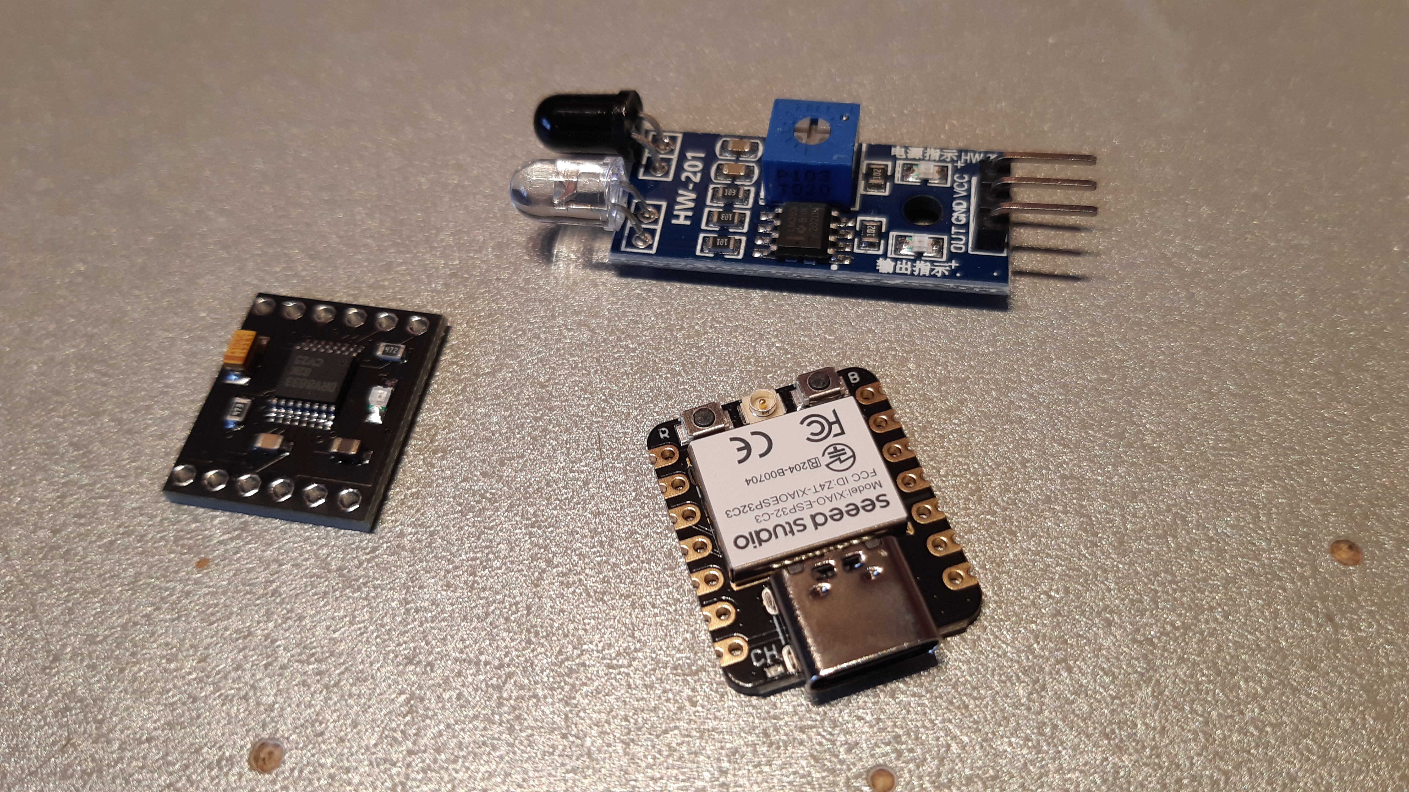 Aufgrund der geringen Abmessungen der Spielzeug-Mantis war schnell klar, dass die verwendeten Bauteile (Mikrocontroller, Motortreiber, IR-Sensor) möglichst klein sein mussten, um in oder an der Spielzeug-Mantis befestigt werden zu können. Daher fiel die Wahl auf den Mikrocontroller XIAO ESP32-C3 und eine kleine Motortreiberplatine DRV8833, während ein noch vorhandenes IR-Sensormodul HW-201 zum Einsatz kommen sollte: