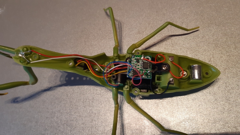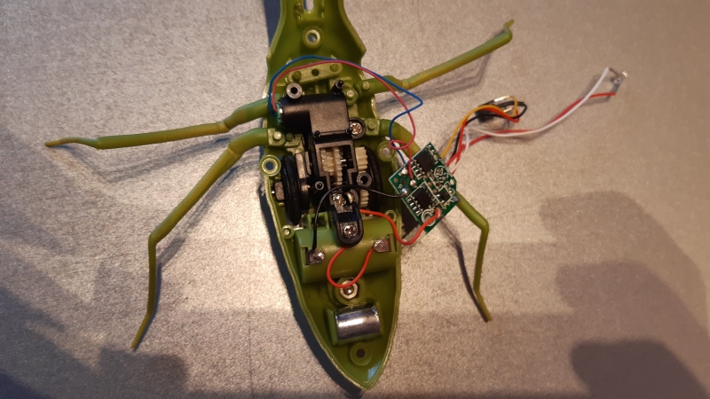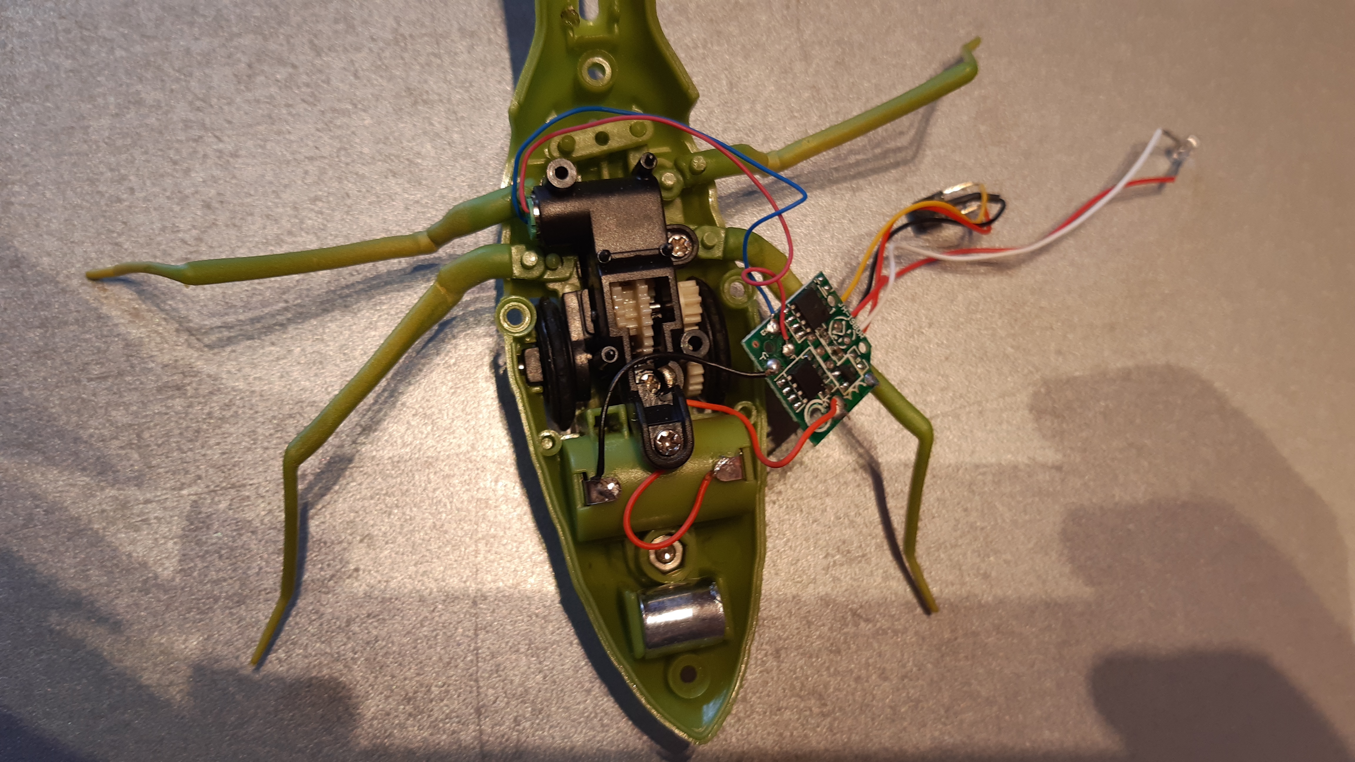 Zunächst wurde die Steuerplatine sowie eine vorhandene Blink-LED aus der Spielzeug-Mantis entfernt, wobei die Anschlusskabel für Motor und Batteriestrom wiederverwendet werden sollten: