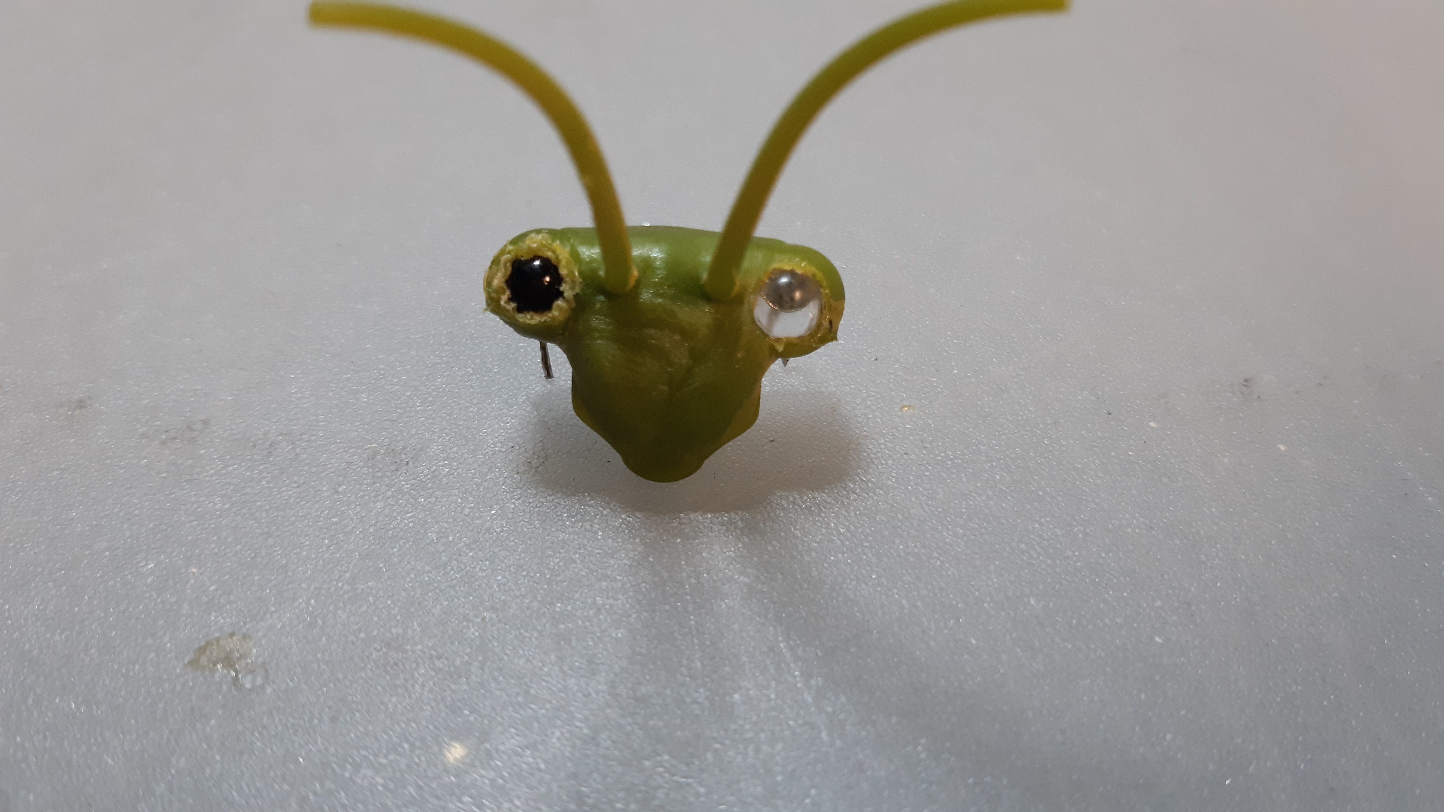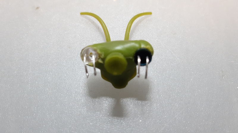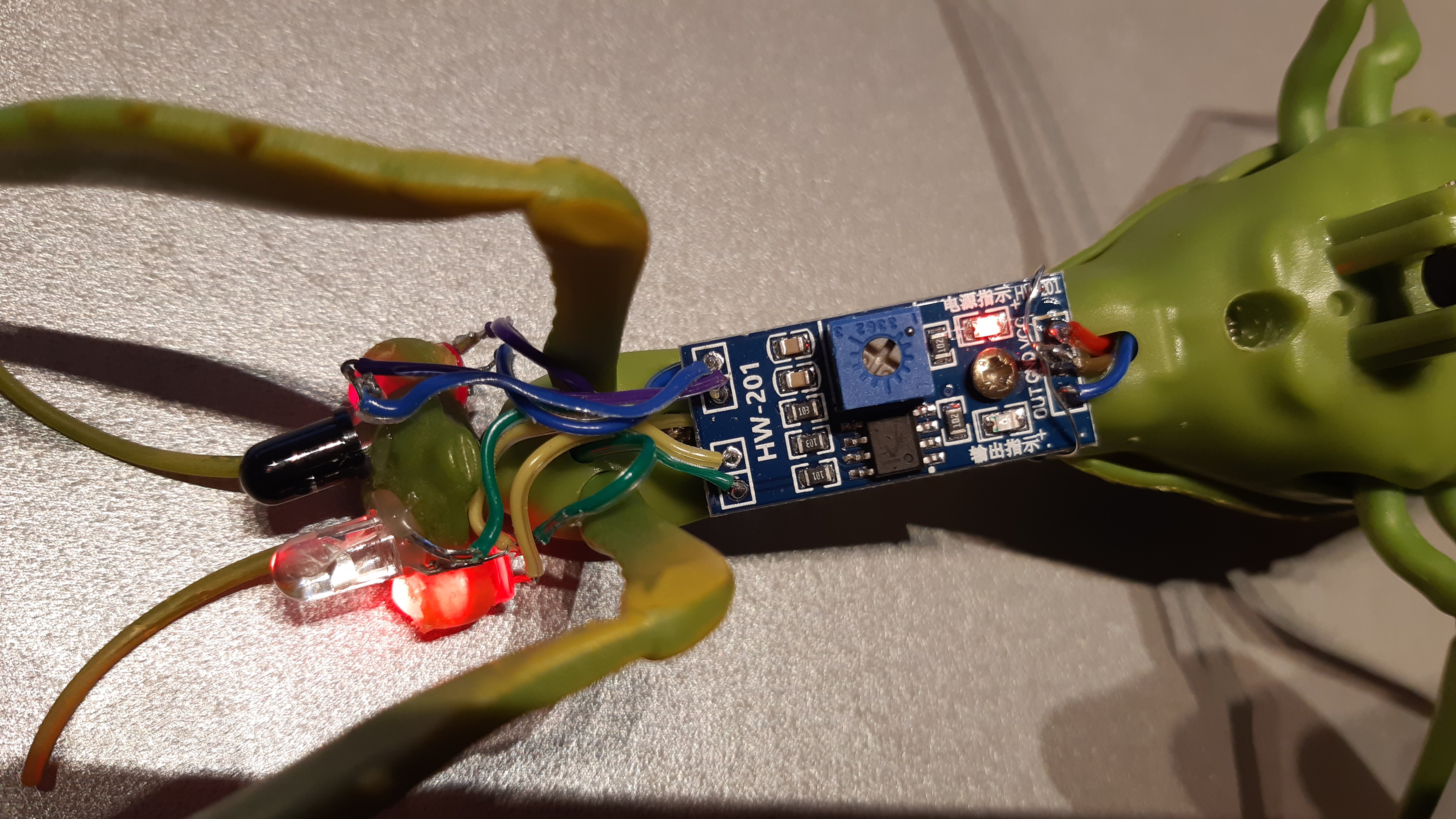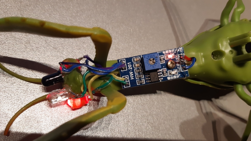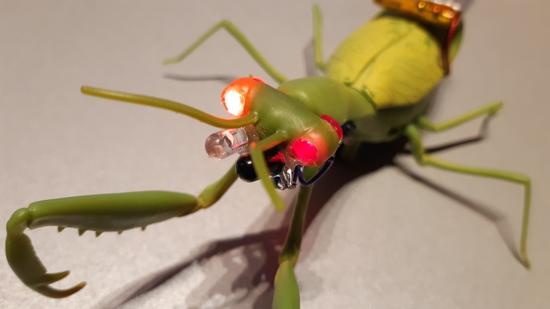 Leider funktionierte das IR-Modul mit den nun weit auseinanderstehenden Infrarot-LEDs nicht, sodass diese vorne im richtigen Abstand voneinander an den Kopf der Spielzeug-Mantis geklebt werden mussten. Das IR-Modul selbst wurde unterhalb des verlängerten Thorax' (Brustbereich) der Spielzeug-Mantis montiert. Um die nun entstandenen "Löcher" in den Facettenaugen der Spielzeug-Mantis zu füllen, wurden an Stelle der Infrarot-LEDs 2 rote LEDs als "Augen" dort platziert, die über den Mikrocontroller getrennt voneinander programmiert werden können: