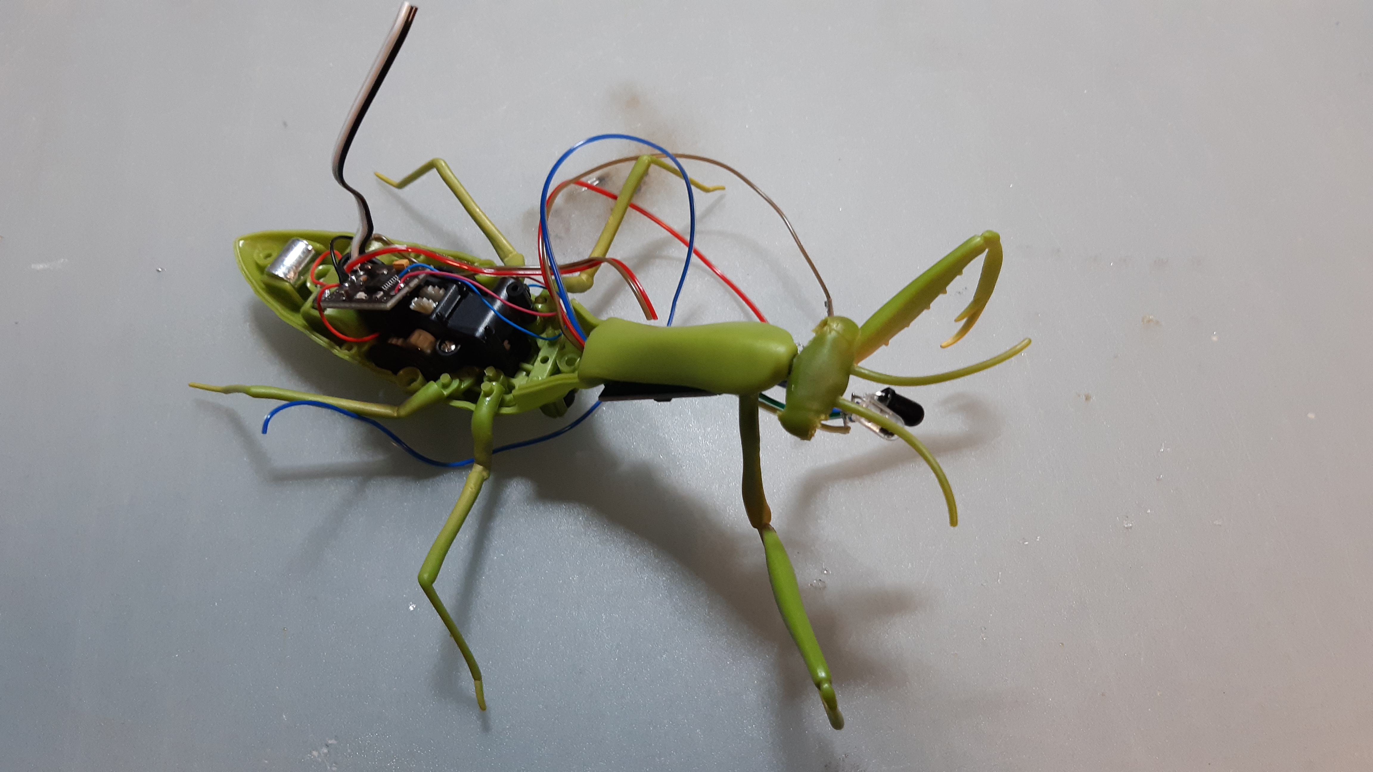 Die geringen Abmessungen der Spielzeug-Mantis machten die Auswahl entsprechend kleiner Komponenten notwendig, auch konnte hier keine komfortable Streifenrasterplatinen-Lösung für die Verkabelung aller elektronischen Bauteile verwendet werden. Stattdessen musssten alle Kabelverbindungen ohne Buchsen oder Stecker direkt an den Mikrocontroller, die Sensoren und Aktoren gelötet werden, was mit deutlich mehr Aufwand verbunden ist und überdies die Gefahr von irreversiblen Schäden an den Komponenten erhöht.