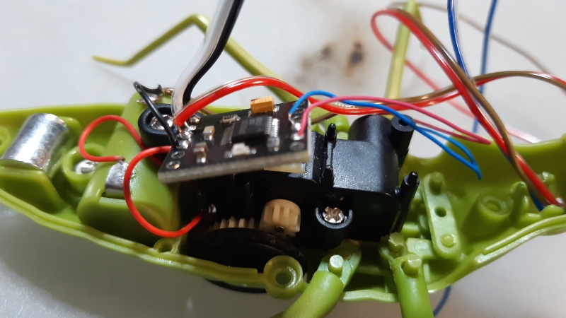 Anschließend wurde das Motortreiber-Modul an die Stelle innerhalb der Spielzeug-Mantis befestigt, wo vorher die Steuerplatine montiert war, da deren Größe nahezu identisch ist: