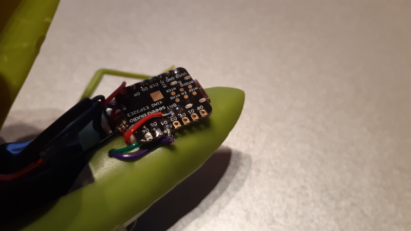 Der Mikrocontroller XIAO ESP32-C3 passte trotz seiner geringen Abmessungen zwar nicht mehr in den Körper der Spielzeug-Mantis, konnte aber - gut verdeckt durch die "Flügeldecken" - auf den Hinterleib der Spielzeug-Mantis geklebt werden. Auch die steckbare BT/WLAN-Antenne des Mikrocontrollers wurde unter den "Flügeldecken" auf den Hinterleib geklebt. Zwischen Antenne und Mikrocontroller wurden durch entsprechende Bohrungen alle benötigten Kabel vom Mikrocontroller in das Innere der Spielzeug-Mantis geführt: