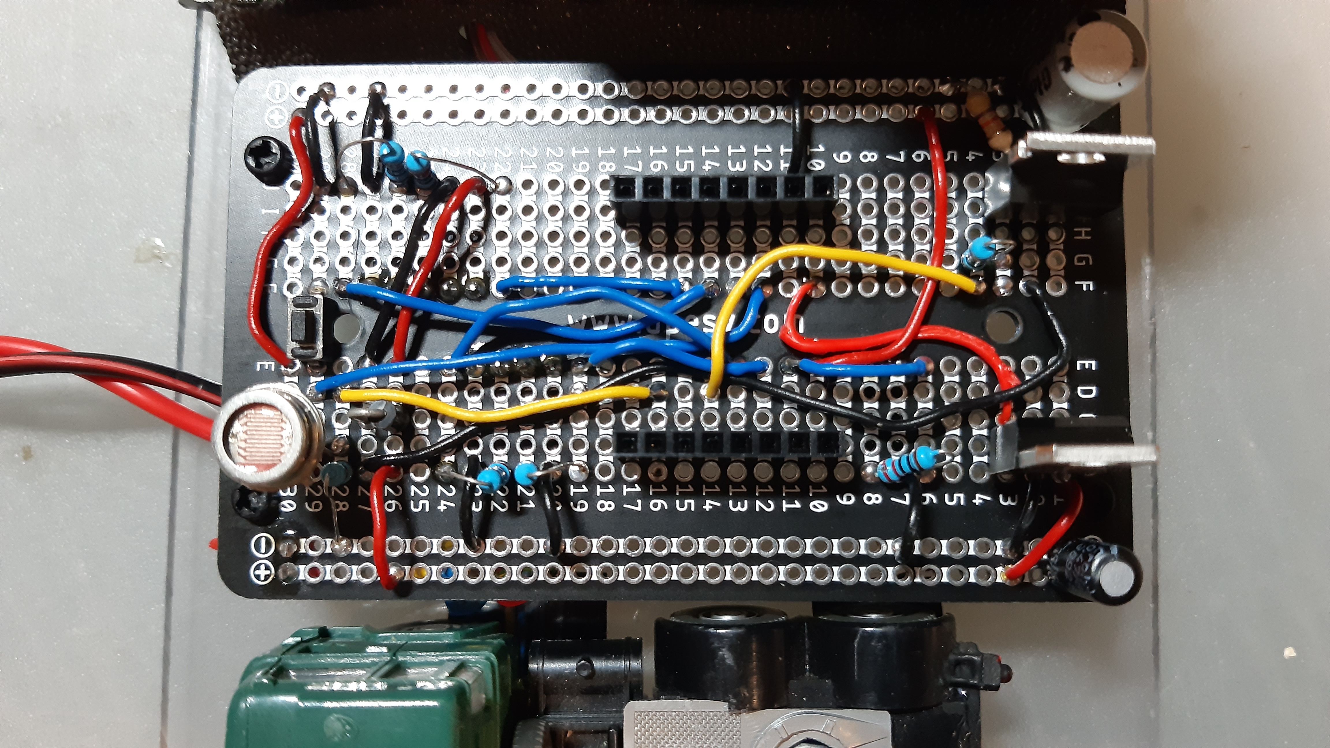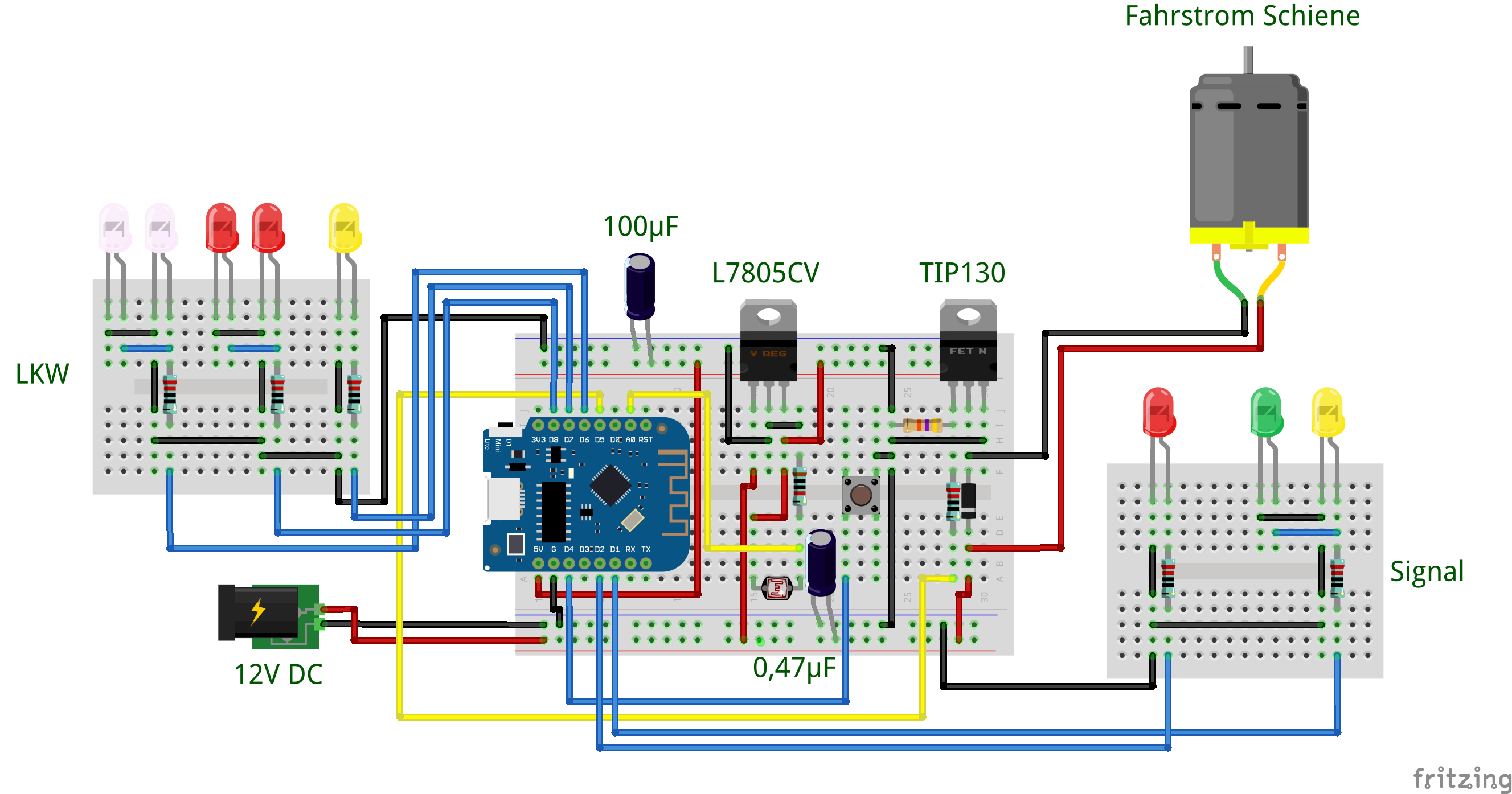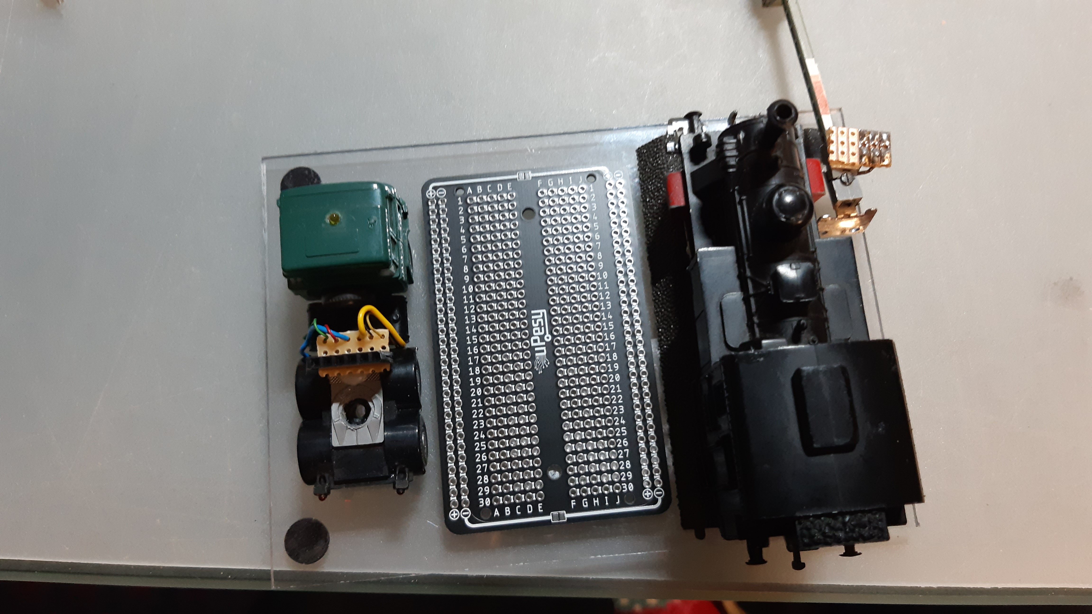 So entstand die Idee, grundlegende Modellbahnkomponenten auf eine DIN A6 große Fläche zu montieren und so wichtige Funktionen beispielhaft zu simulieren: Zugfahrt, Signalschaltung und Autobeleuchtung inkl. Tag-/Nachtschaltung. Die dafür benötigten Komponenten standen aus einem Nachlass zur Verfügung, hinzu kamen noch der Mikrocontroller sowie die benötigten elektronischen Bauteile: