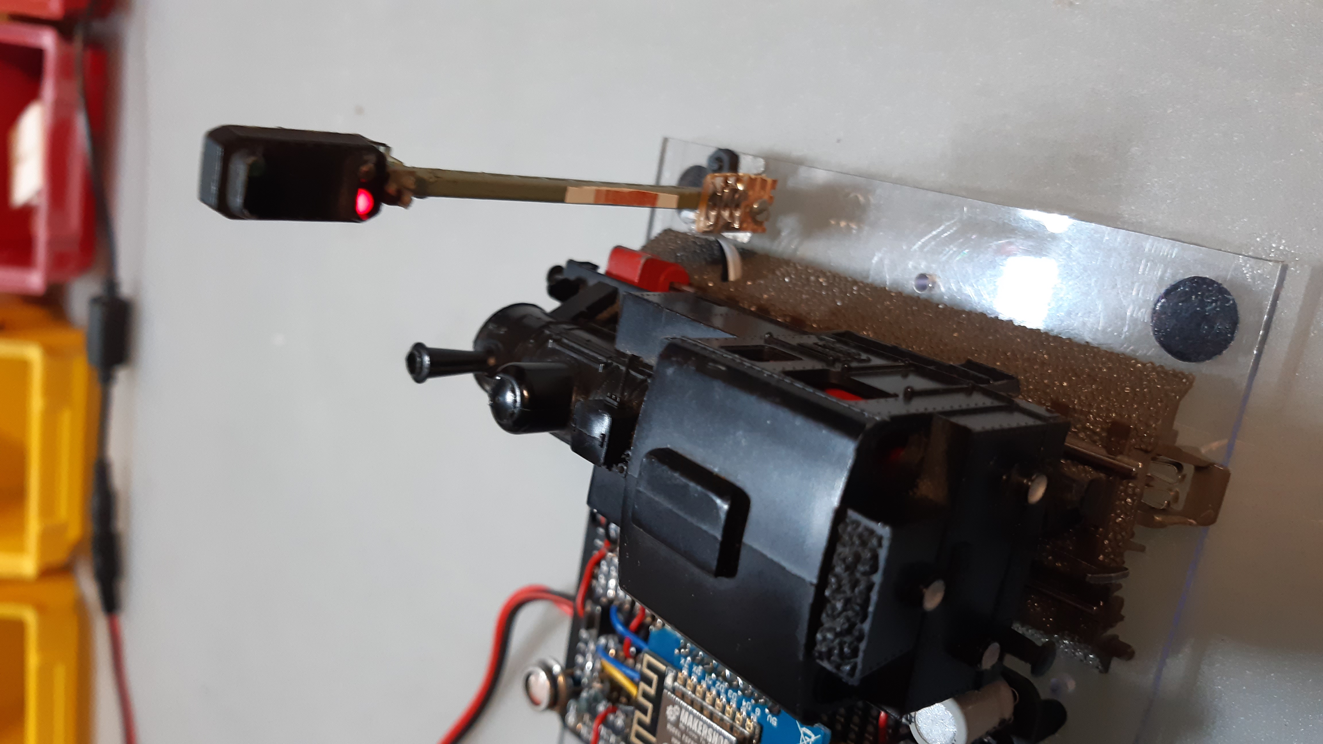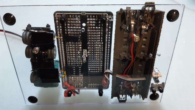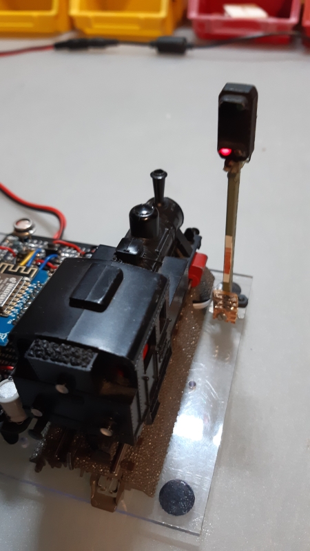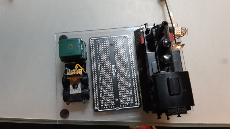 Für den Bereich "Zugfahrt/Signalschaltung" wurden das Märklin C-Gleis sowie das Licht-Einfahrtsignal passend auf die Plexiglasscheibe montiert und mit Kabelverbindungen und Buchsen für den Fahrstrom (C-Gleis) und die Signal-LEDs mit der Streifenrasterplatine verbunden. Da der Fahrstrom nur über einen MOSFET geregelt wird, ist hier nur eine Fahrtrichtung realisierbar (das Umschalten der Fahrtrichtung würde bei ca. 24V erfolgen, worauf hier aber zugunsten eines 12V-Netzteils verzichtet wurde). Trotz des Wechselstromantriebs lassen sich analoge Märklin-Lokomotiven grundsätzlich auch mit Gleichstrom betreiben, wobei die Lokomotive hier mittels eines Kunststoff-Abstandshalters, der auf das Gleis montiert wurde, "aufgebockt" werden kann, um den Fahrbetrieb simulieren zu können: