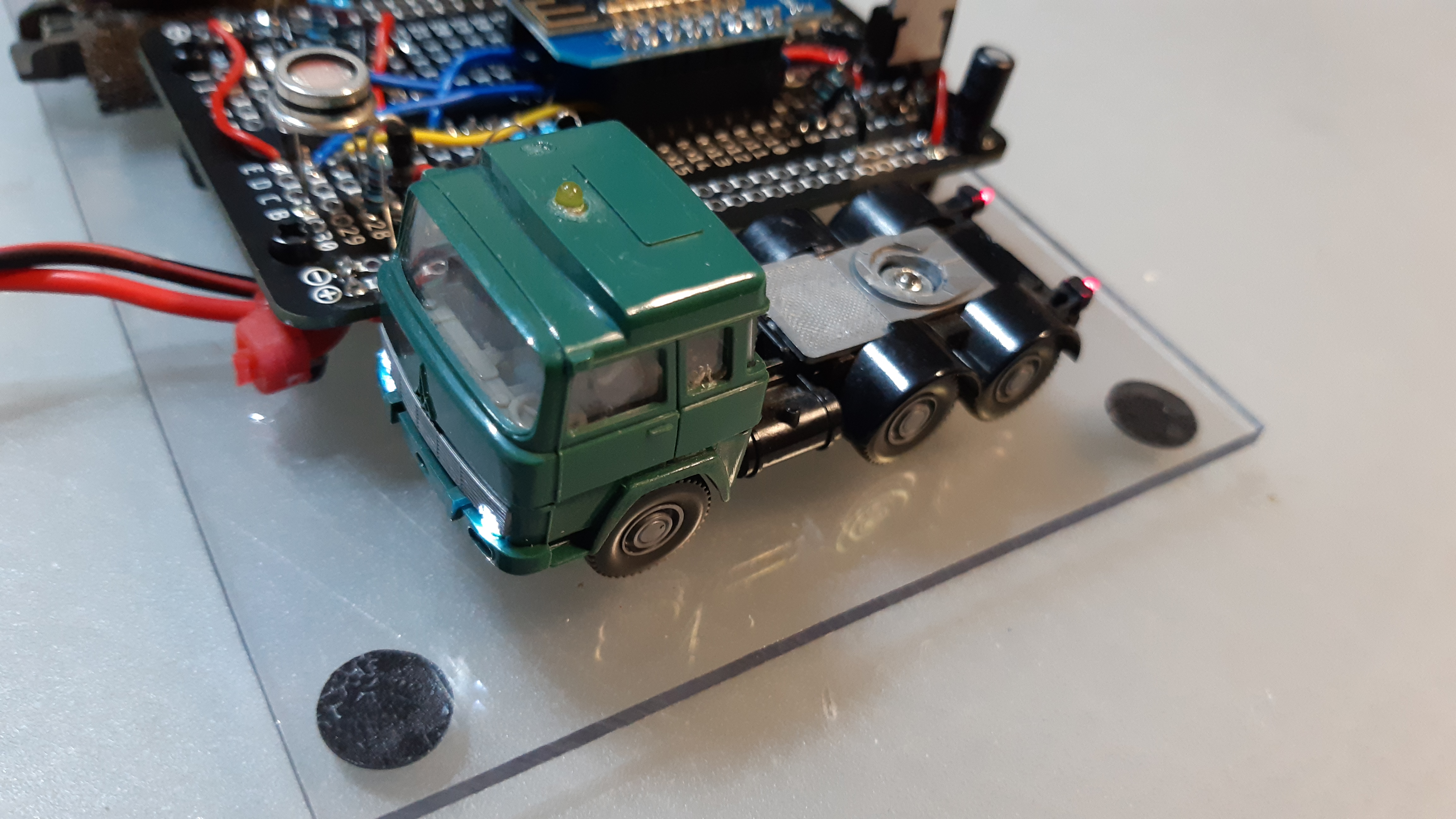 Für den Bereich "Autobeleuchtung" wurde der Magirus-Deutz LKW mittels Schraubverbindung auf die Plexiglasscheibemontiert, wobei die LED-Anschlusskabel über entsprechende Bohrungen in der Plexiglasscheibe mit Kabelverbindungen und Buchsen mit der Streifenrasterplatine verbunden wurden. Die Verdrahtung im LKW-Gehäuse koppelt dabei sowohl beide Frontscheinwerfer-LEDs (weiß) als auch beide Rücklicht-LEDs (rot), während die Sirene (gelb) einzeln anzusteuern ist: