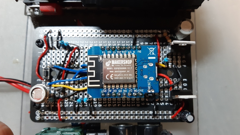 Die komplette Elektronik inkl. Mikrocontroller sollte auf der Streifenrasterplatine im Breadboard-Layout untergebracht werden. Dabei sollte der WEMOS D1 mini gesockelt werden, während auf der Unterseite der Platine abgewinkelte Steckerleisten für die Bereiche "Zugfahrt/Signalschaltung" und "Autobeleuchtung" montiert wurden: