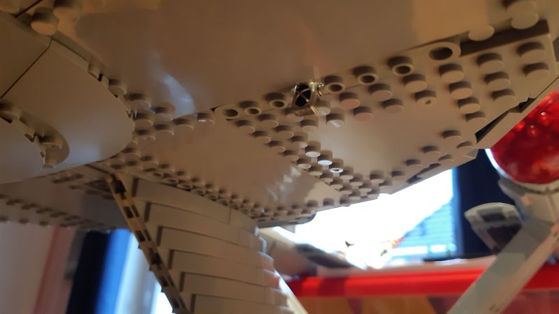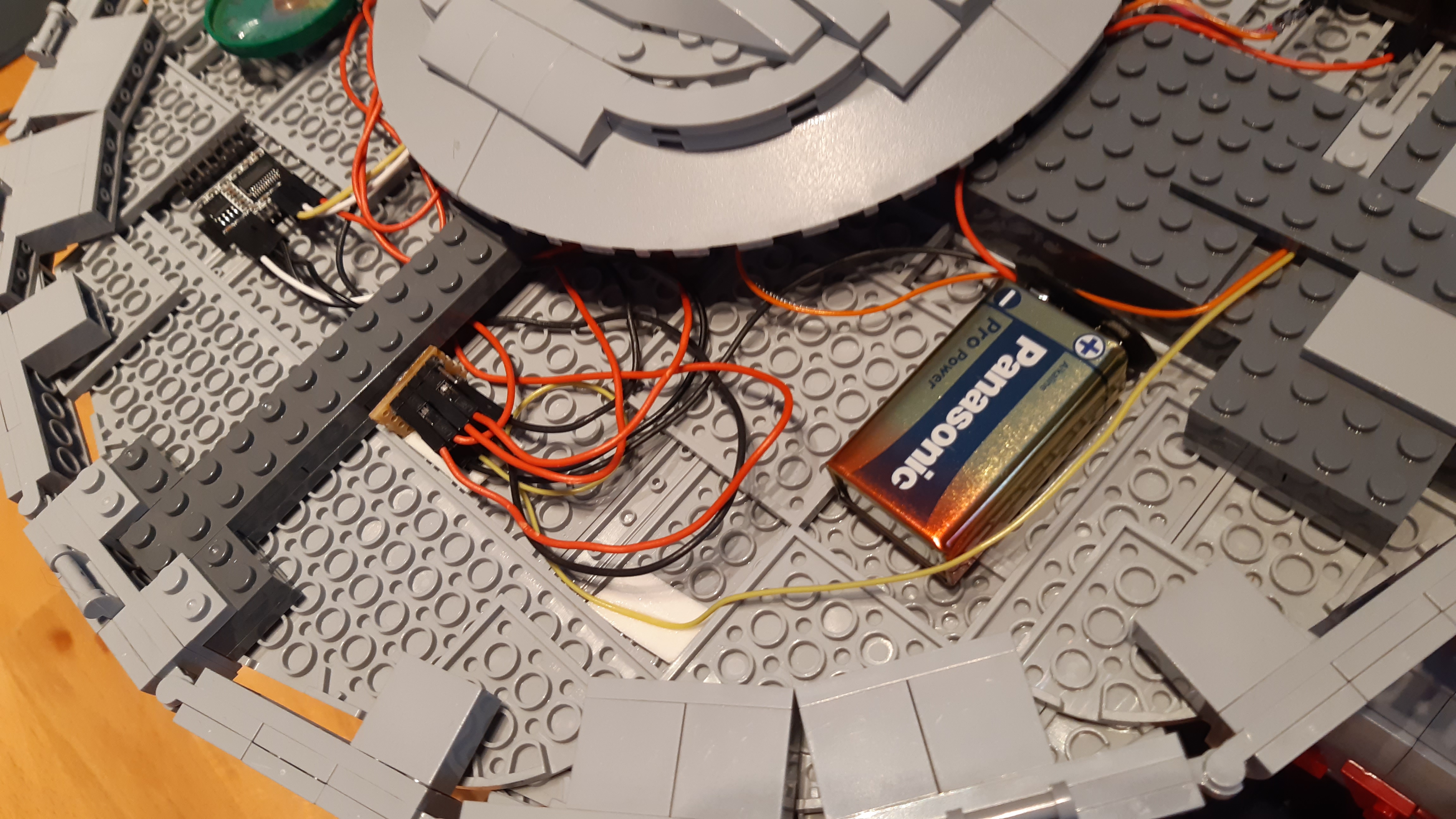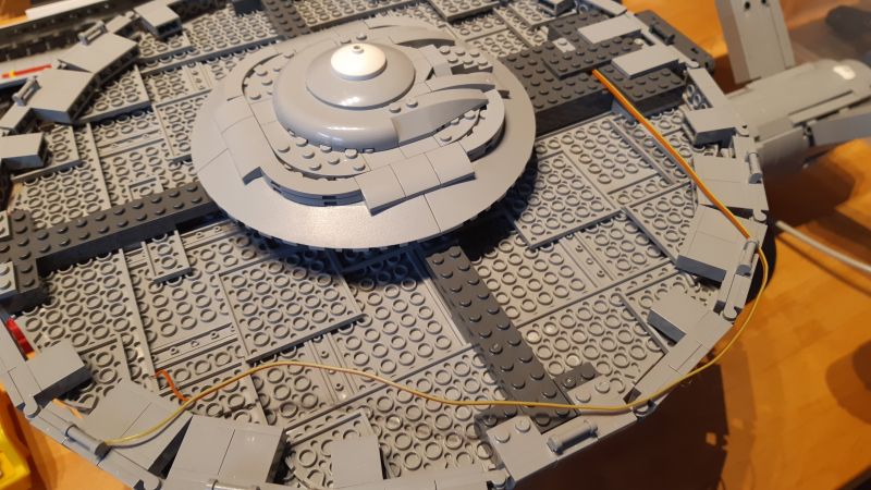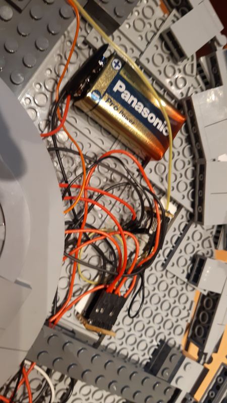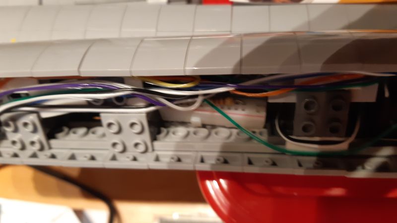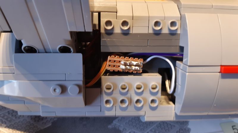 Schwieriger gestatltete sich die Kabelführung in der Verbindung zwischen Machinen- und Untertassensektion: Hier mussten aus dem Verbindungssteg einzelne Klemmbausteine so entfernt werden, dass die Stabilität gewährleistet und etwaige "Löcher" von außen nicht zu sehen waren. Da dieser Bereich 3-lagig ist, gelang dies durch Entfernung einiger Klemmbausteine aus der mittleren Lage. In der Maschinensektion selbst mussten auch etliche Klemmbausteine entfernt bzw. umgebaut werden, um das Kabel aus der Untertassensektion schließlich mit den beiden Kabeln aus den Warp-Gondeln zusammenzuführen. Hierzu wurden alle Kabel aus Gründen der Verbindungszuverlässigkeit auf eine winzige Streifenrasterplatine gelötet.
