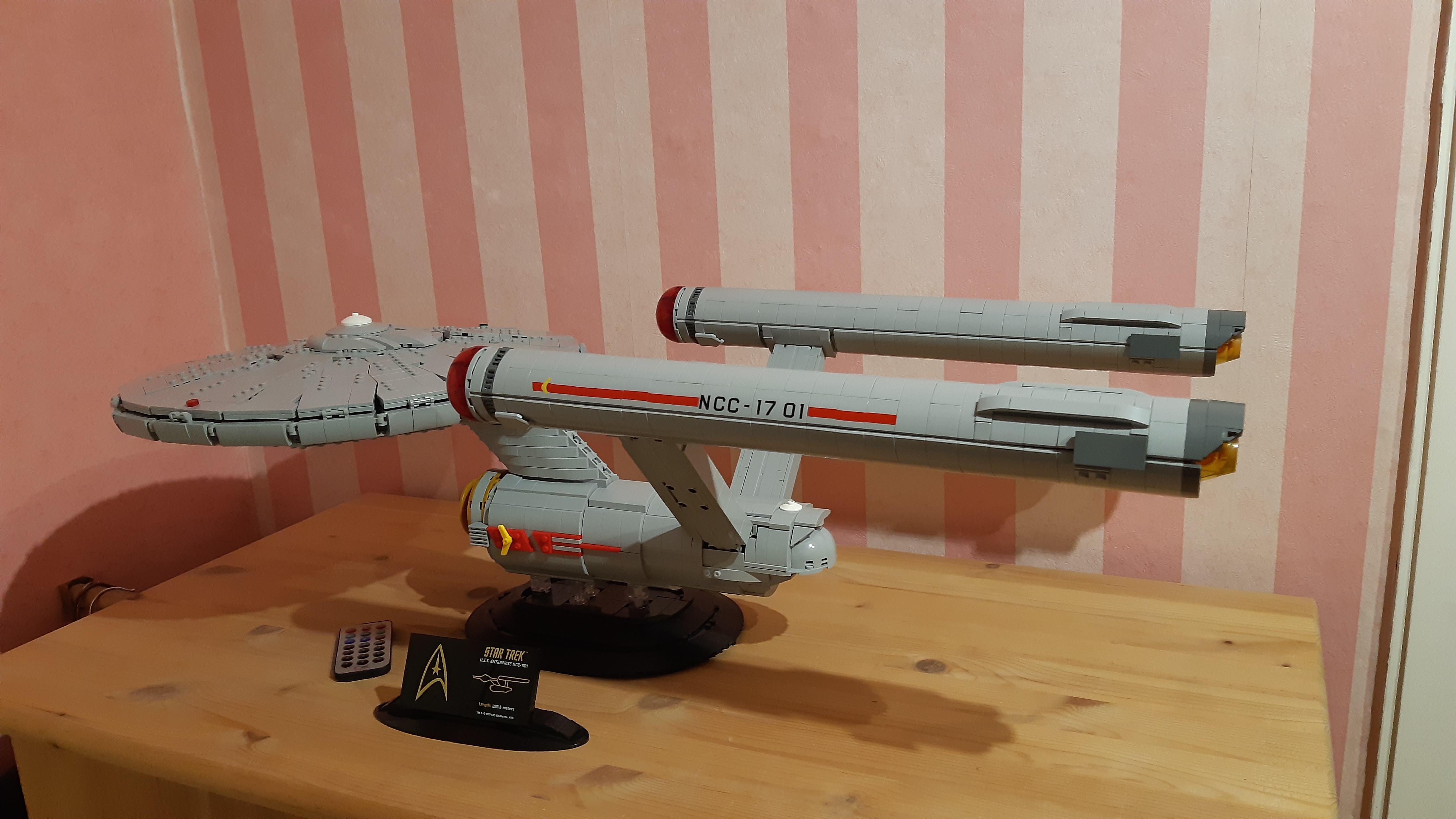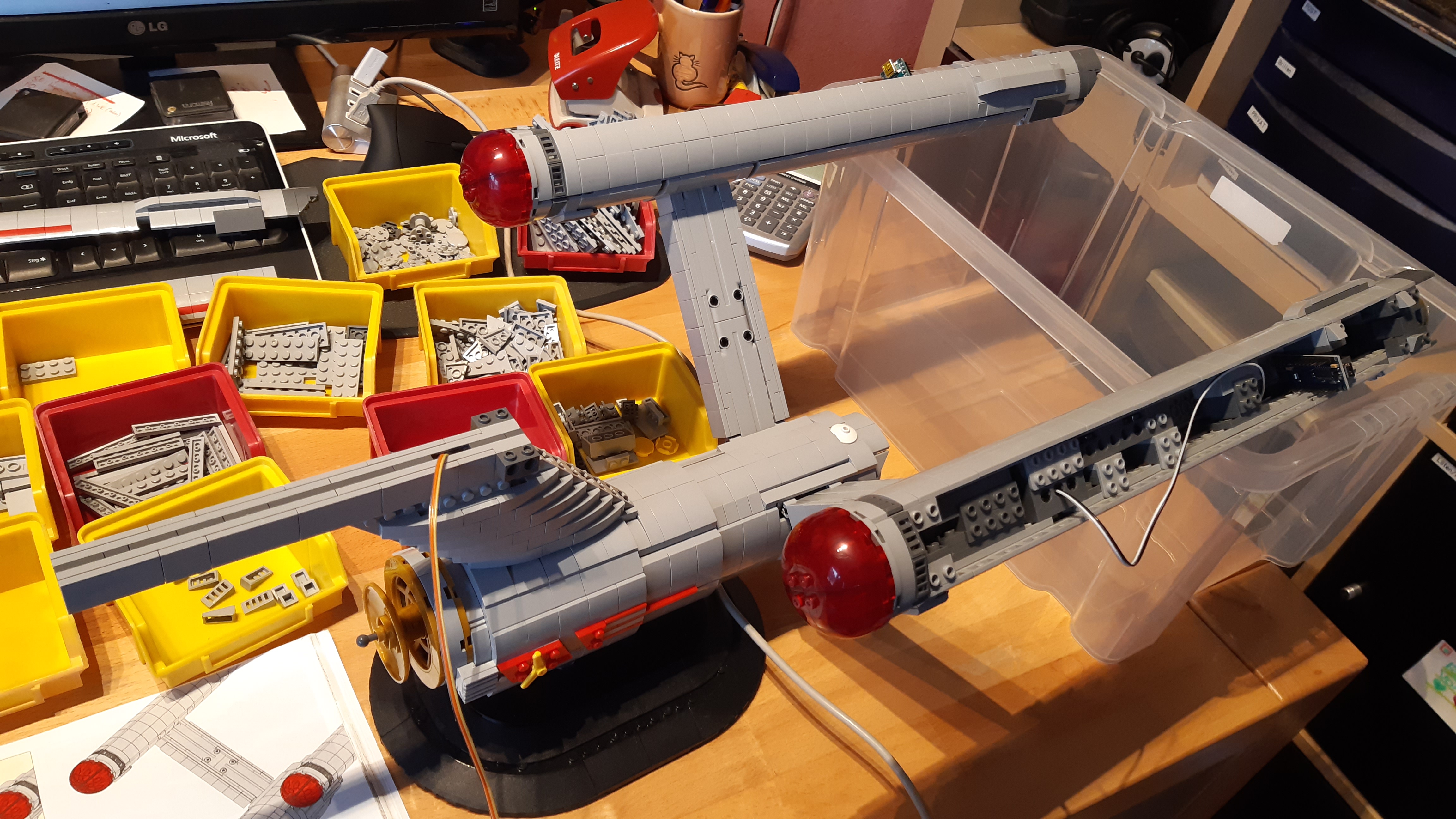 Während der ersten Bauphase musste darauf geachtet werden, dass ein zweiadriges (Strom-)Kabel von der Maschinensektion in die beiden Warp-Gondeln sowie in die Untertassensektion geführt wurde. Da die beiden Gondelpylone innen hohl sind und mittels Technik-Verbindern an die Maschinensektion sowie die Warp-Gondel befestigt werden, konnte das Kabel hier problemlos durch die Gondelpylone und auch durch die innen hohlen Technik-Verbinder gezogen werden.