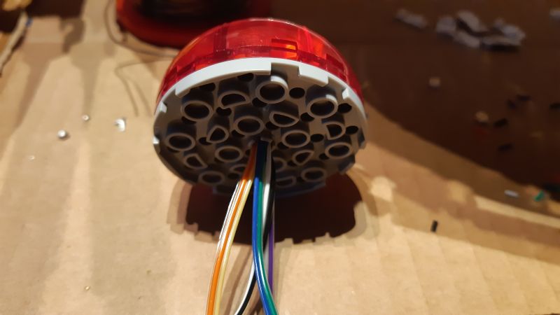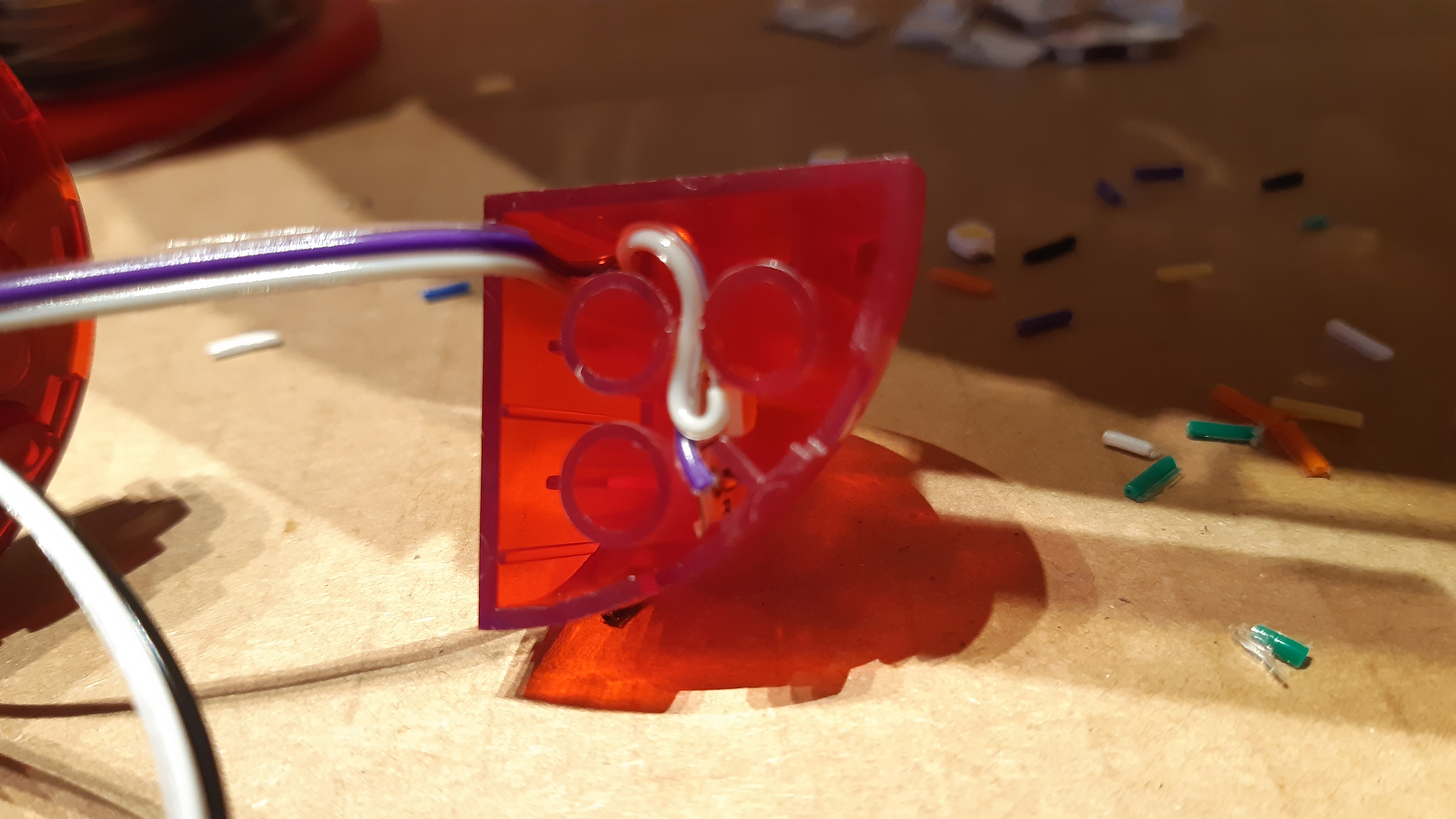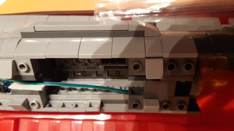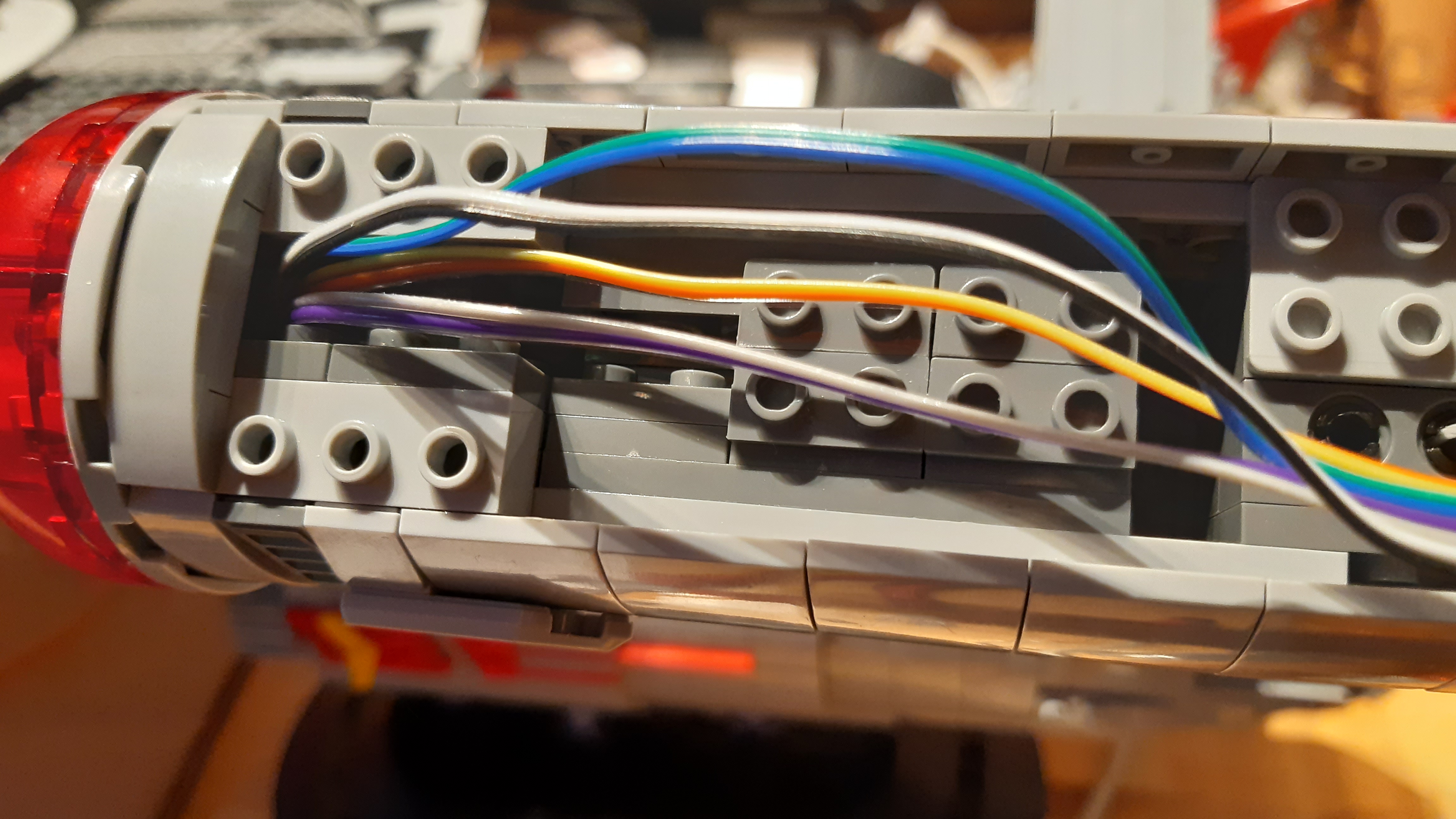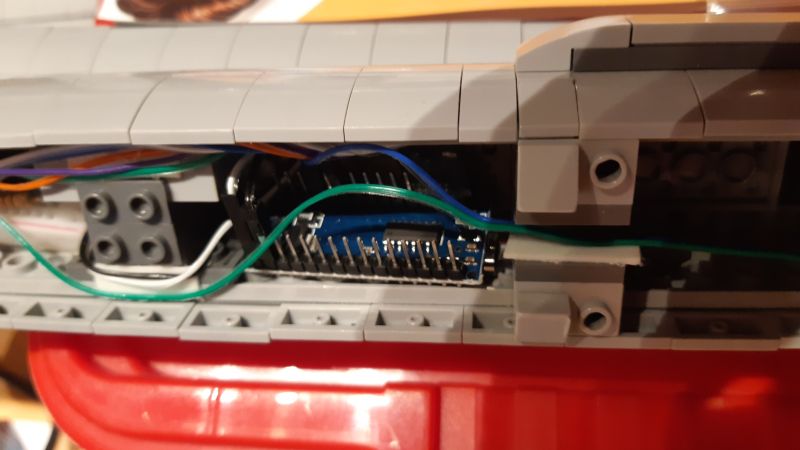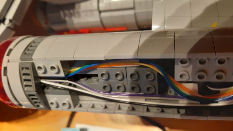 Eine besondere Herausforderung war die Vorderseite der Warp-Gondeln, die aus vier durchsichtig-roten, viertelkreisrunden Klemmbausteinen besteht: Da aufgelötete SMD-LEDs samt Vorwiderstand auf einem LED-Streifen zur Verfügung standen, wurden an jeden dieser LED-Streifen zwei Verbindungskabel angelötet und die LED-Streifen anschließend in die Klemmbausteine gesteckt.