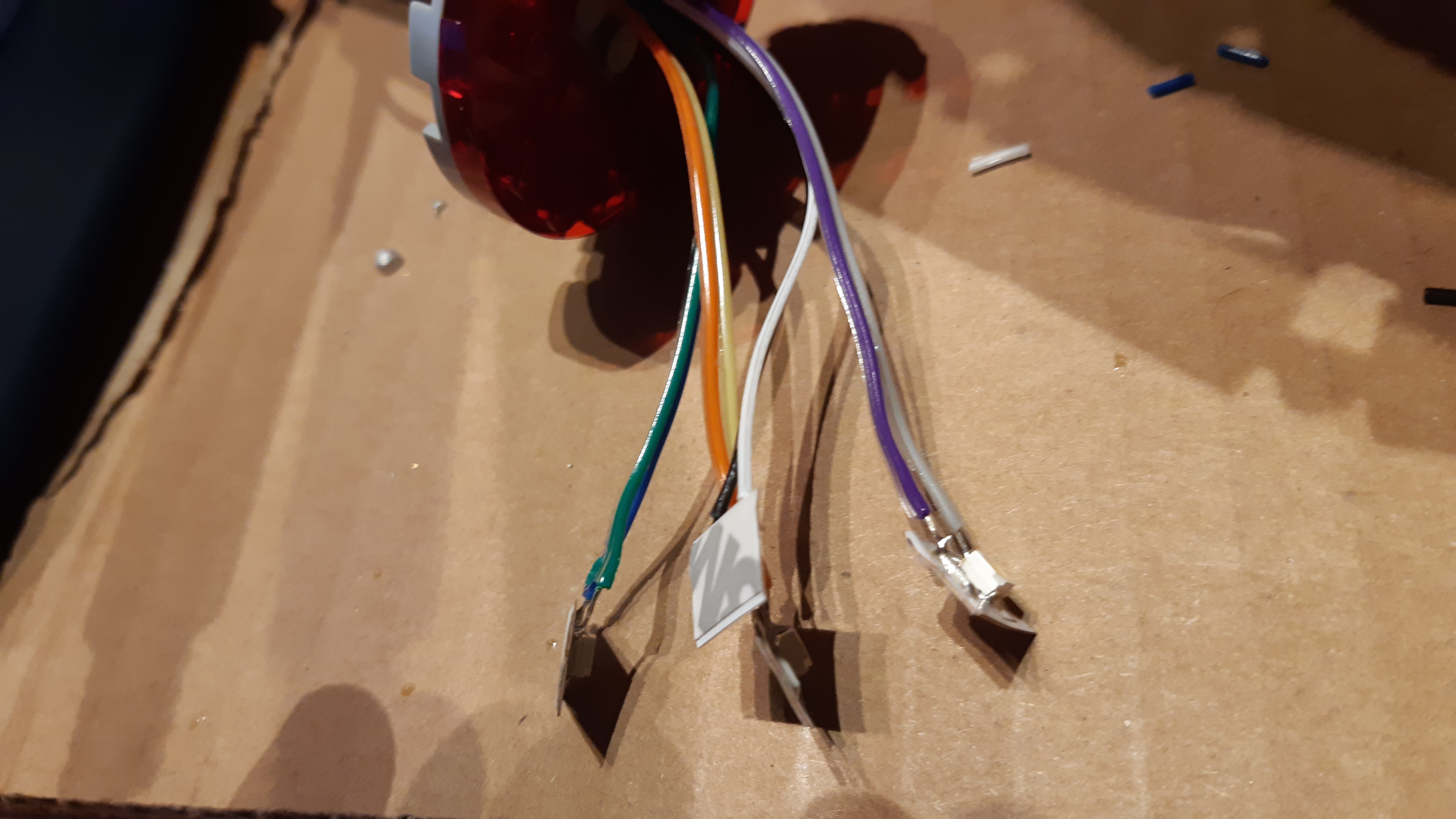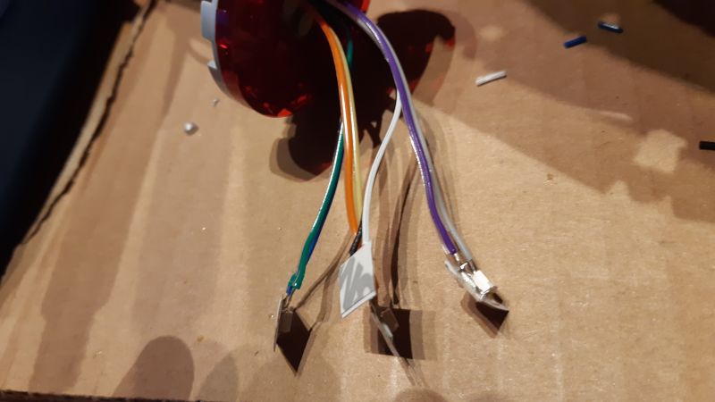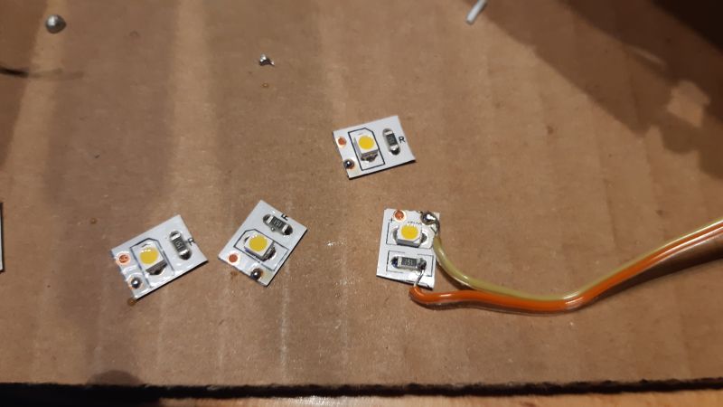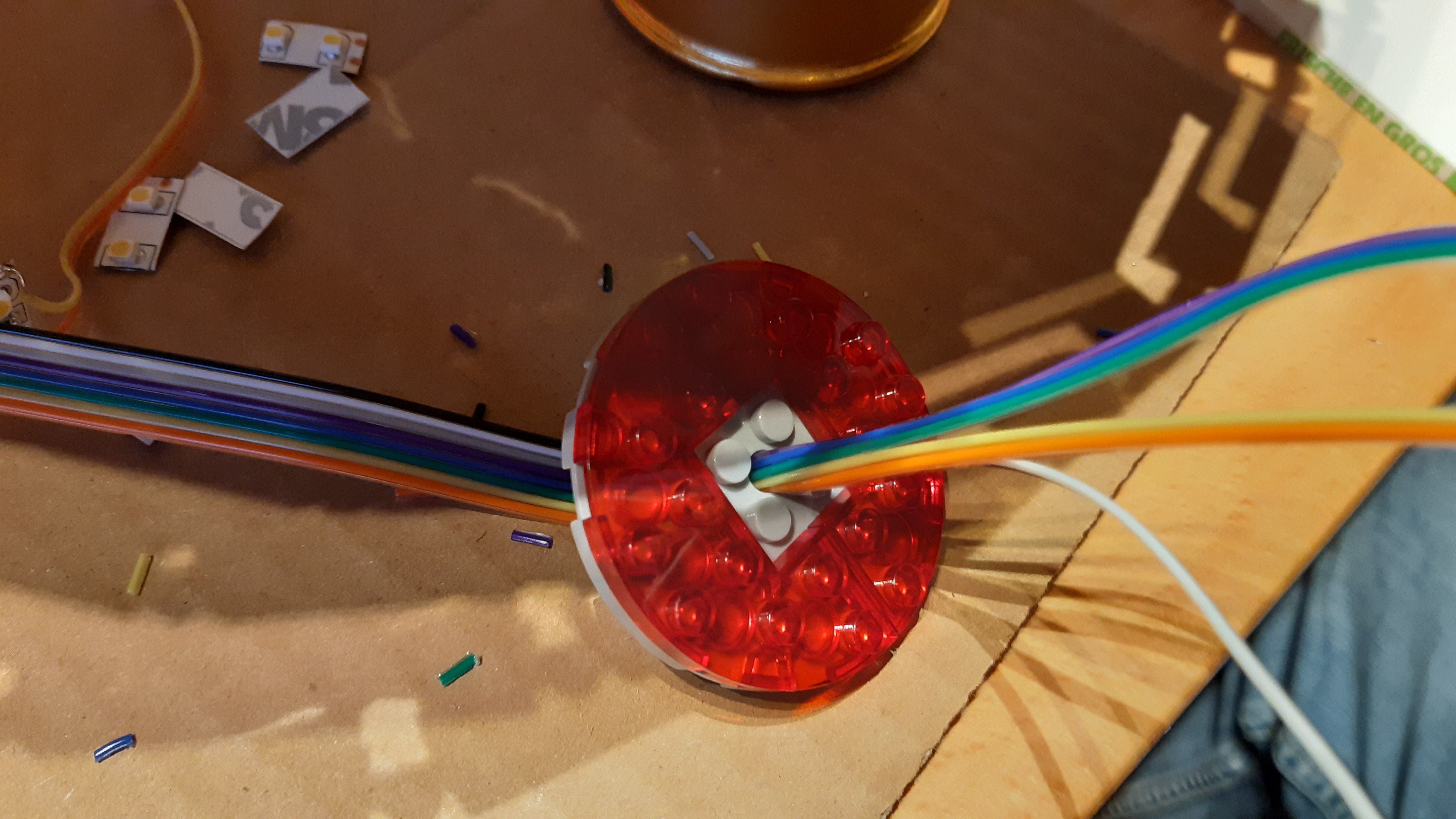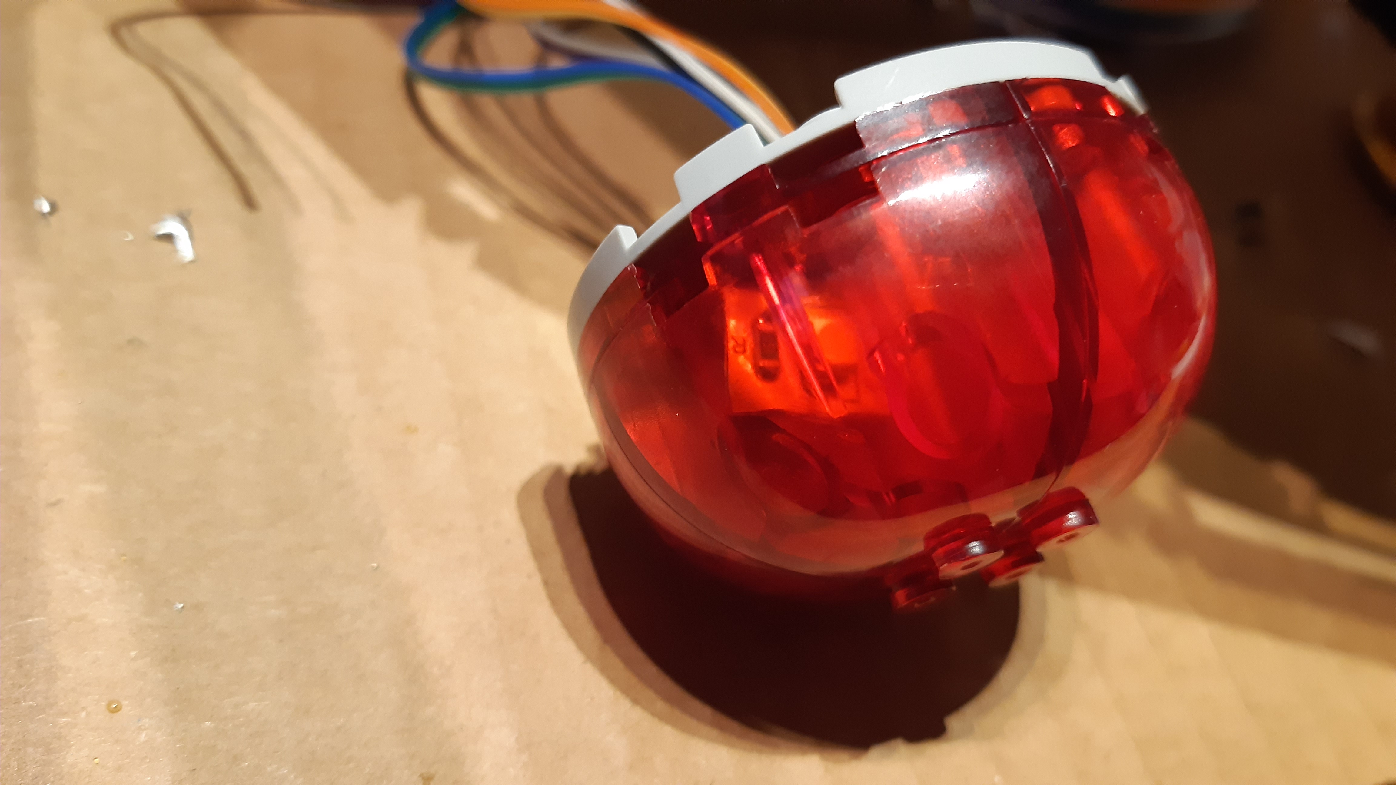 Eine besondere Herausforderung war die Vorderseite der Warp-Gondeln, die aus vier durchsichtig-roten, viertelkreisrunden Klemmbausteinen besteht: Da aufgelötete SMD-LEDs samt Vorwiderstand auf einem LED-Streifen zur Verfügung standen, wurden an jeden dieser LED-Streifen zwei Verbindungskabel angelötet und die LED-Streifen anschließend in die Klemmbausteine gesteckt.