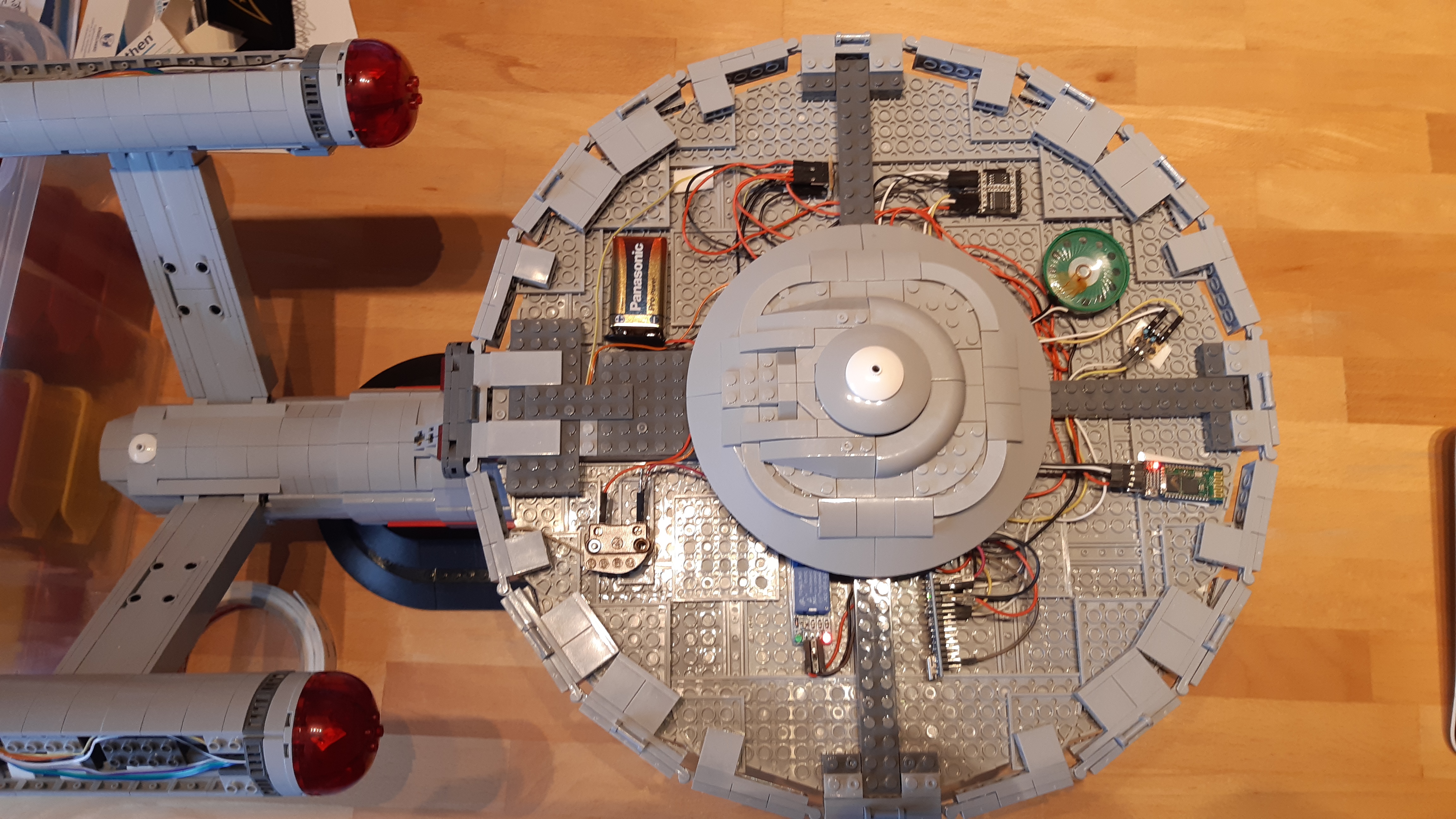 Die Größe des fertigen Modells und die Kompaktheit einiger Abschnitte des Raumschiffs offenbarte aber auch schnell die Grenzen elektronischer Modifizierungen: Während in der Untertassensektion und in den Warp-Gondeln relativ viel Platz zur Verfügung steht, ist in der zentralen Maschinensektion lediglich ausreichend Platz für eine kleine Platine, um die Stromkabel aus allen anderen Bereichen des Raumschiffs zu verbinden. Auf LEDs für Phaser, Deflektor oder Beleuchtung auf der Untertassensektion musste verzichtet werden, um sichtbare Kabelverbindungen außen am Raumschiff oder durchbohrte Klemmbausteine zu vermeiden.
