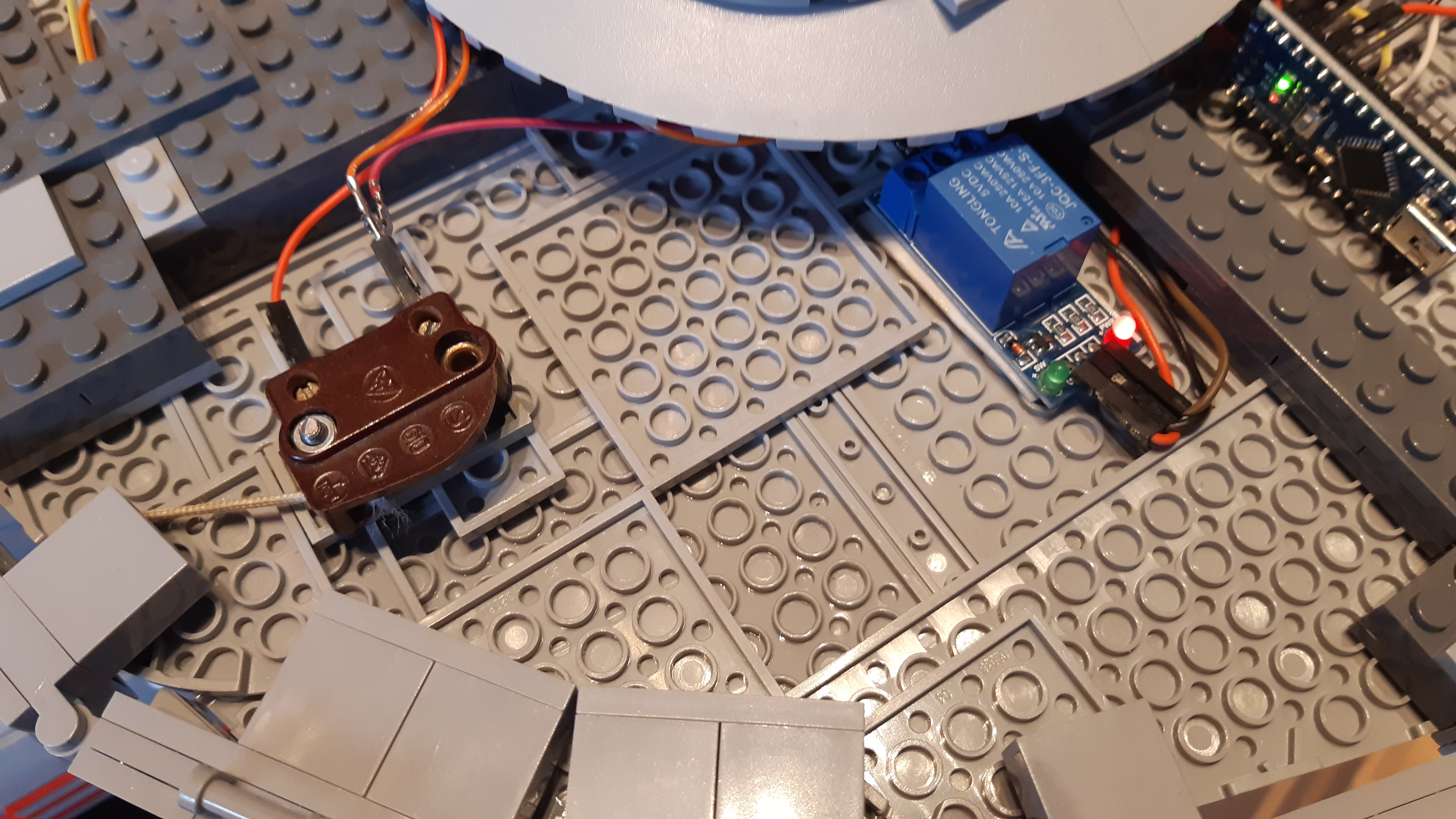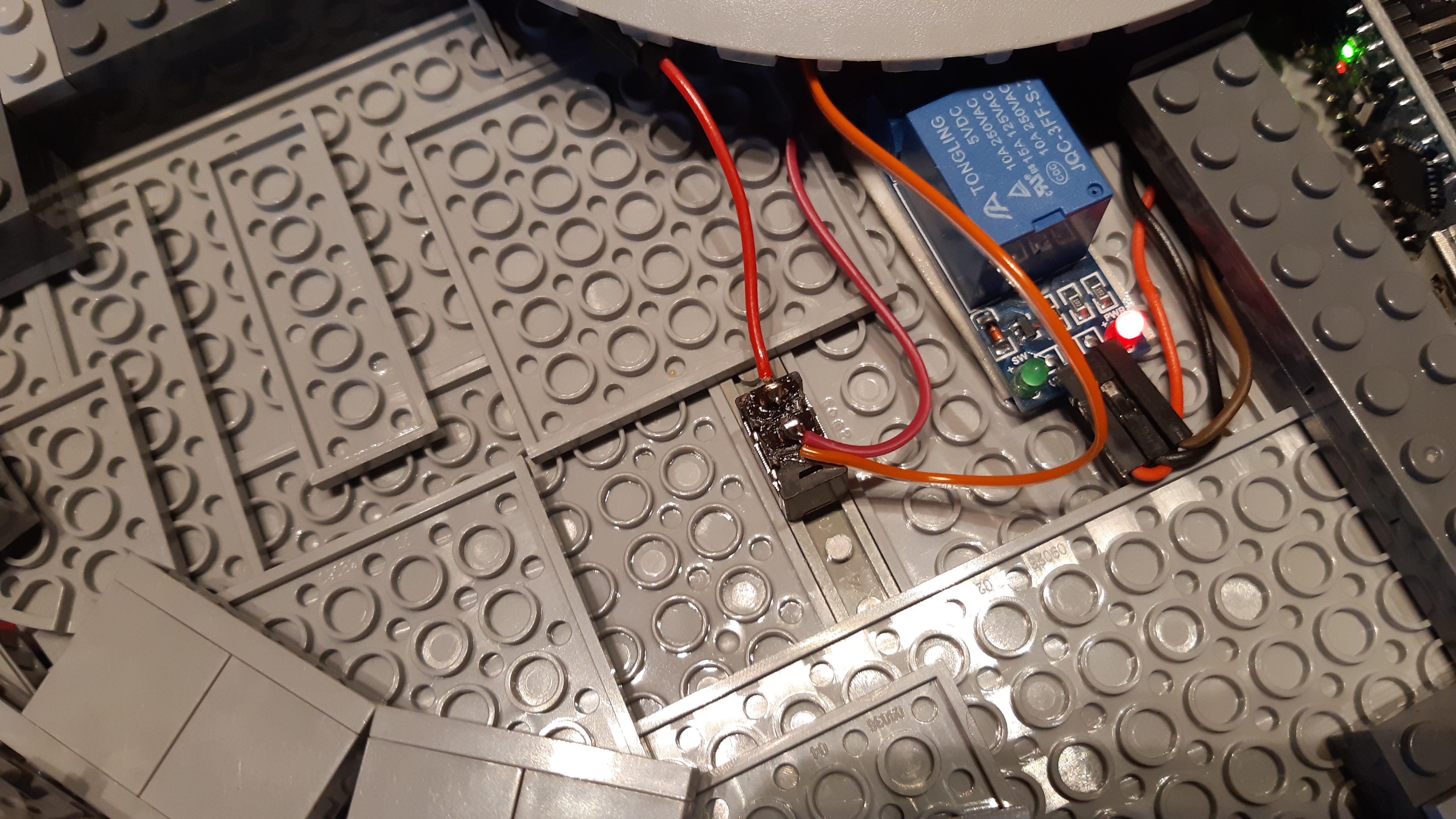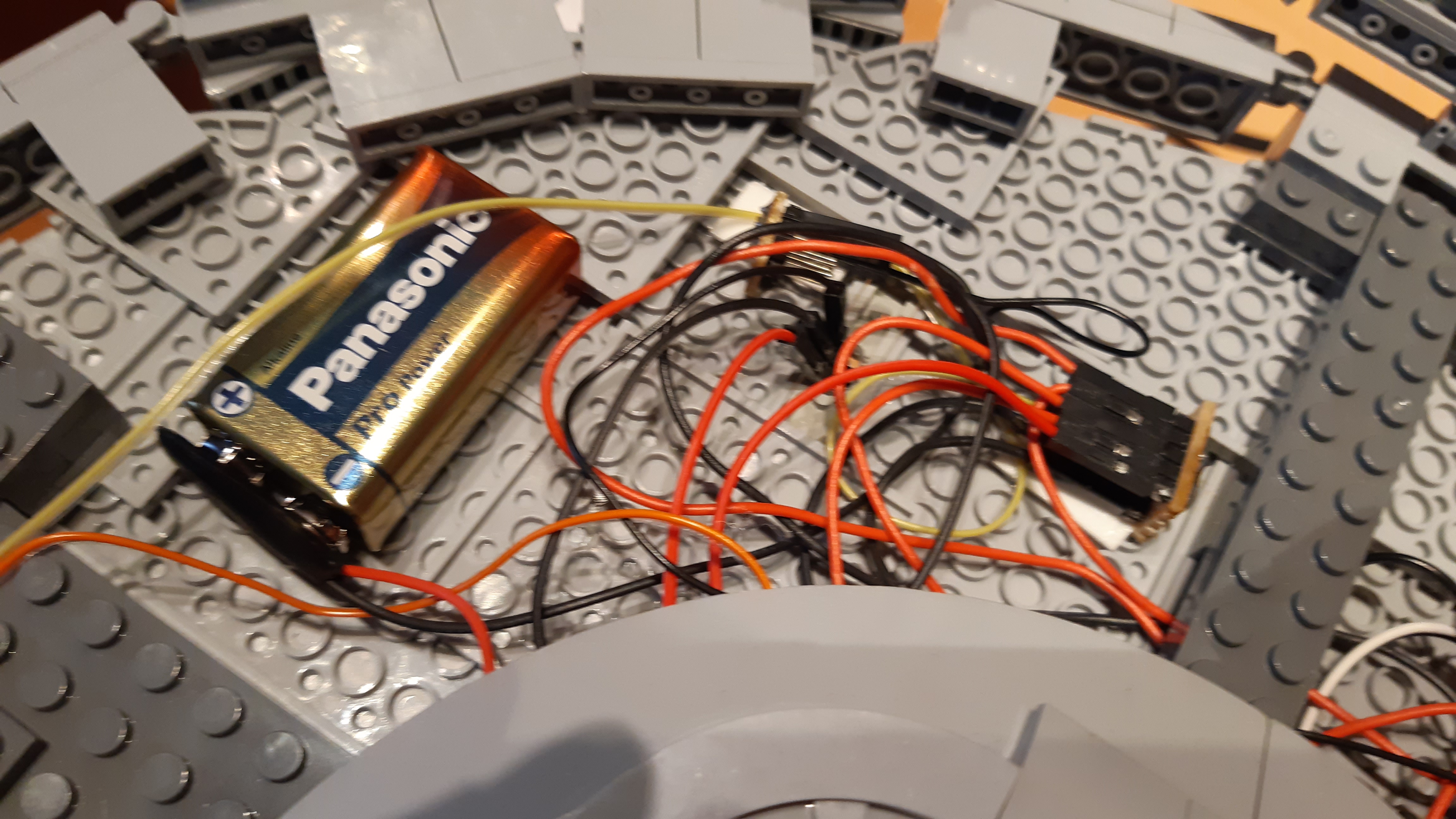 Für die hintere "Düse" in den Warp-Gondeln wurden an eine SMD-LED direkt zwei Kabel angelötet, da der Platz für einen Vorwiderstand innerhalb des orangefarbenen, runden Klemmbausteins nicht ausgereicht hätte. Dieser Vorwiderstand wurde später mit einem der beiden Kabel per Breadboard verbunden. Ein eigener Arduino-Mikrocontroller in jeder Warp-Gondel ermöglicht die unabhängige und gleichzeitige Programmierung der LEDs.
