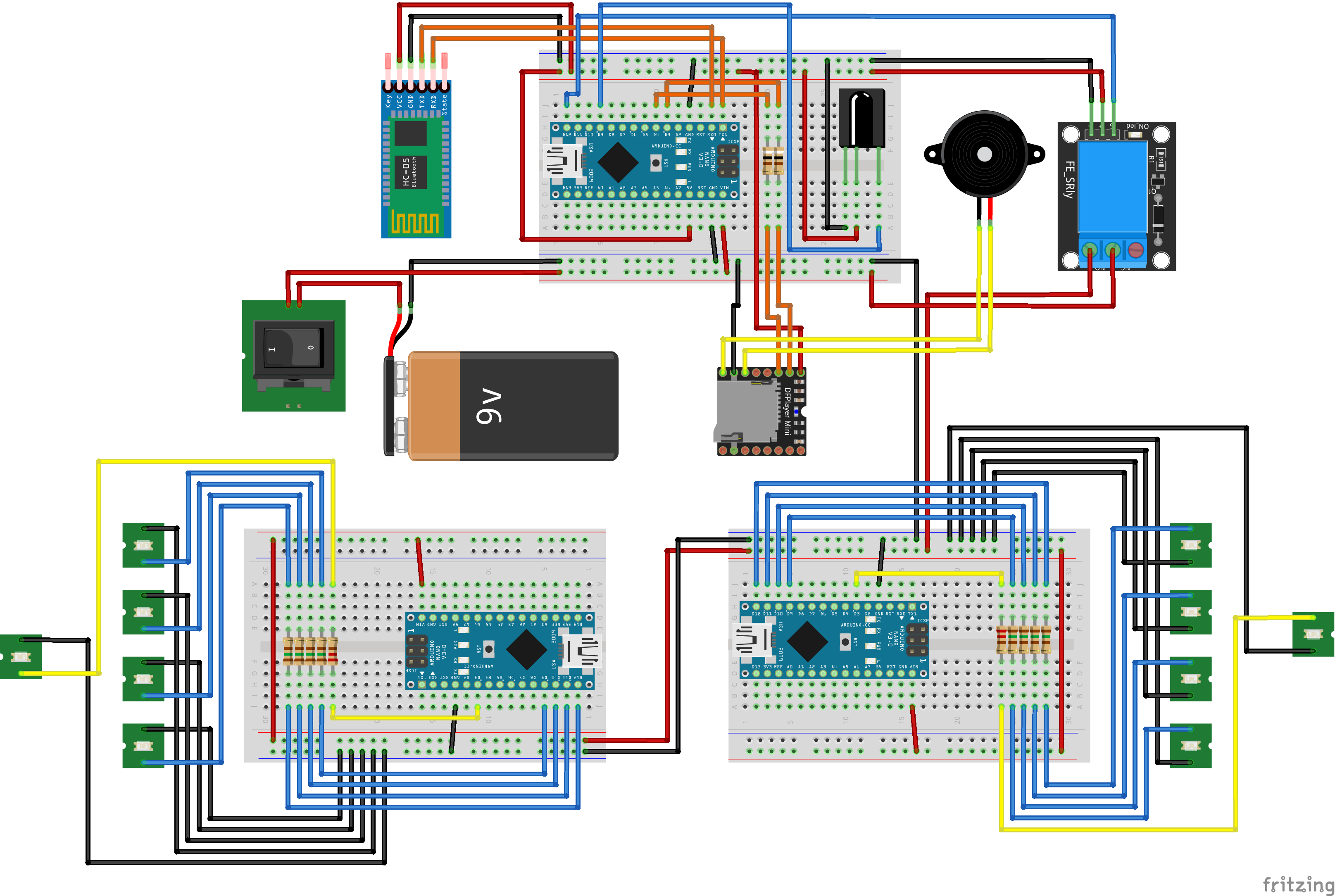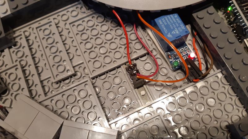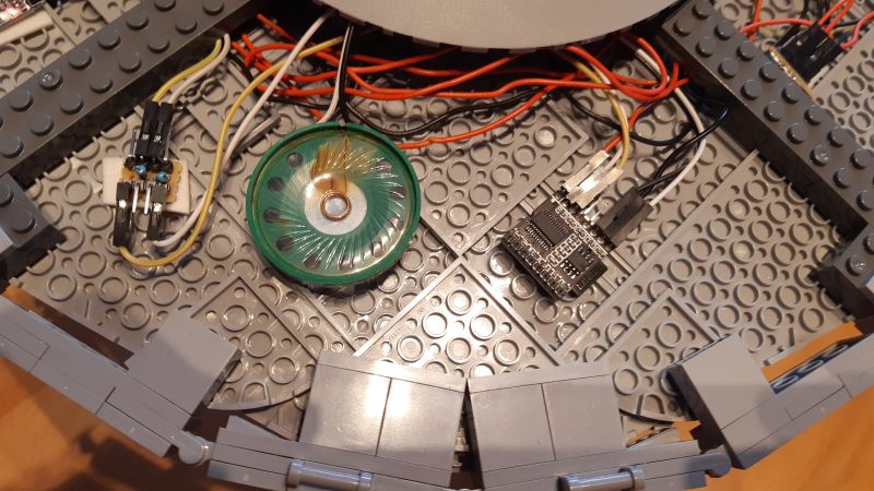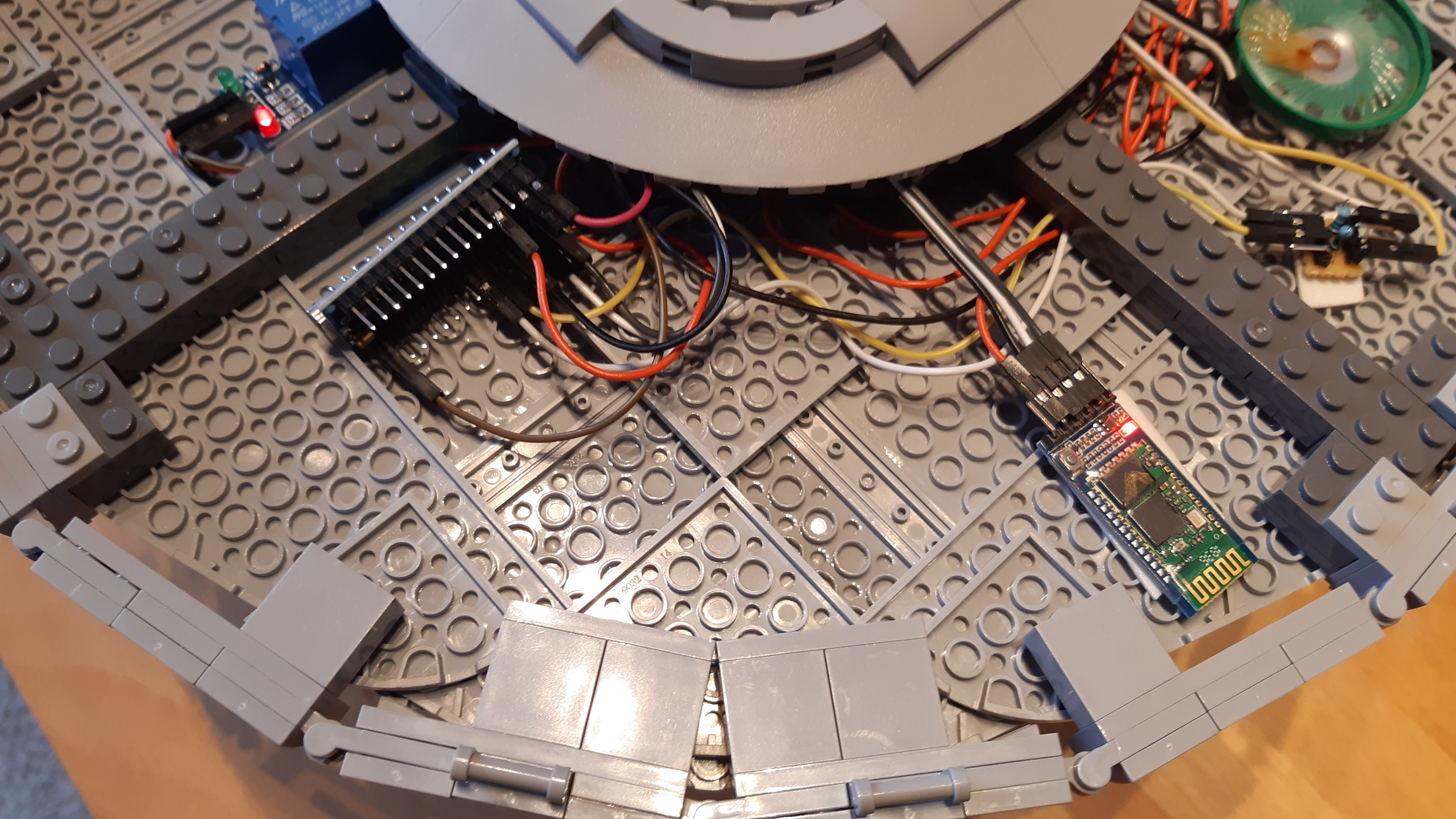 Der Bereich "Stromversorgung" enthält eine 9V-Blockbatterie sowie eine kleine Streifenrasterplatine mit Stiftleisten für GND und 5V. Im Bereich "Schalter" befindet sich ein über 50 Jahre alter Hand-Zugschalter, der mittels Schraube und Mutter auf eine separate Loch-Klemmbausteinplatte (2x4) geschraubt ist und die 9V-Stromversorgung der Batterie ein- bzw. ausschaltet, sowie ein 5V-Relaismodul, welches die 9V-Stromversorgung zu den beiden Warp-Gondeln weiterleitet und damit deren Schaltungen mit jeweils eigenem Arduino-Mikrocontroller aktiviert. Im Bereich "Audio" befindet sich das DFPlayer Mini Modul mit MicroSD-Speicherkarte, ein 0,5 Watt Lautsprecher sowie eine Mini-Streifenrasterplatine mit Stiftkontakten und zwei 900-Ohm-Widerständen. Letztere sind erforderlich für die Kommunikation zwischen dem DFPlayer Modul (TX/RX mit 3,3V) und dem Arduino Mikrocontroller (TX/RX mit 5V). Der Bereich "Controller" schließlich enthält den Arduino Nano Mikrocontroller sowie ein HC-05 Bluetooth-Modul für die Kommunikation mit dem Smartphone.