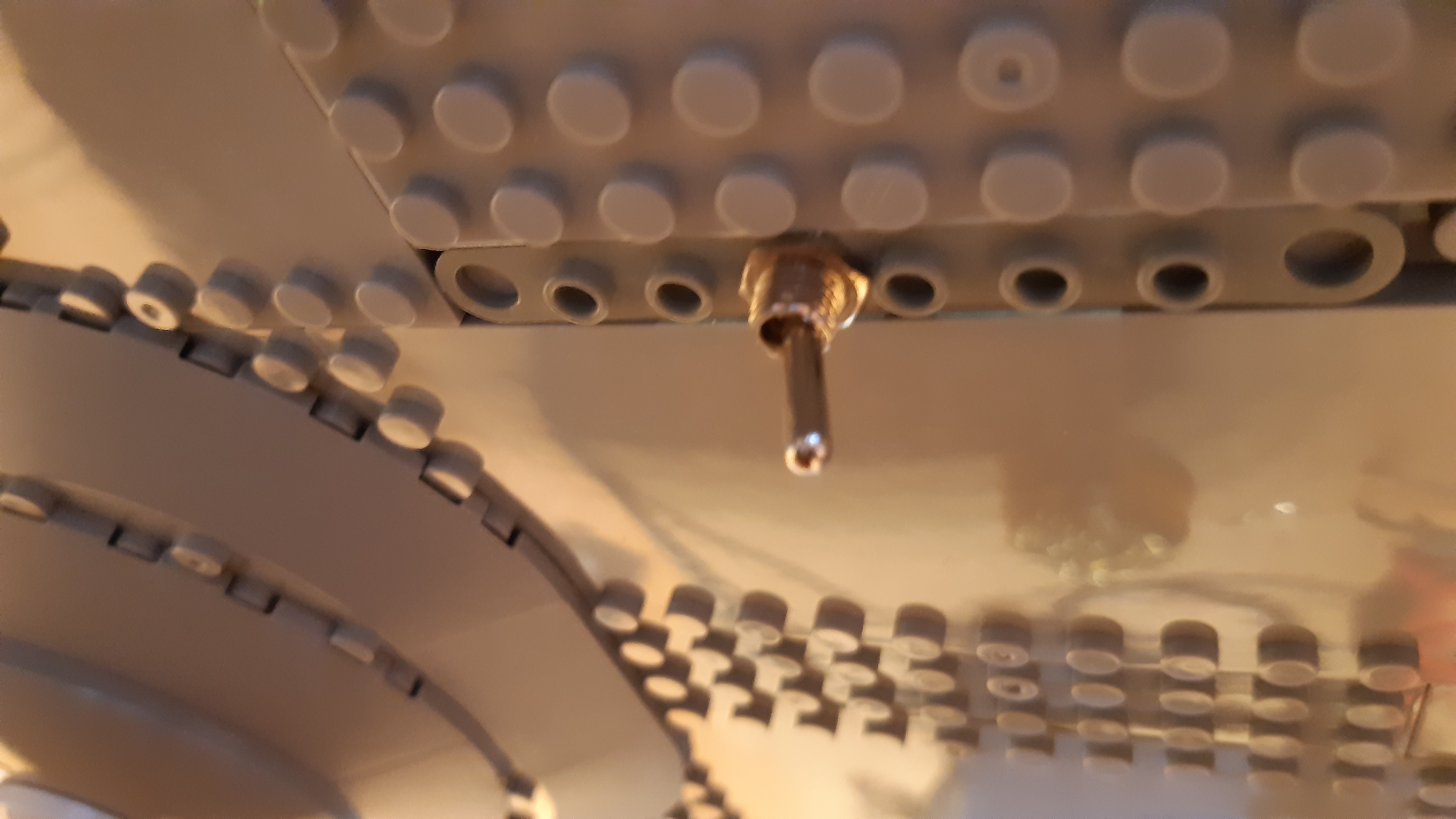 Nach ersten Tests gab es Pläne für zwei Änderungen: Einerseits sollte der antike Zugschalter durch einen unauffälligeren Kippschalter ersetzt werden, welcher mittels einer 6mm-Bohrung in eine Klemmbausteinplatte 1x8 befestigt werden konnte. Hierzu wurde eine originale, noppenfreie Klemmbausteinplatte 1x8 entfernt und durch eine modifizierte Klemmbausteinplatte 1x8 ersetzt.