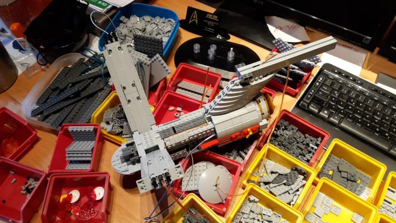 Das Raumschiff Enterprise als Bausatz aus 2888 Klemmbausteinen von BlueBrixx ist an sich schon eine vergnügliche Herausforderung für viele Stunden. Die besondere Challenge war nun, alle Abschnitte dieses Raumschiffs mit Strom zu versorgen, um später elektronische Schaltungen dort unterbringen zu können. Außerdem durfte - so die Challenge - kein Original-Baustein modifiziert werden, stattdessen sollten lediglich Bausteine weggelassen oder an andere Stelle verbaut werden dürfen. Zusätzliche, nicht zum ursprünglichen Set gehörende Klemmbausteine sollten dagegen erlaubt sein und auch verändert werden dürfen.