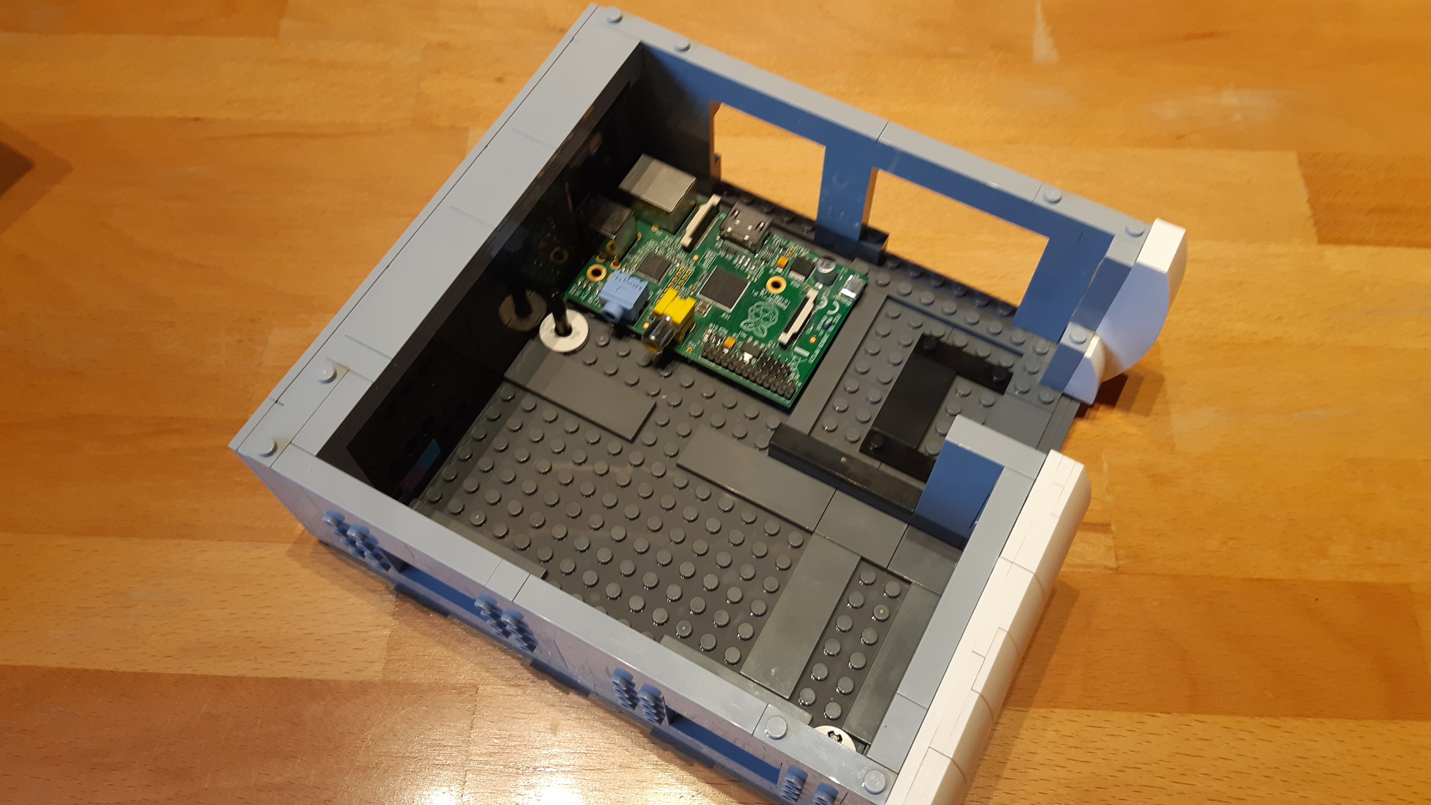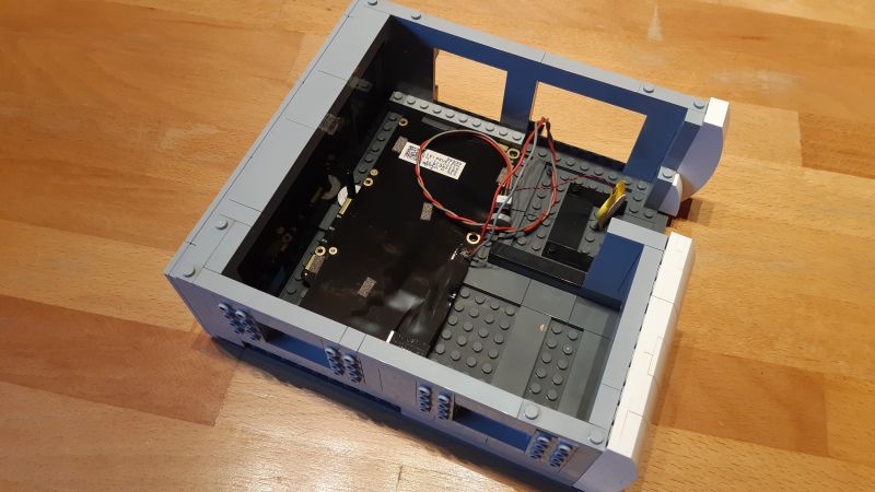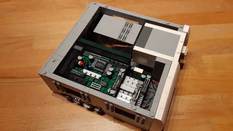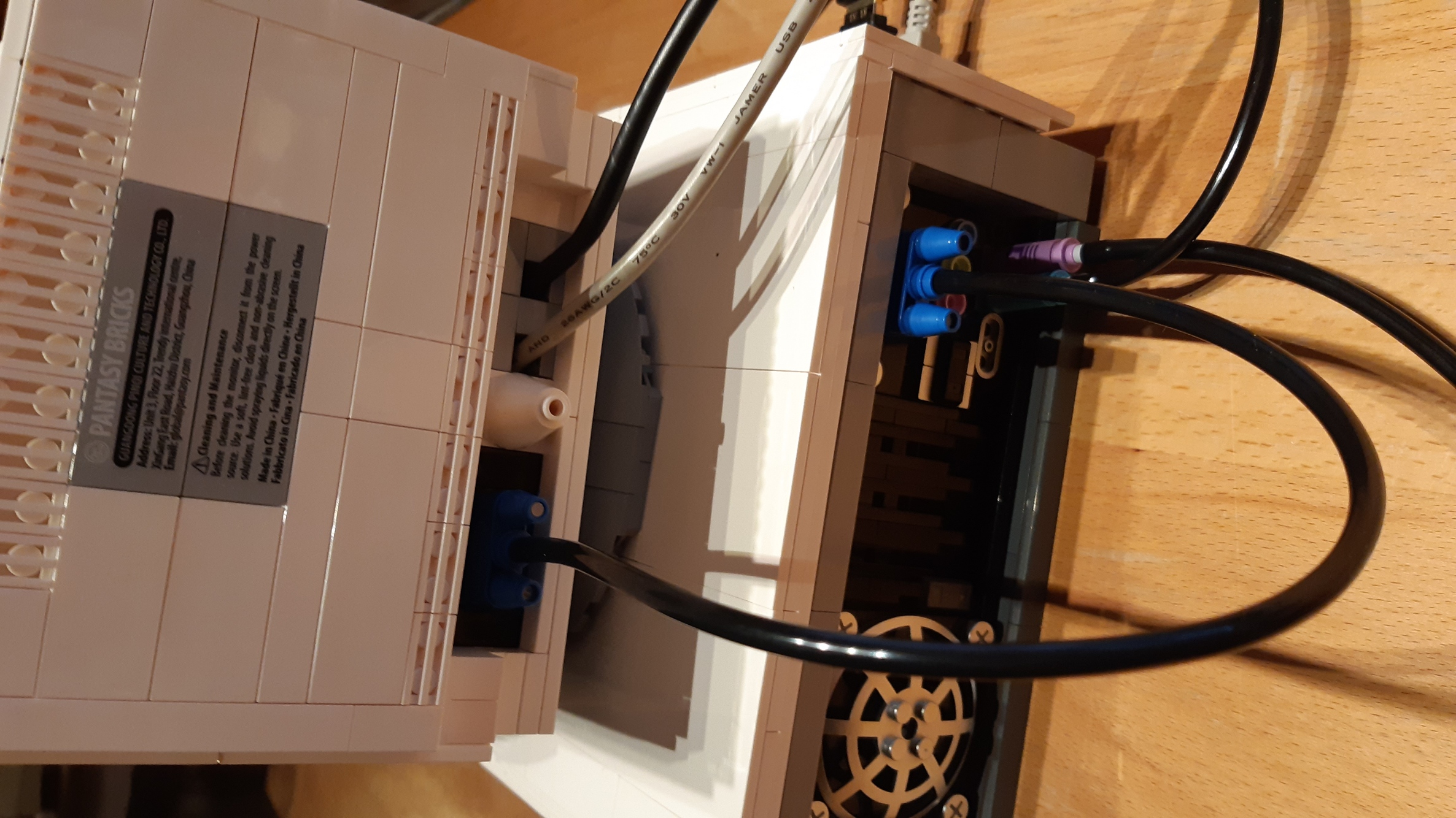Bereits während des Bauvorgangs dieses Klemmbausteinbausatzes wurde immer wieder überprüft, ob und wie die echten PC-Komponenten, die zusätzlich eingebaut werden sollten, in das Modell eingesetzt und befestigt werden konnten. Dabei stellte sich zunächst die Frage, ob ein x86-basiertes PC-Mainboard oder ein Raspberry Pi als Basis für den echten Retro-PC genutzt werden sollte:
