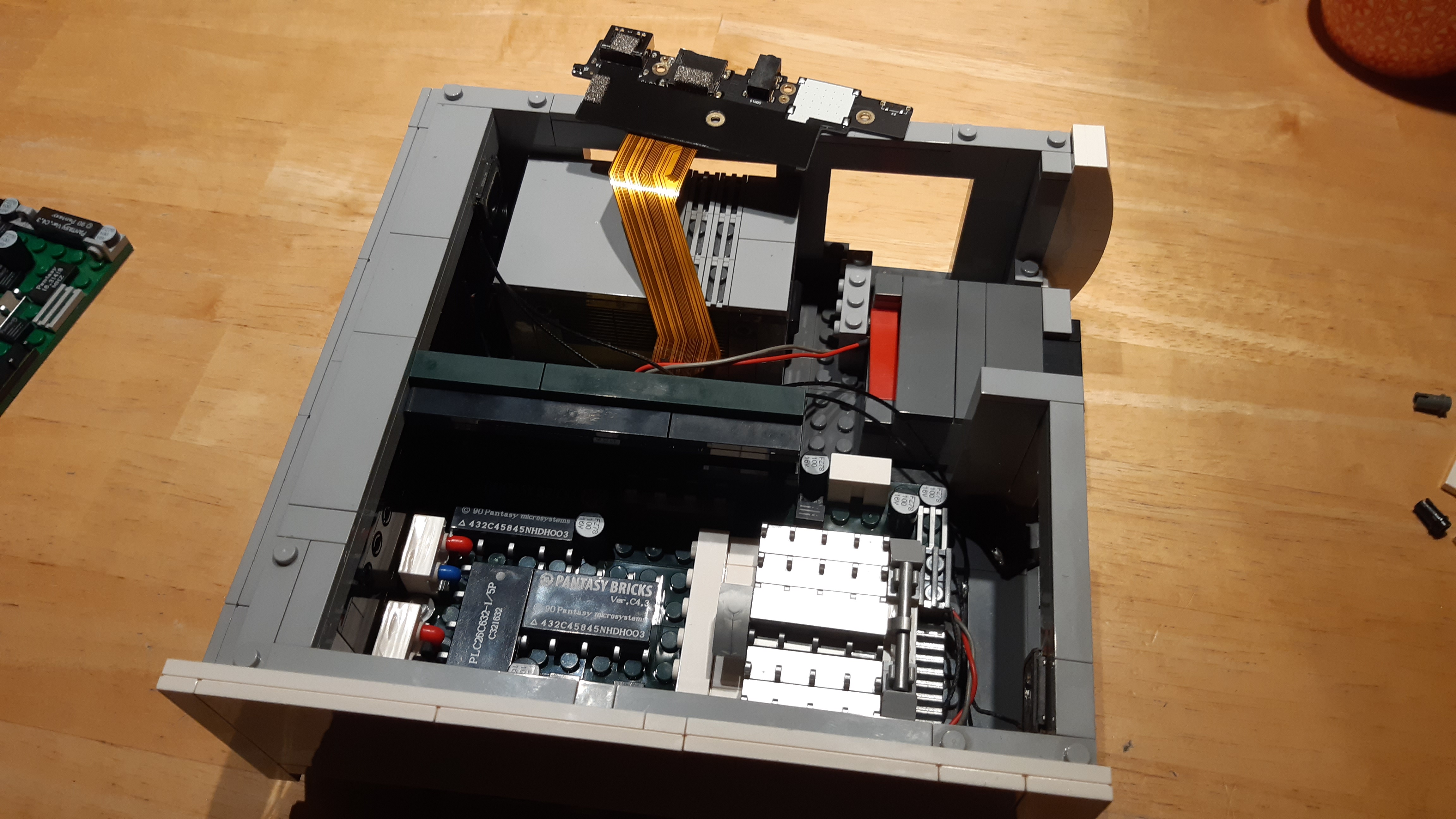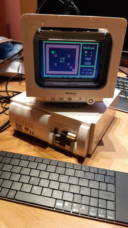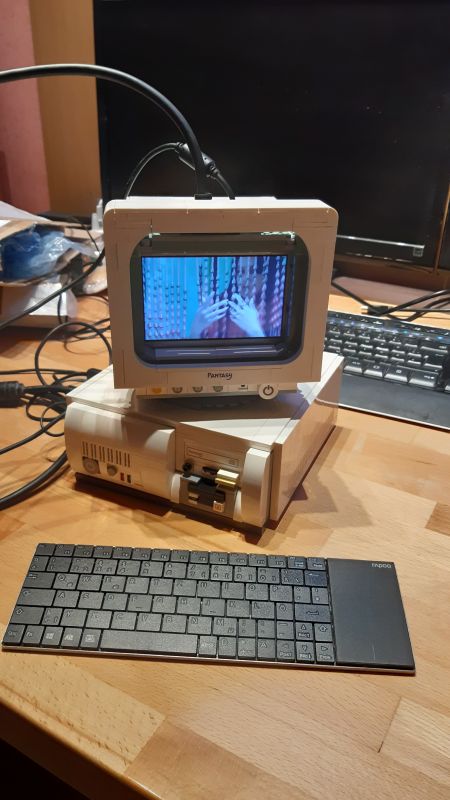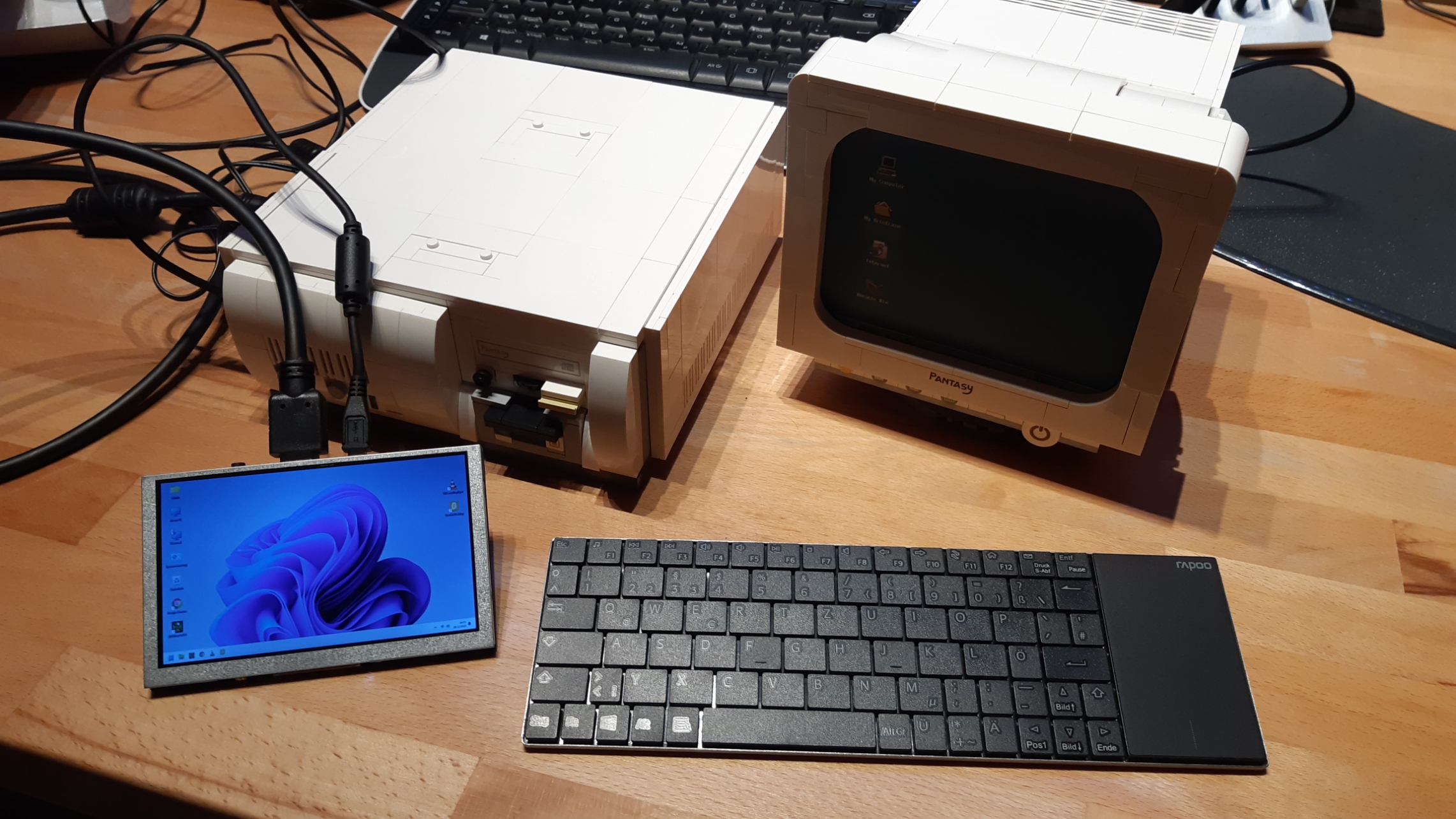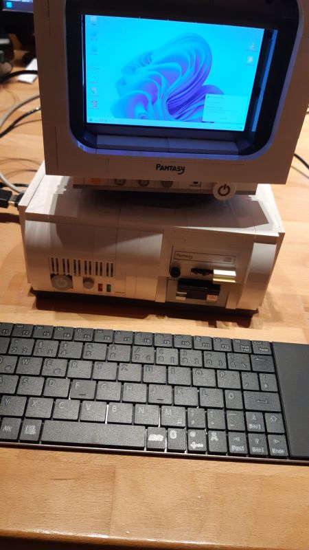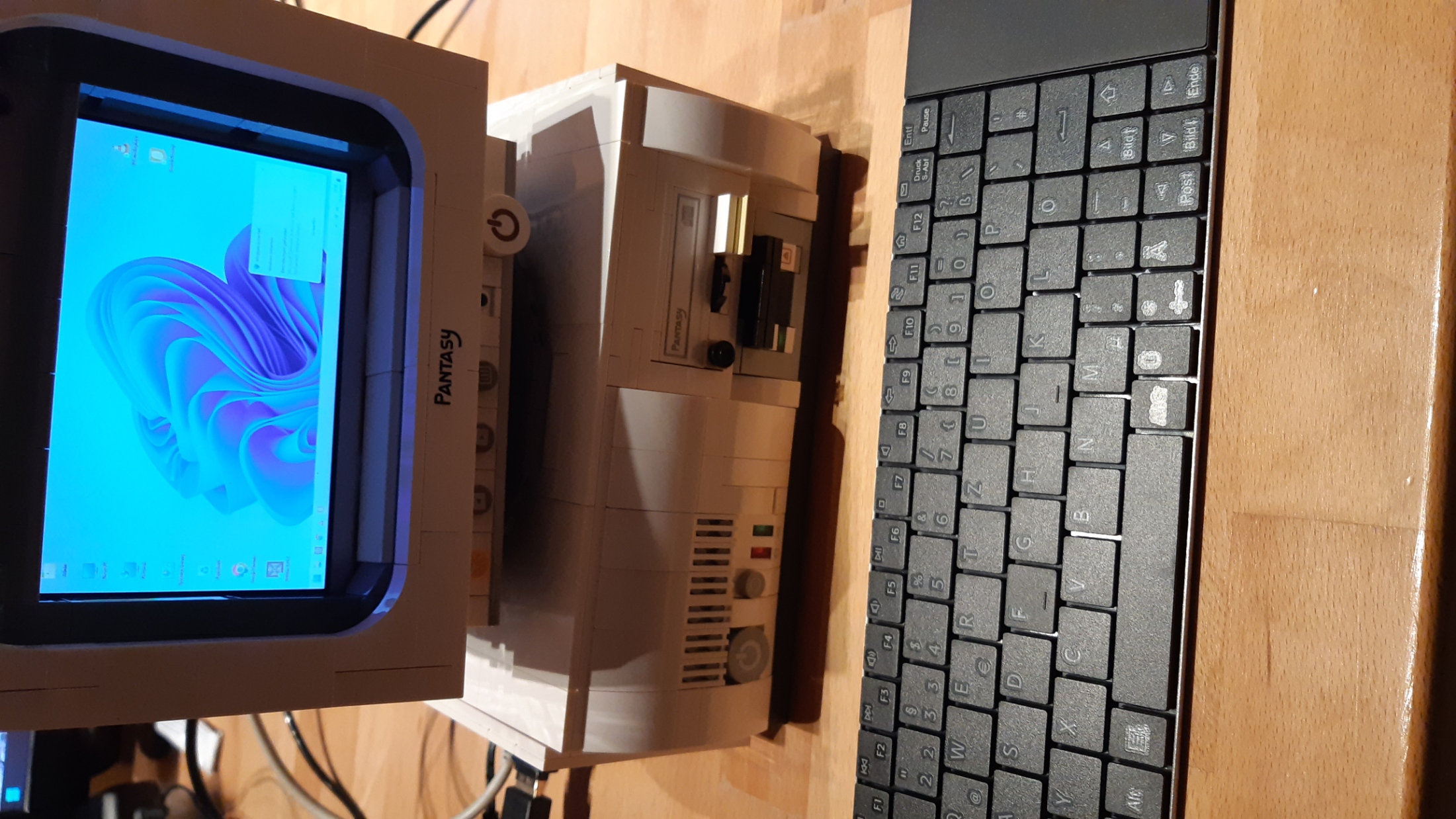 Die Firma Pantasy bietet einen Retro-PC Klemmbausteinbausatz mit 1634 Bauteilen an, der im Grunde eine Miniaturversion eines echten PCs der 90er-Jahre darstellt, inkl. herausnehmbaren PC-Komponenten (Mainboard, Grafikkarte, Netzteil) sowie interaktiv nutzbares Disketten-/CD-Laufwerk und Monitor mit teils interaktivem Bildschirm. Meine Idee war, zusätzlich ein "echtes", technisch aktuelles PC-Innenleben in den PC sowie ein Mini-TFT-Display in den Monitor einzubauen, um z.B. mittels DOSBox alte DOS-Spiele auf diesem Retro-PC spielen zu können. Die Challenge war darüber hinaus, dass nur die im Klemmbausteinset enthaltenen Klemmbausteine verwendet werden durften, ohne diese jedoch zu modifizieren.