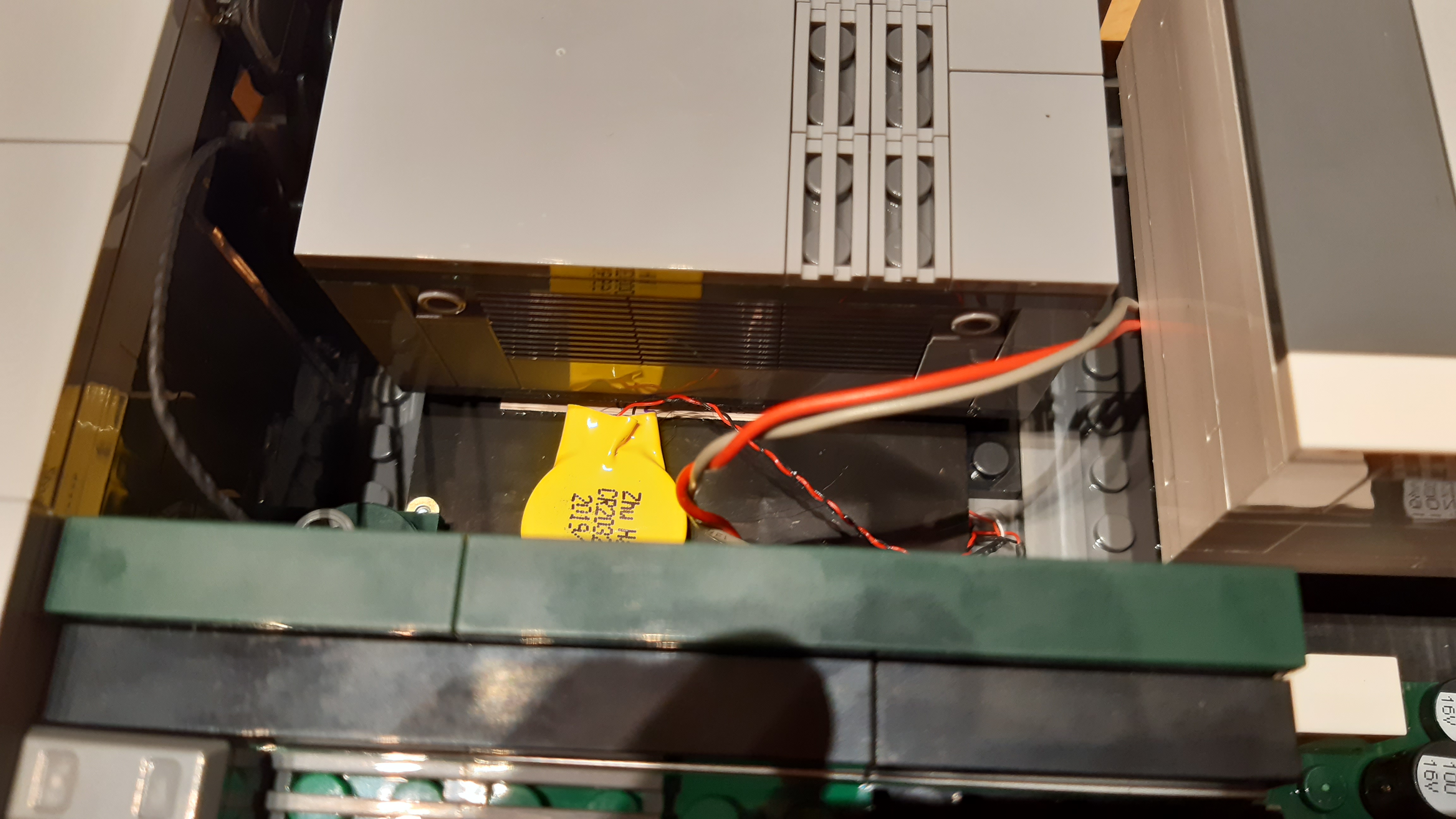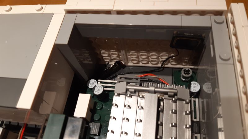 Zuletzt wurden die beiden Stereo-Lautsprecher des Terra-Mainboards innen an das Klemmbaustein-Gehäuse angeklebt, wobei hier die Kleberrückstände der Lautsprecher verwendet wurden: