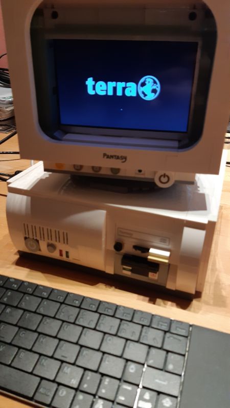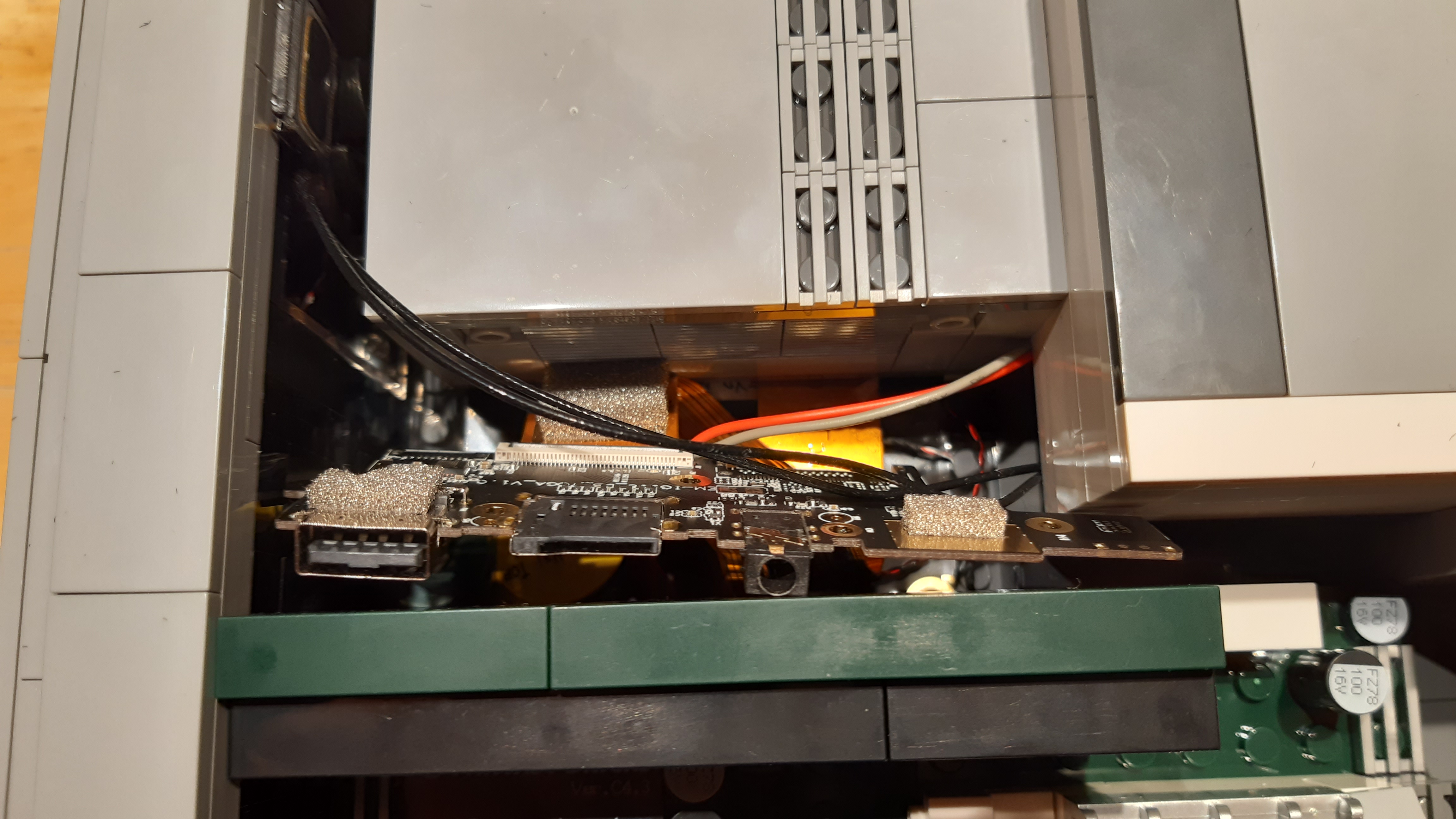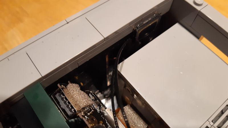Die Wahl fiel aufgrund der deutlich höheren Leistung auf das Terra-Mainboard, und so wurde dieses auf der Grundplatte des Retro-PCs mittels Klemmbausteinen fixiert. Außerdem musste seitlich eine Aussparung in das Gehäuse eingebaut werden, um die Anschlüsse des Terra-Mainboards erreichen zu können: