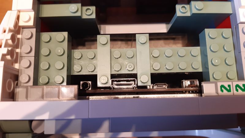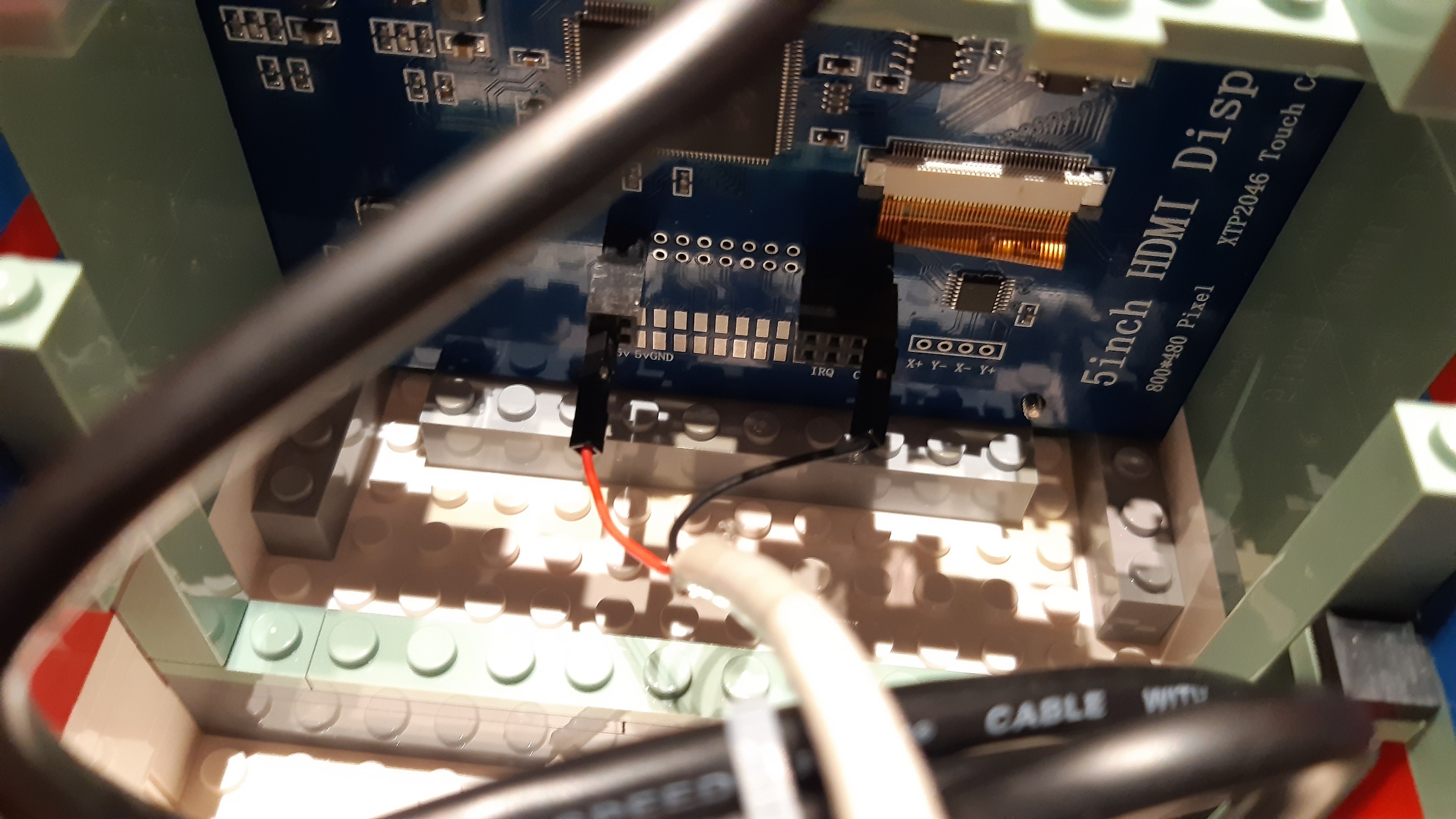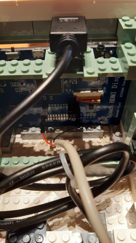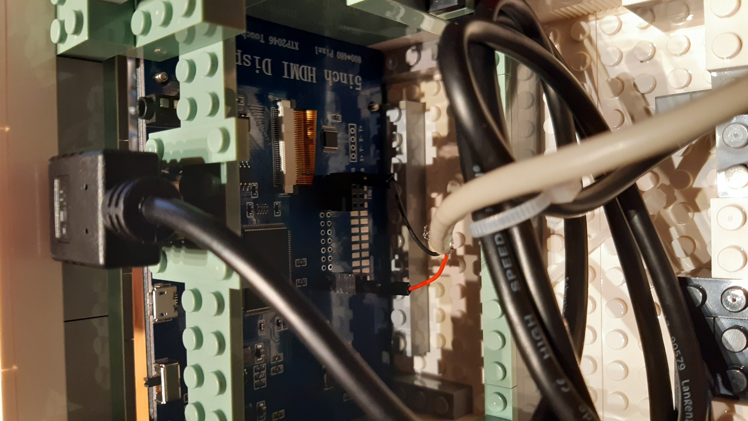 Damit das HDMI-Anschlusskabel des TFT-Displays in den Monitor hineinpasste, musste ein Kabel beschafft werden, dessen einer Stecker im richtigen Winkel abgewinkelt war, während die Stromversorgung (vom USB-Anschluss des Terra-Mainboards) durch zwei Dupont-Stecker an den Klemmbuchsen des TFT-Displays realsiert wurde. Beide Kabel fanden - aufgerollt - im hinteren Bereich des Klemmbaustein-Monitors platz. Auf der Rückseite des Klemmbaustein-Monitors wurden Aussparungen für die beiden Kabel geschaffen, so dass sie neben den (unechten) Klemmbaustein-Kabelverbindungen nicht weiter auffielen. Sowohl HDMI- als auch USB-Kabel wurden dann seitlich an das Terra-Mainboard angeschlossen: