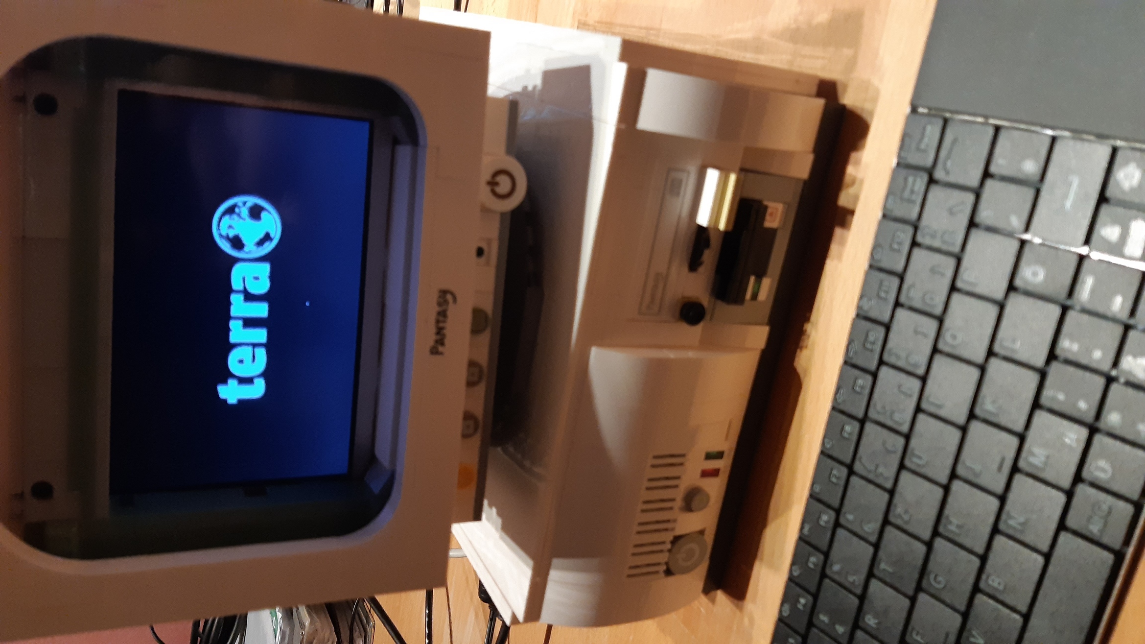 Alle übrigen Klemmbaustein-PC-Komponenten passten auch noch oberhalb des Terra-Mainboards in den Retro-PC und die BIOS-Batterie, die Lautsprecher und der ON/OFF-Taster des Terra-Mainboards fanden ebenfalls einen Platz im Gehäuse.