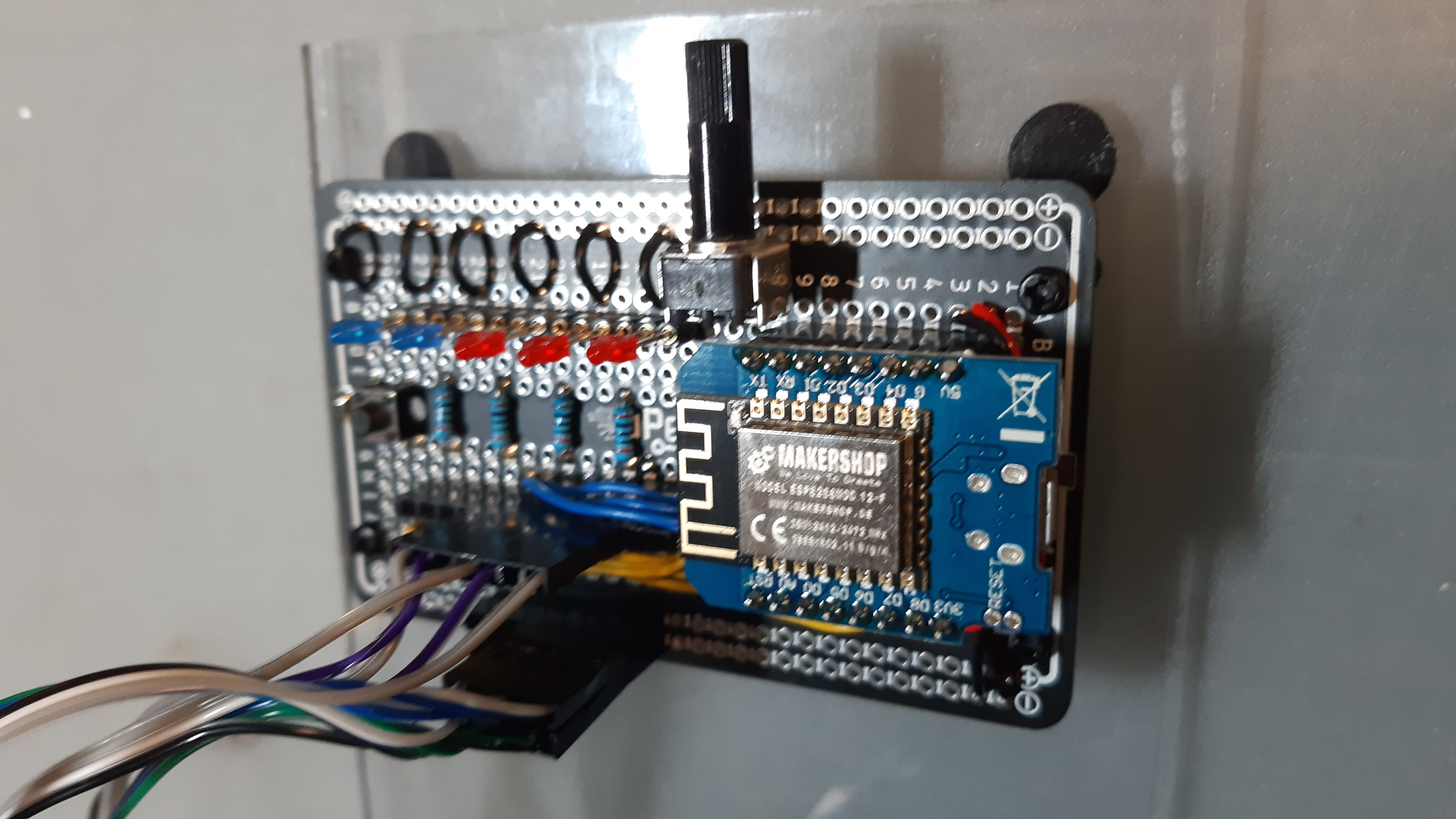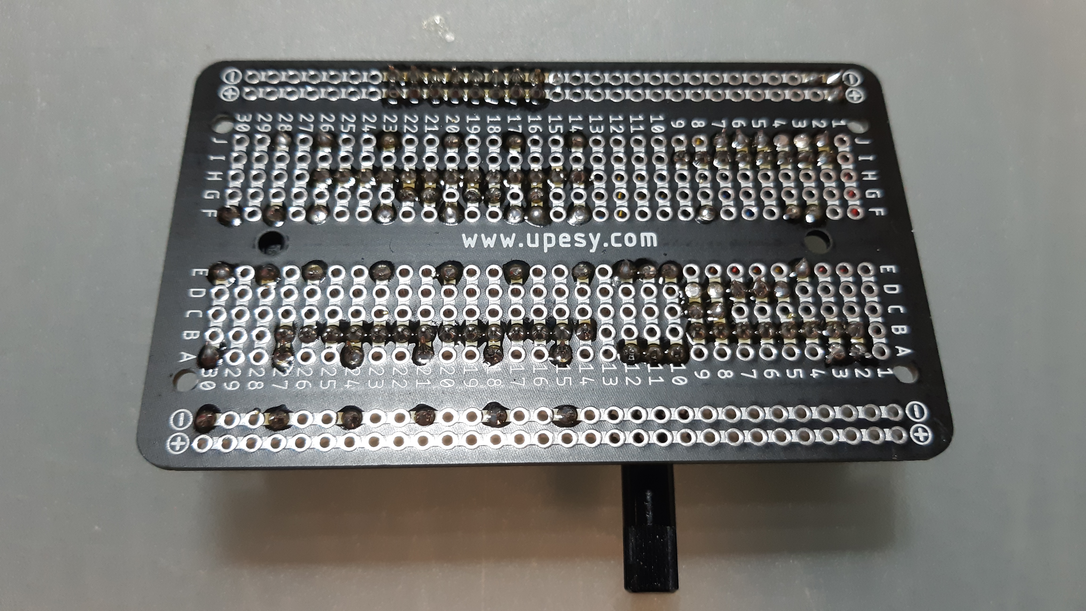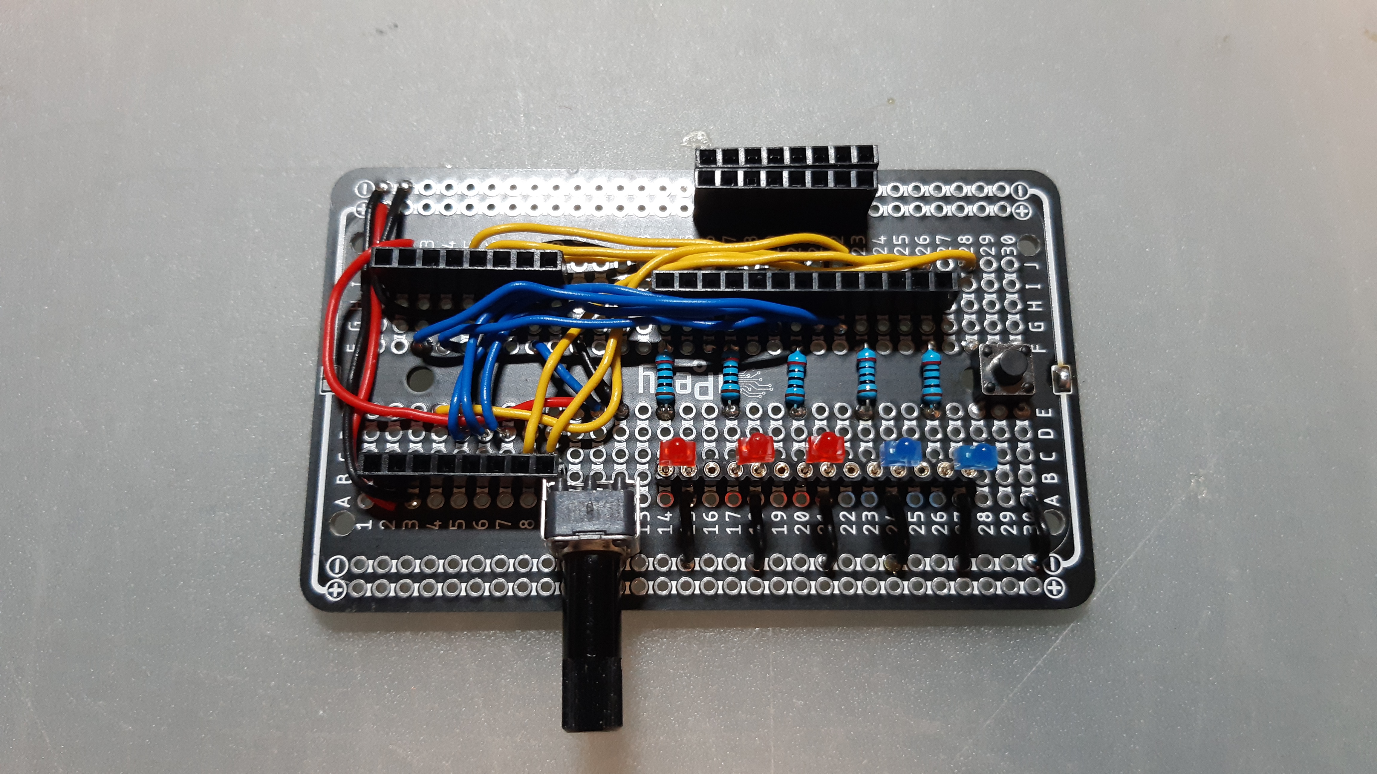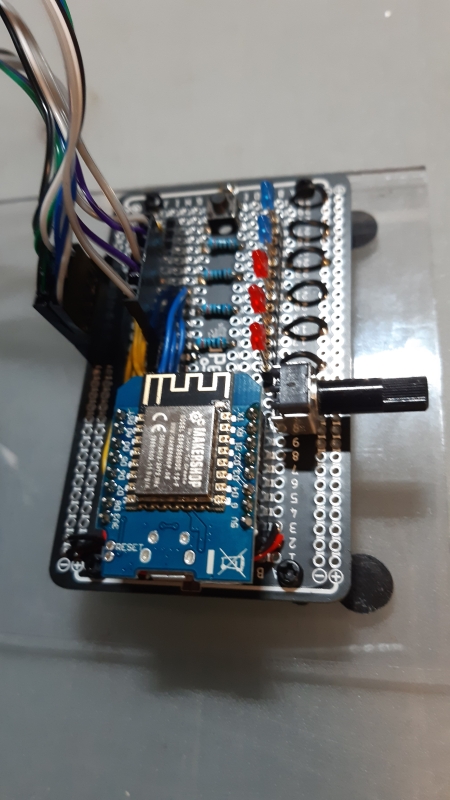 Anders als bei der Arduino-Variante wurde in diesem Projekt die gesamte Elektronik auf eine Streifenrasterplatine im Breadboard-Layout gelötet, wobei sowohl der WEMOS D1 mini als auch die LEDs sowie die Anschlüsse der Servomotoren mittels Buchsenleisten steckbar sein sollten: