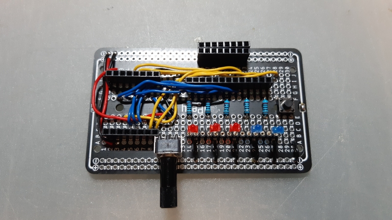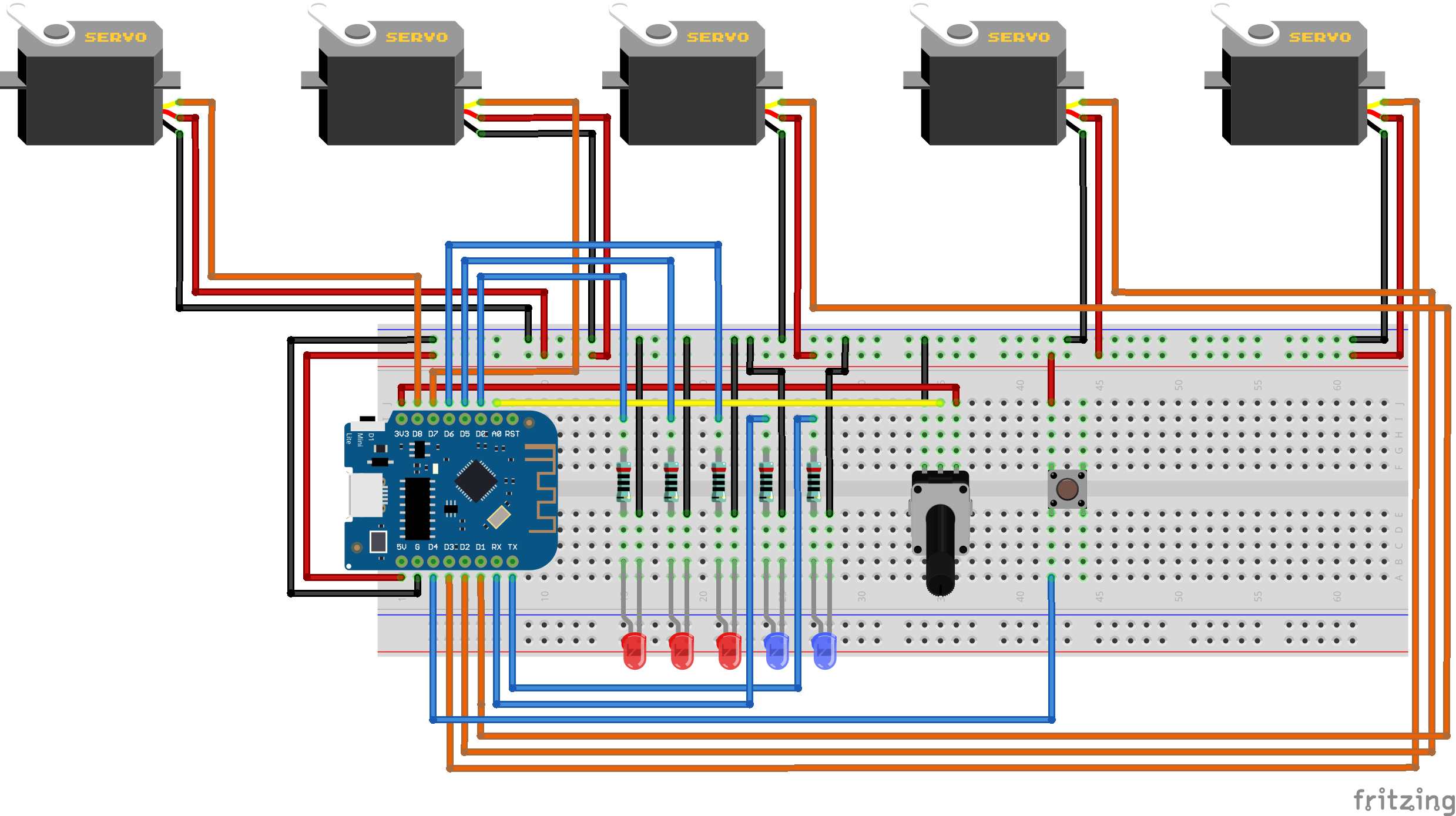 Mittels des hier ausgeführten MicroPython-Programms wird mittels des Tasters reihum zwischen fünf Zuständen gewechselt. In jedem Zustand kann einer der Servomotoren mittels des Potentiometers manuell gesteuert werden. Die drei roten LEDs zeigen dabei binär die Nummer des gerade aktiven Servomotors (1-5) an. Ursprünglich sollten fünf LEDs den jeweils aktiven Servomotor anzeigen (daher die zwei zusätzlichen, jetzt blauen LEDs), was theoretisch mittels des TX- und RX-Pins auch funktioniert hat; allerdings gab es dann keine Möglichkeit mehr, Programmcode mittels USB zu übertragen, da dieser ebenfalls mit den Kontakten TX und RX verbunden ist. Nun zeigen die beiden blauen LEDs die USB-Kommunikation an, ähnlich wie bei vielen Arduino-Boards.
