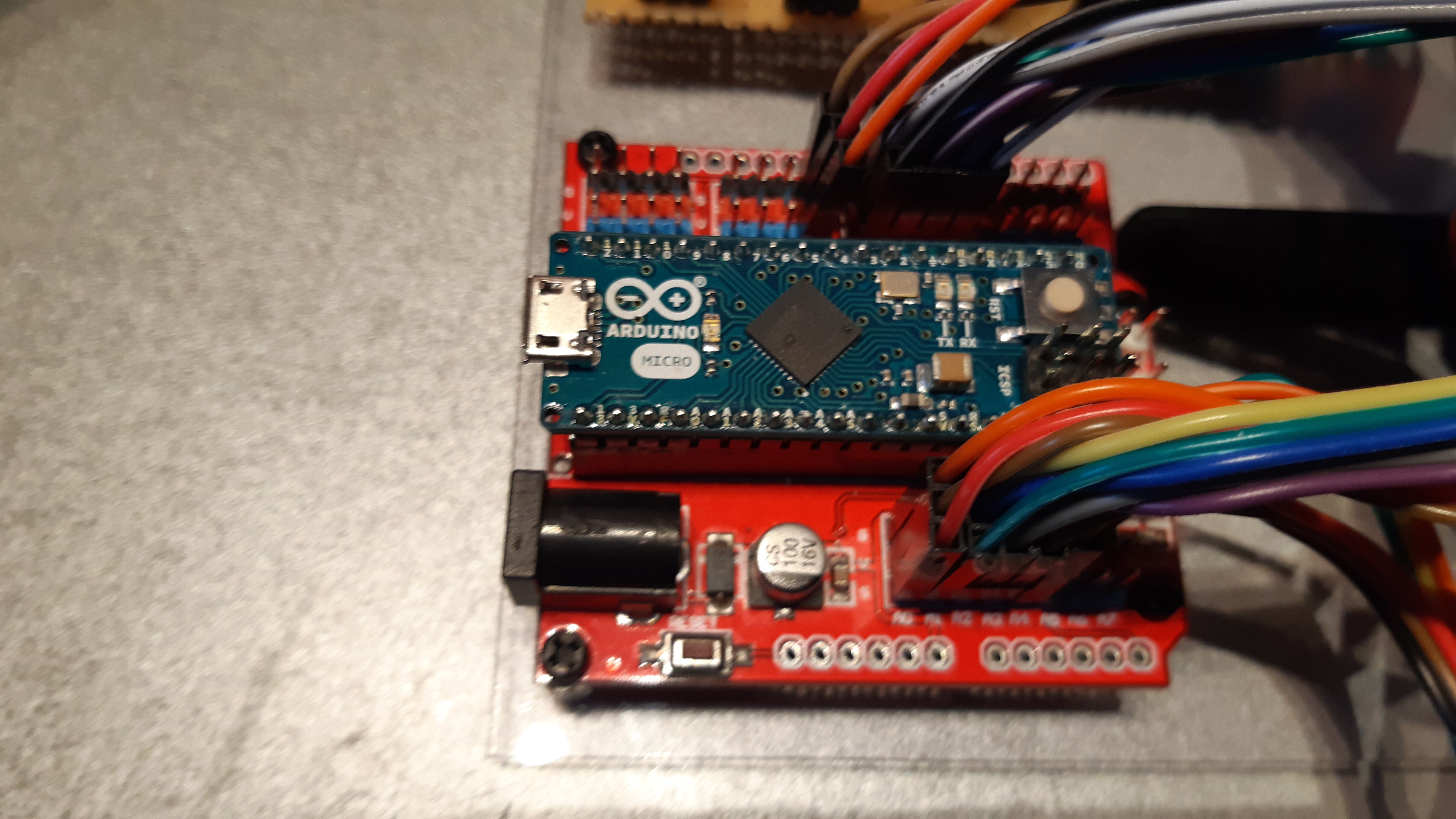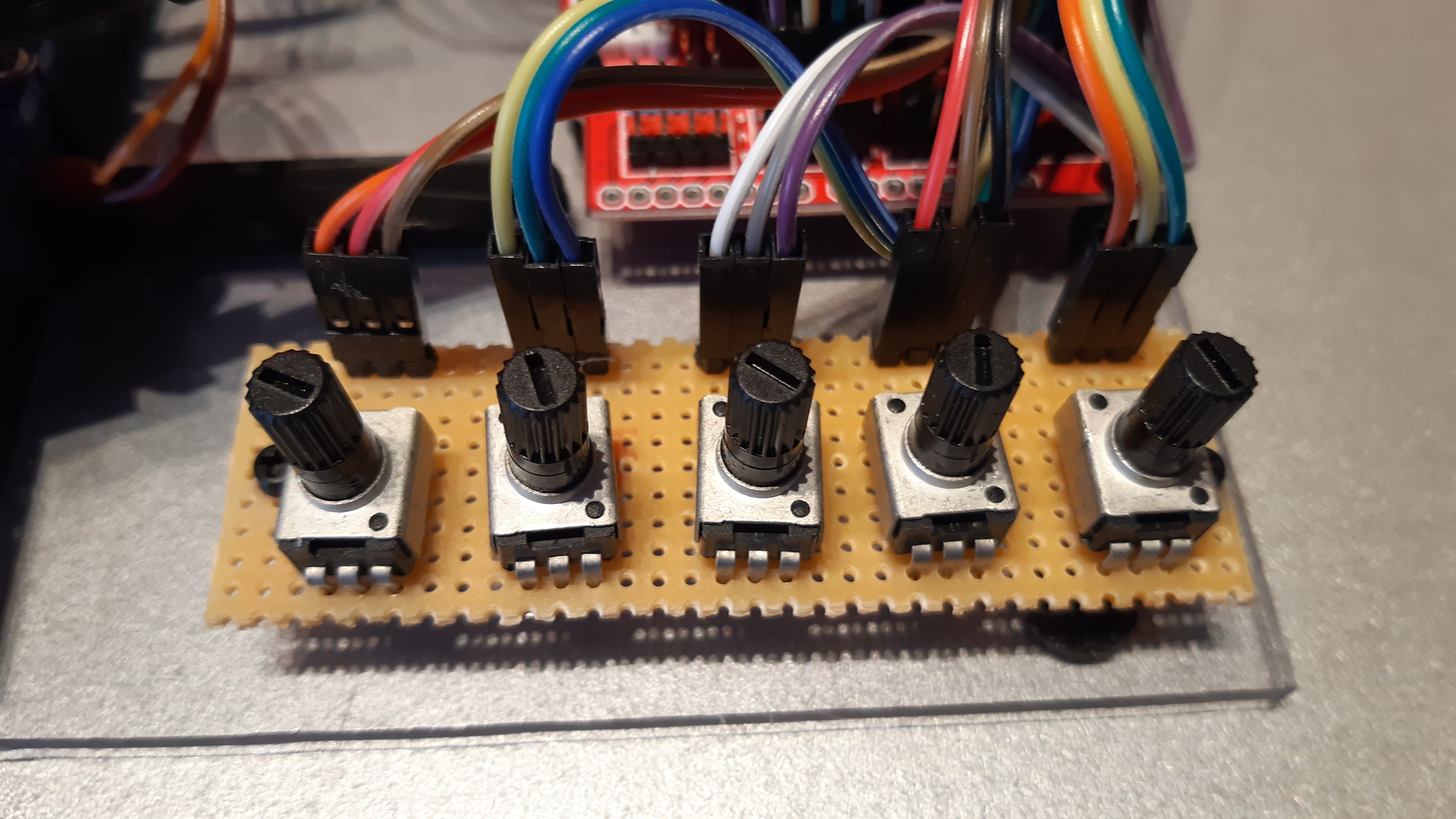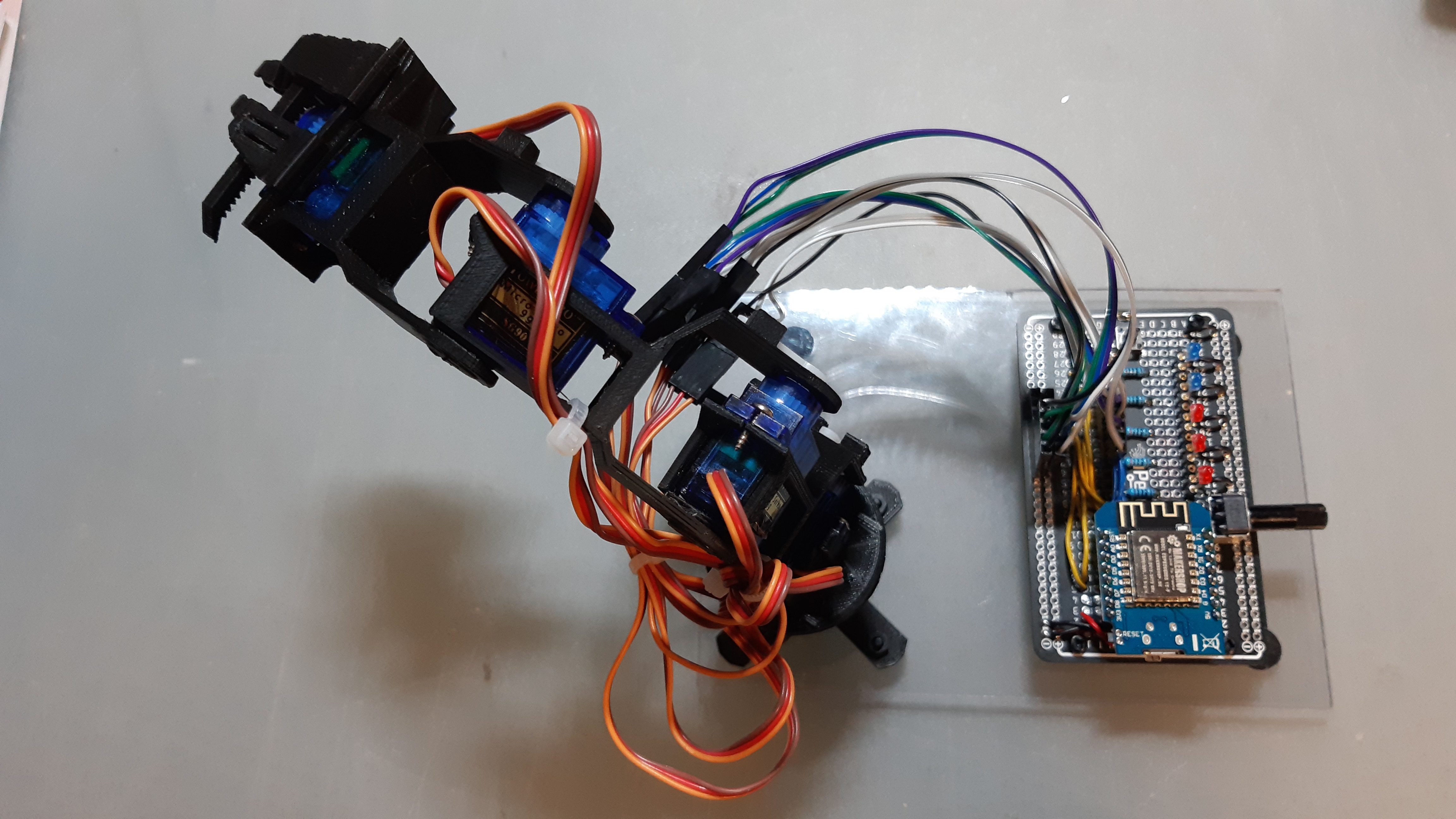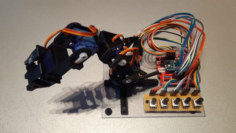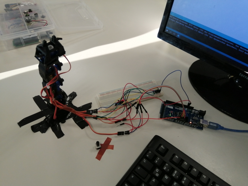 Zunächst wurde der Roboterarm mittels 3D-Drucker gedruckt und mit den Servomotoren montiert. Anschließend wurde mittels Kabelverlängerungen die Verbindung zum Arduino Sensor Shield hergestellt. Danach wurde eine Streifenrasterplatine zurechtgeschnitten und darauf die fünf Potentiometer sowie fünf 3polige Steckkontakte gelötet. Alle drei Komponenten (Roboterarm, Arduino Sensor Shield und Streifenrasterplatine) wurden zuletzt mittels Kunsttoffschrauben und -abstandshalter auf die Plaxiglasscheibe montiert.