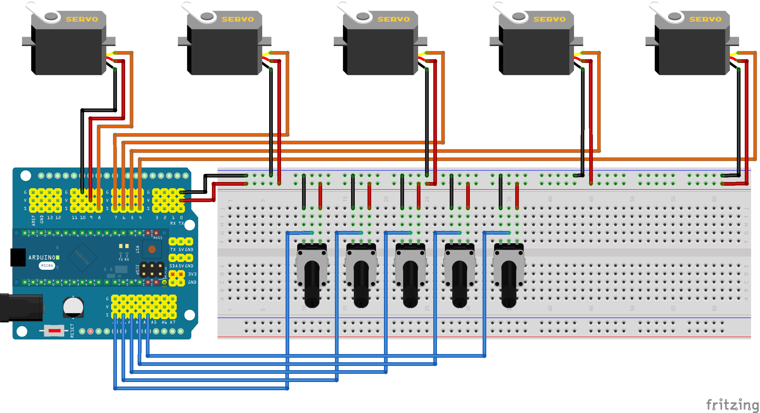 In dem hier ausgeführten Arduino-Sketch lässt sich jeder der fünf Servomotoren des Roboterarms mittels eines eigenen Potentiometers steuern.