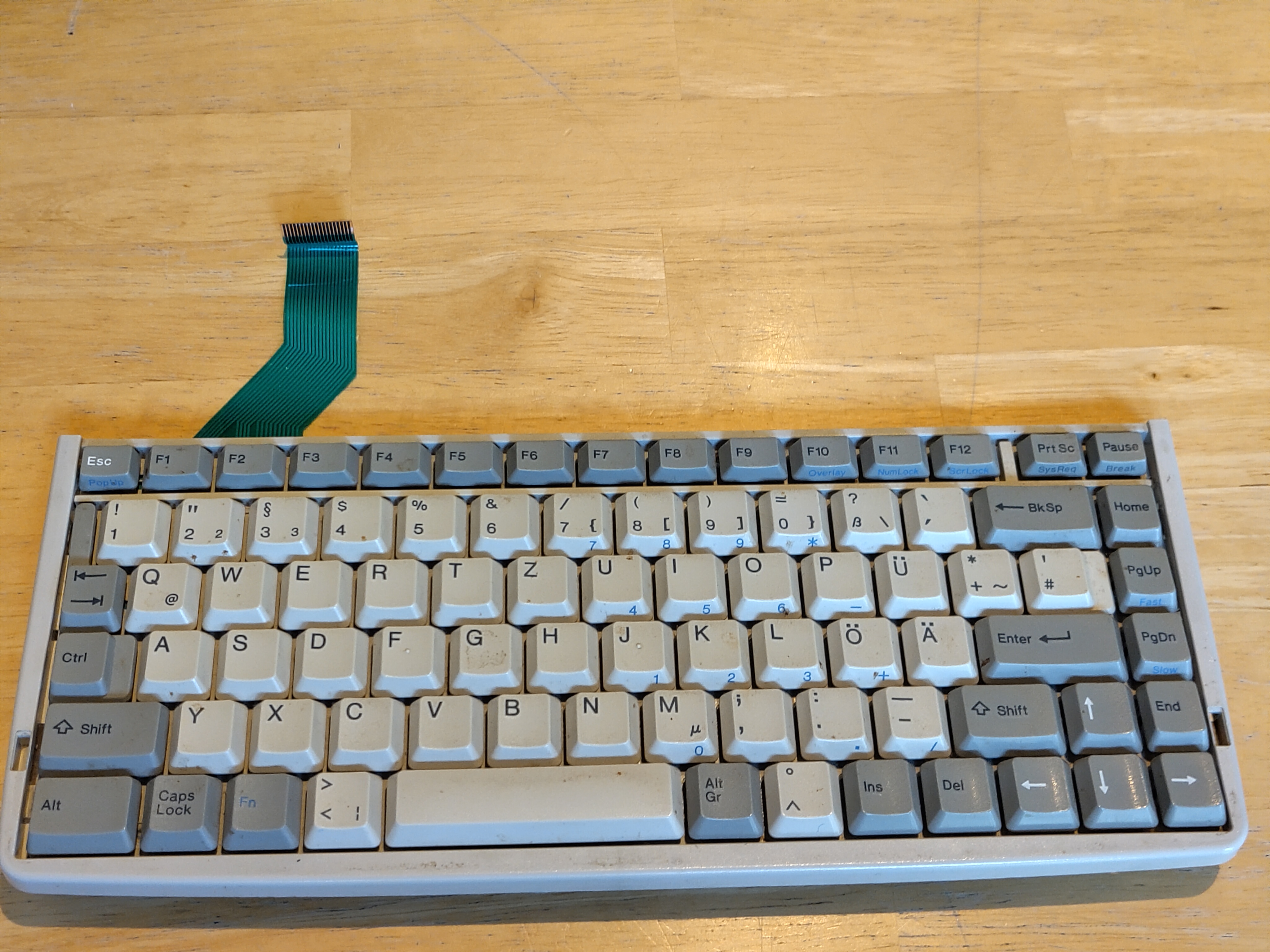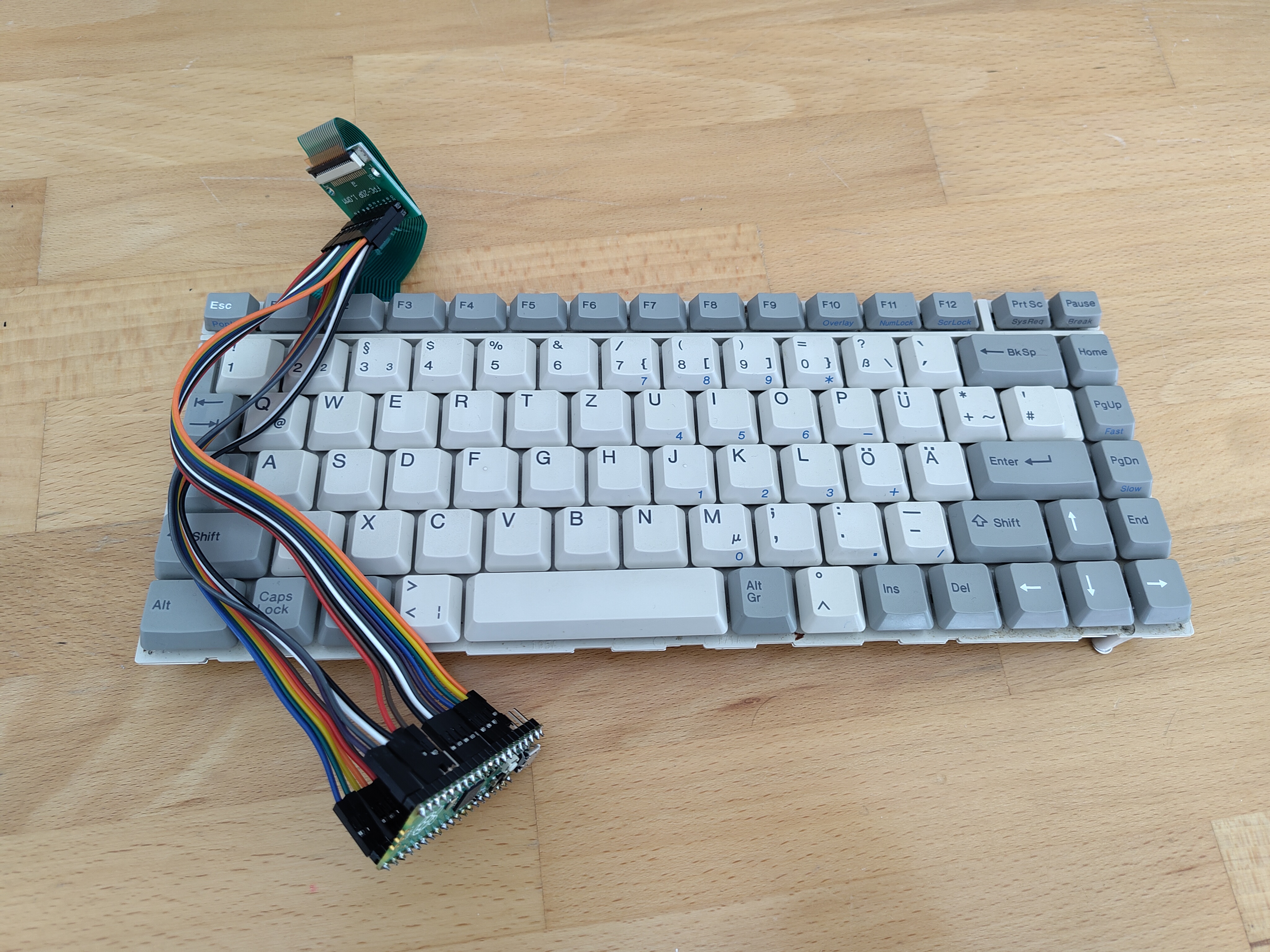 Nach dem Auslesen der Tastaur konnte nun mittels KI-Unterstützung ein passender Tastaturcontroller programmiert werden, wobei die Wahl hier auf den Raspberry Pi Pico fiel, da dieser als USB HID-Eingabegerät konfiguriert werden kann. Nach einigen Experimenten fiel die Wahl schließlich auf die Arduino IDE und C++, um eine für Tastaturanschläge notwendige Geschwindigkeit erzielen zu können. Auch wurde die Status-LED "CapsLock" mit dem Raspberry Pi Pico so verbunden, dass diese anzeigt, ob die Großschreibtaste gedrückt ist oder nicht. Das fertige Programm kann (hier) heruntergeladen werden: