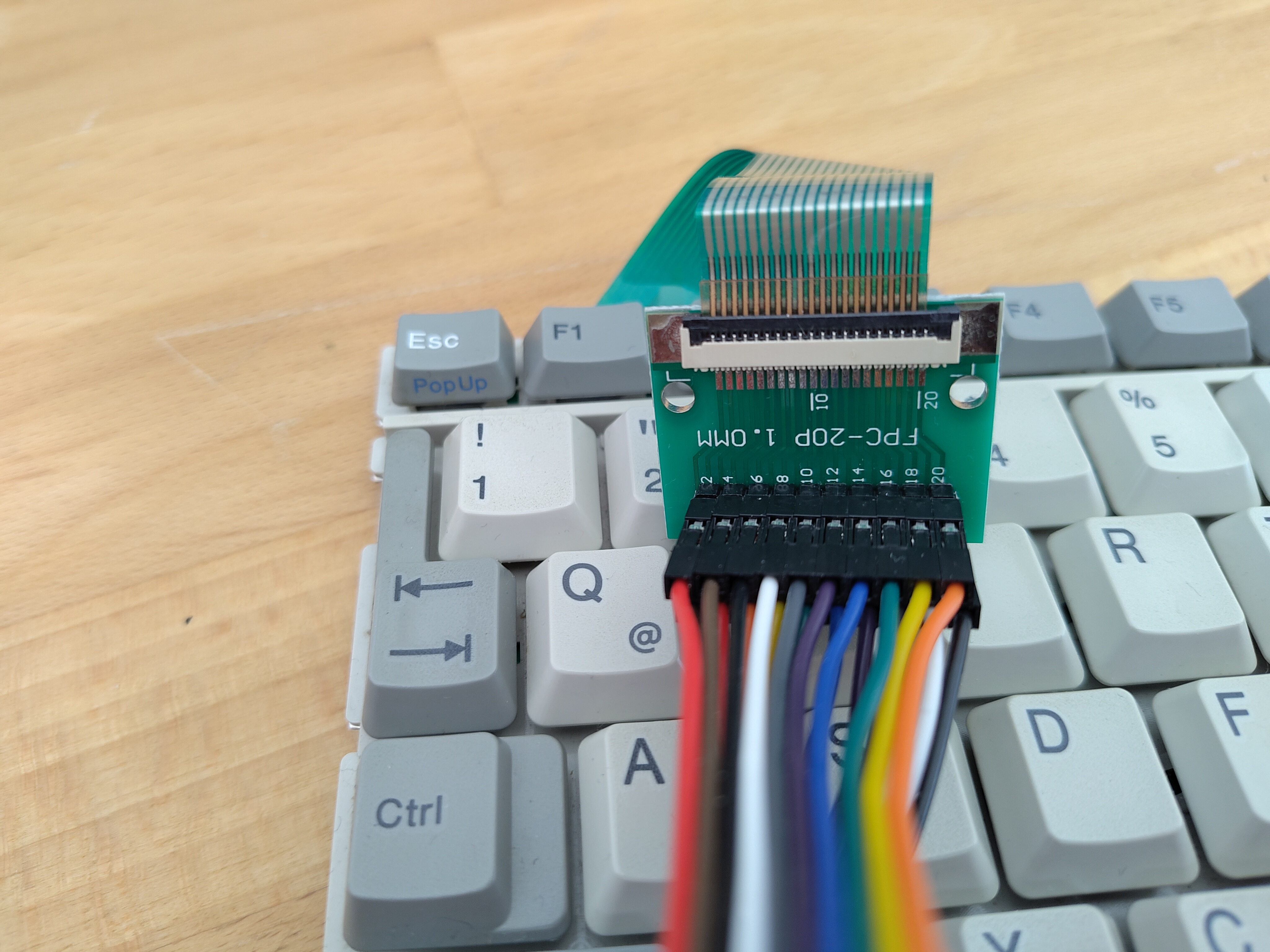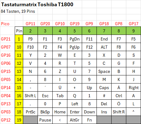 Die Original-Tastatur des Toshiba T1800 weiterzunutzen war die wichtigste Aufgabe, um ein "Retro-Feeling" bei der Nutzung des mit neuer Technik ausgestatteten Laptops zu ermöglichen. Dazu musste zunächst die Tastaturmatrix, sprich die Verschaltung der einzelnen Tasten, mittels eines Messgerätes ausgelesen werden, wie ich über eine Recherche unter Zuhilfenahme einer KI erfuhr. Zu diesem Zweck musste ein Adapter her, der das 19-polige Flachbandkabel in Dupont-Stecker mit 2,54 mm Rastermaß konvertiert. Anschließend wurde mittels eines kleinen Python-Programms, welches bei Kontakt eine optische Rückmeldung gab, jede der möglichen Pin-Kombinationen des Tastatur-Flachbandkabels ausgelesen.