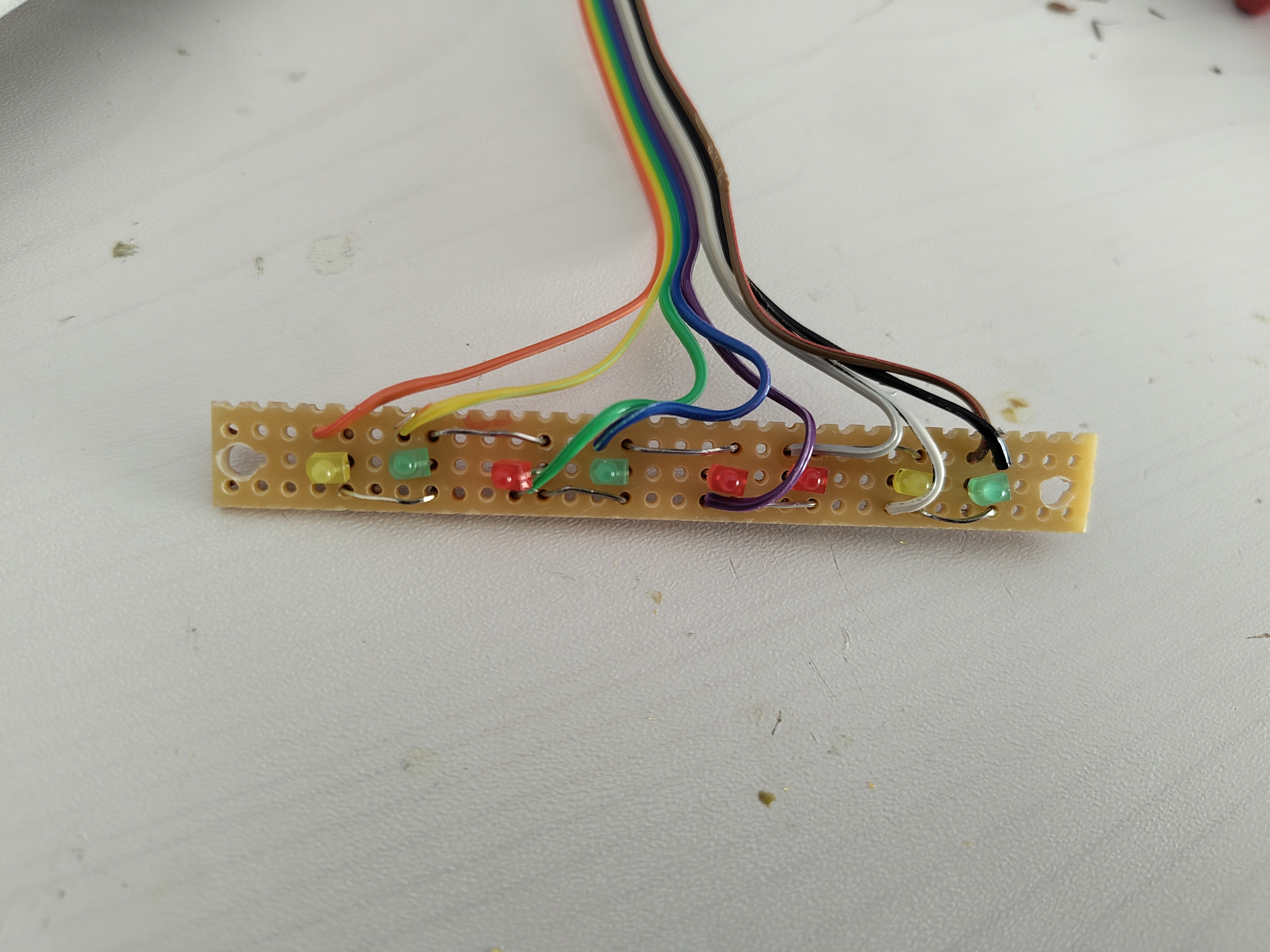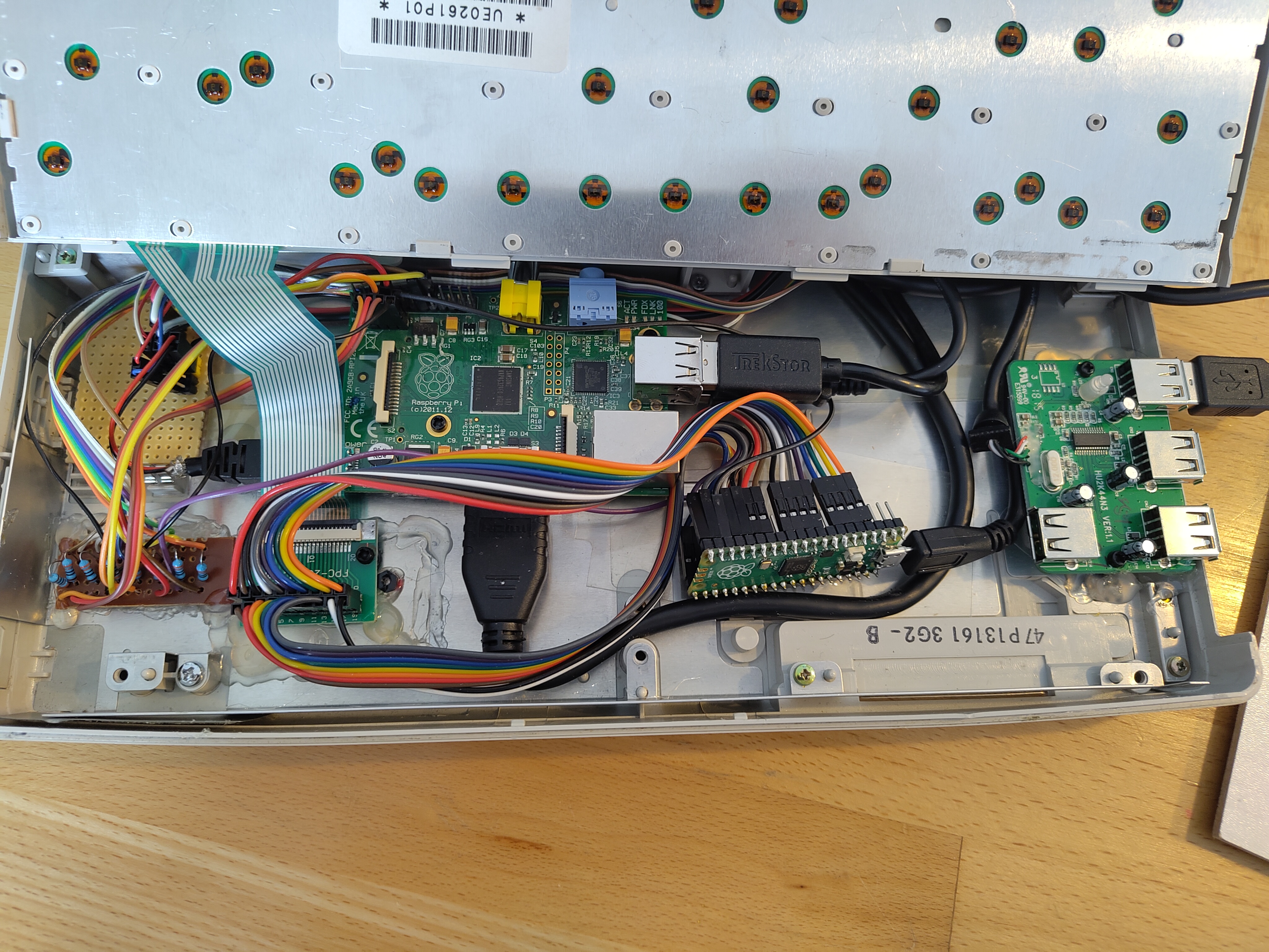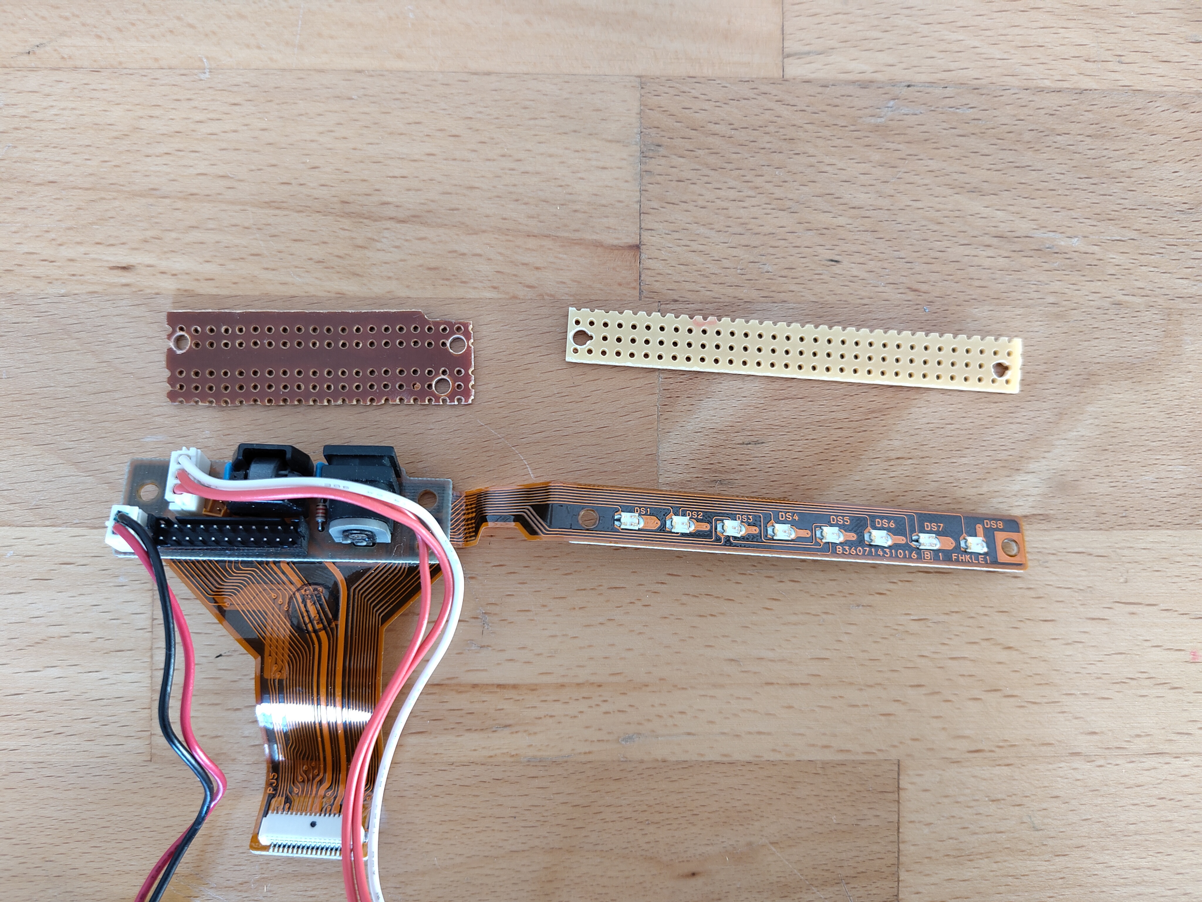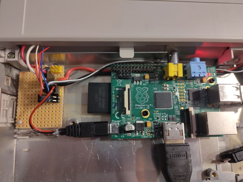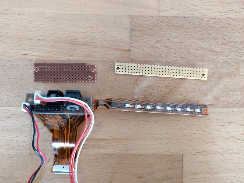 Die LED-Leiste nachzubauen war schon etwas kniffliger, da die Abstände der originalen LEDs nicht dem 2,54mm Rastermaß entsprechen. Dennoch gelang es, mittels Mini-LEDs, die mal mit einem, mal mit zwei Löchern Abstand auf eine Streifenrasterplatine gelötet wurden, die beschrifteten Plexiglas-Aussparungen der LED-Leiste ziemlich genau anzusteuern. Um Kabelmaterial zu sparen, wurden die LED-Kontakte mit dem Minuspol immer zum Minuspol der nächsten LED umgebogen, während die LED-Pluspolkontakte direkt mit einem Kabel verbunden wurden. Da unterhalb der LED-kein Platz für die Vorwiderstände war, wurden die Kabel von der LED-Lichtleiste zu einer weiteren, separaten Streifenrasterplatine geführt und von dort mittels Kabeln mit Dupont-Buchsen an den Raspberry Pi 1B bzw. an den Raspberry Pi Pico angeschlossen. Dabei musste die Datei "/boot/firmware/config.txt" in der Boot-Partition des Raspberry Pi 1B so umgeschrieben werden, dass die ACT-LED und die PWR-LED an eine externe LED der LED-Leiste umgeleitet wurden. Dies erfolgte mittels der Zeilen "dtoverlay=act-led,gpio=24" für die ACT-LED und "dtoverlay=gpio-led,gpio=23,active_low=1,label=PWR" für die PWR-LED des Raspberry Pi. Das Ergebnis ist Nostalgie pur: Während die LED "Power/Speed" leuchtet, wenn der Raspberry Pi 1B eingeschaltet ist, blinkt die LED "C:" synkron zur Aktivität der SD-Karte des Raspberry Pi 1B:
