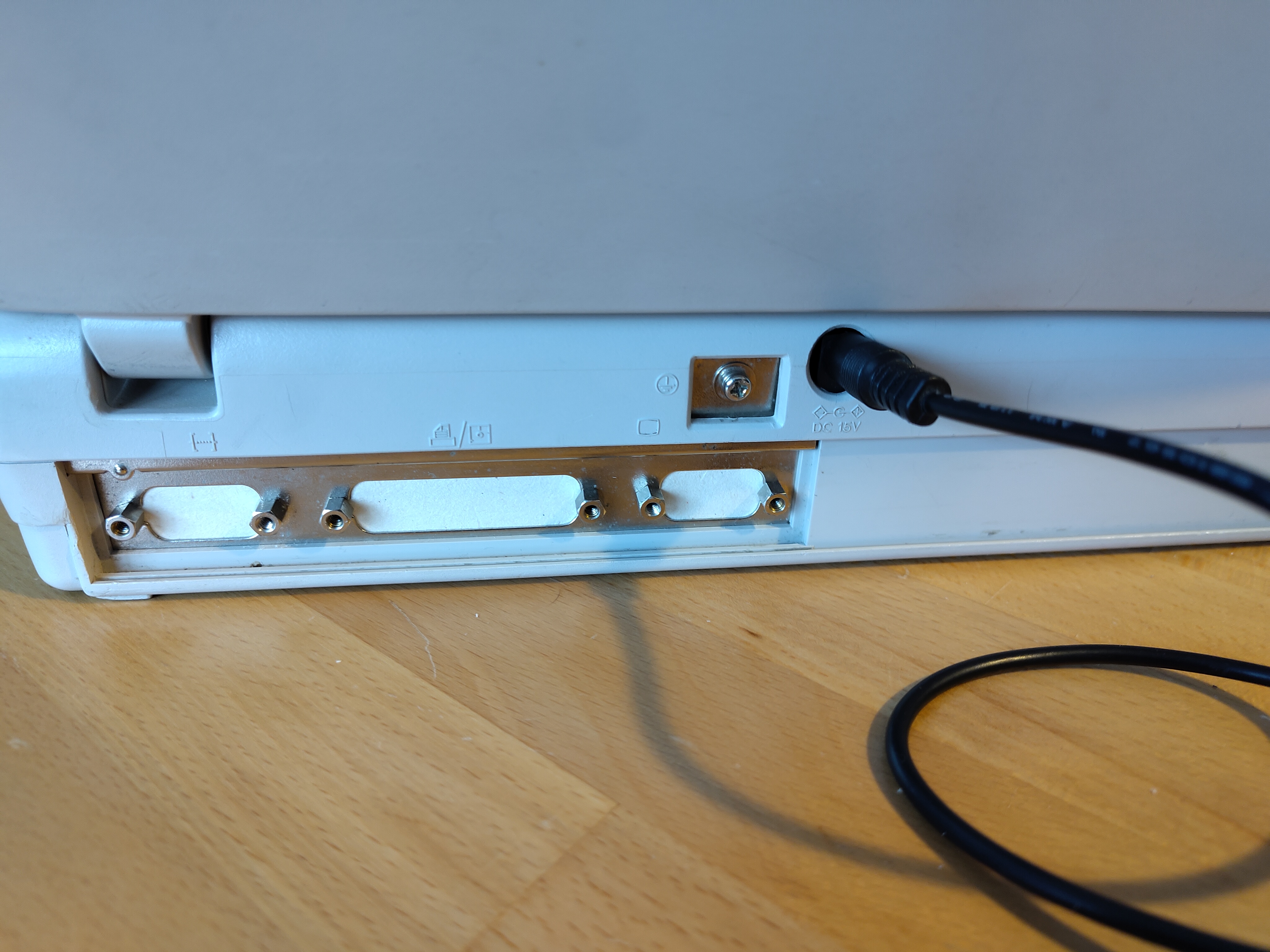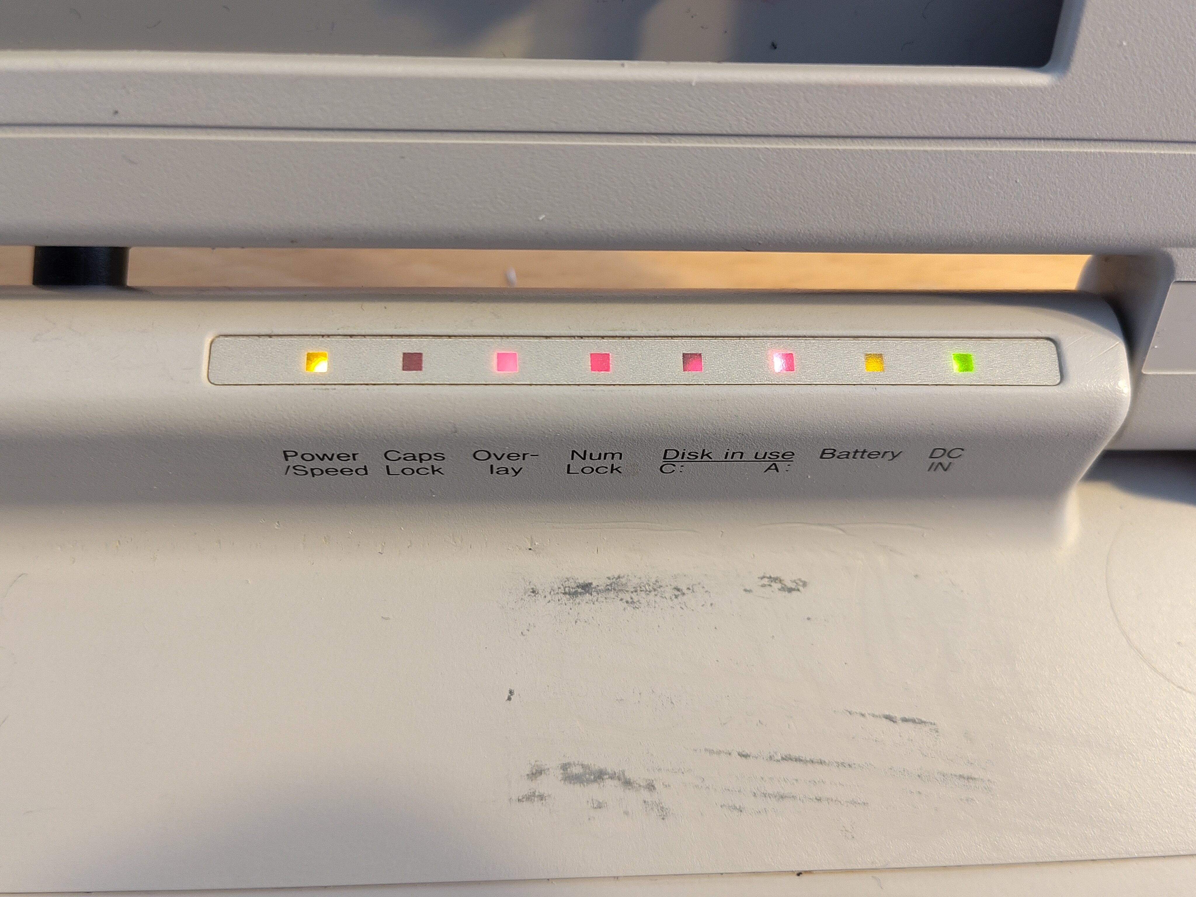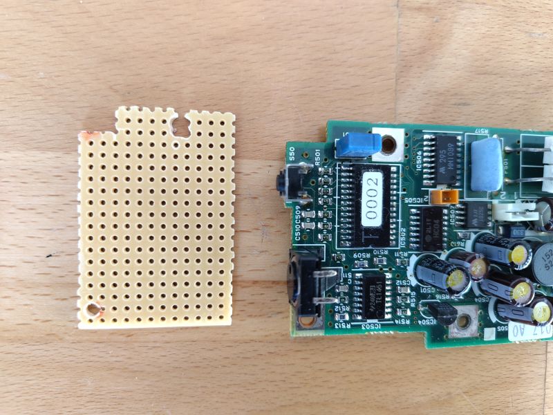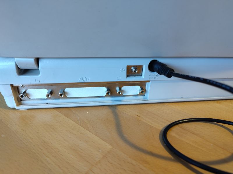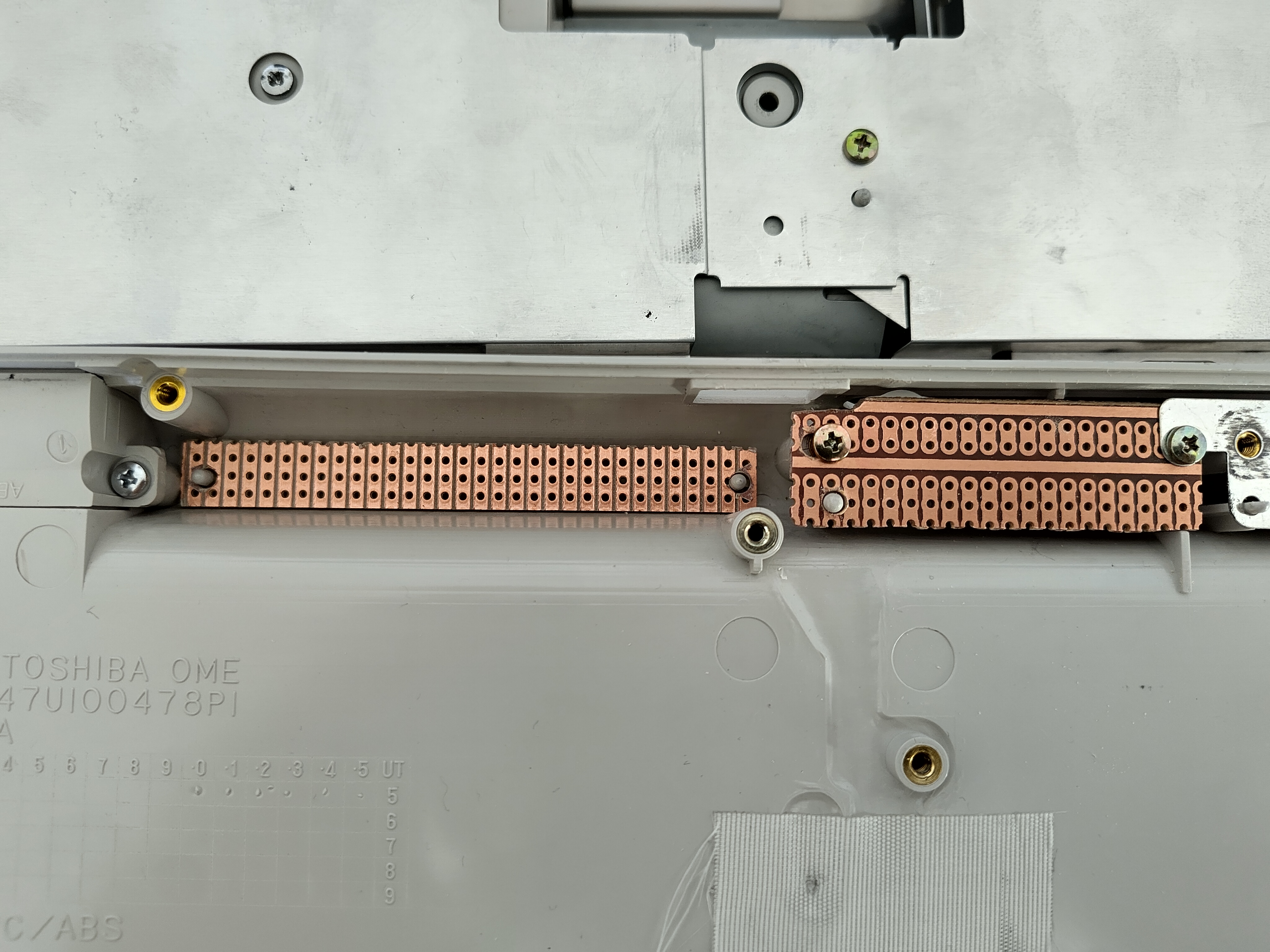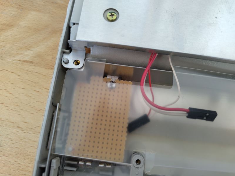 Andererseits sollten aber z.B. der Power-Button an der Seite, die LED-Leiste unter dem Bildschirm und auch die Power-Buchse an der Rückseite des Laptops weitergenutzt werden; die Wahl fiel hier auf einen selbst gebastelten Ersatz, wofür Loch- und Streifenrasterplatinen so zurechtgeschnitten, gebohrt und bestückt wurden, dass sie wie die ausgebauten Originale verwendet und gleichzeitig die alten Schraubbesfestigungen genutzt werden konnten. Im Fall der Power-Buttons wurde zu diesem Zweck der originale Button von dem 80386-Mainboard ausgelötet, während die Power-Buchse und die LED-Leiste komplett neu modelliert werden mussten (siehe weiter unten):