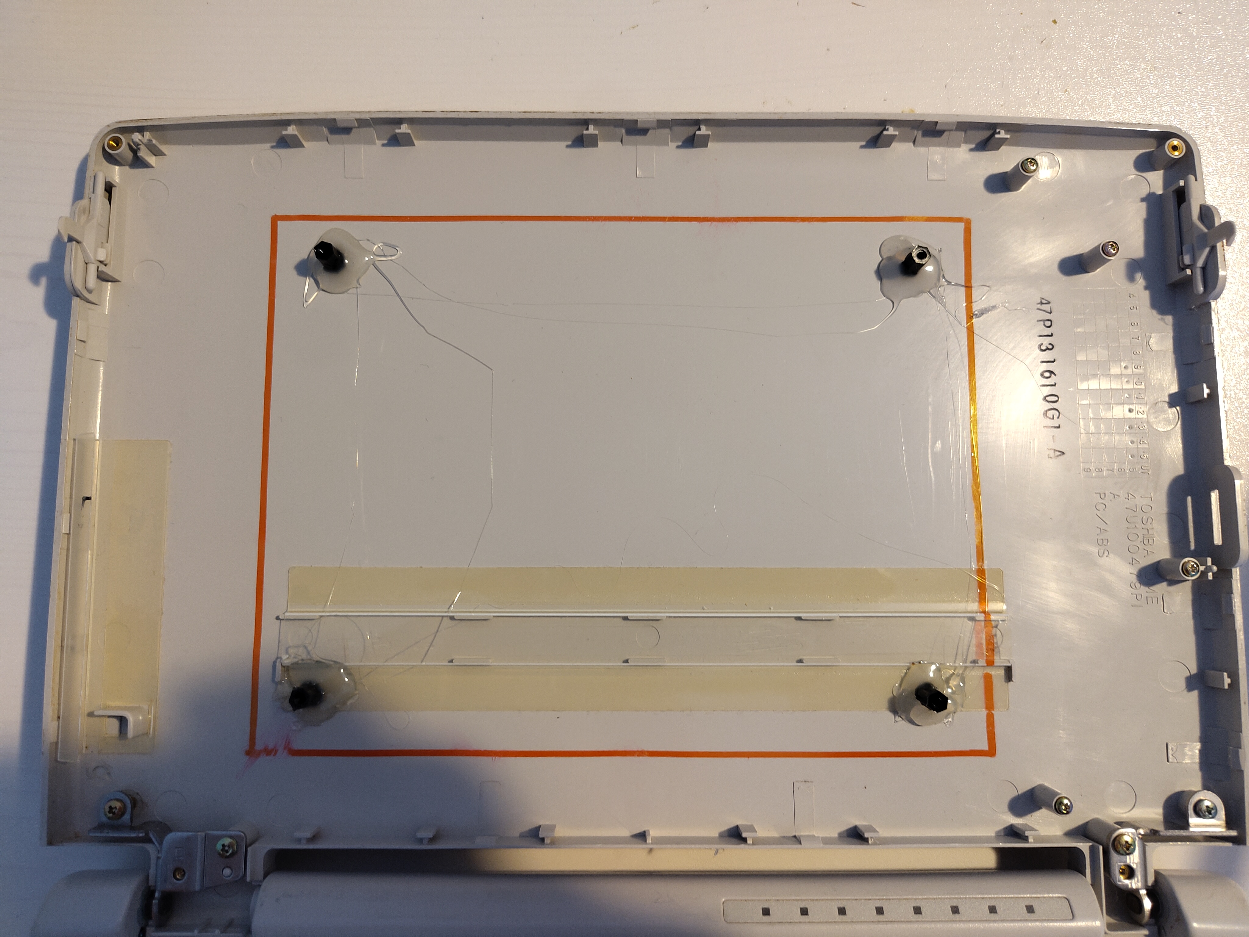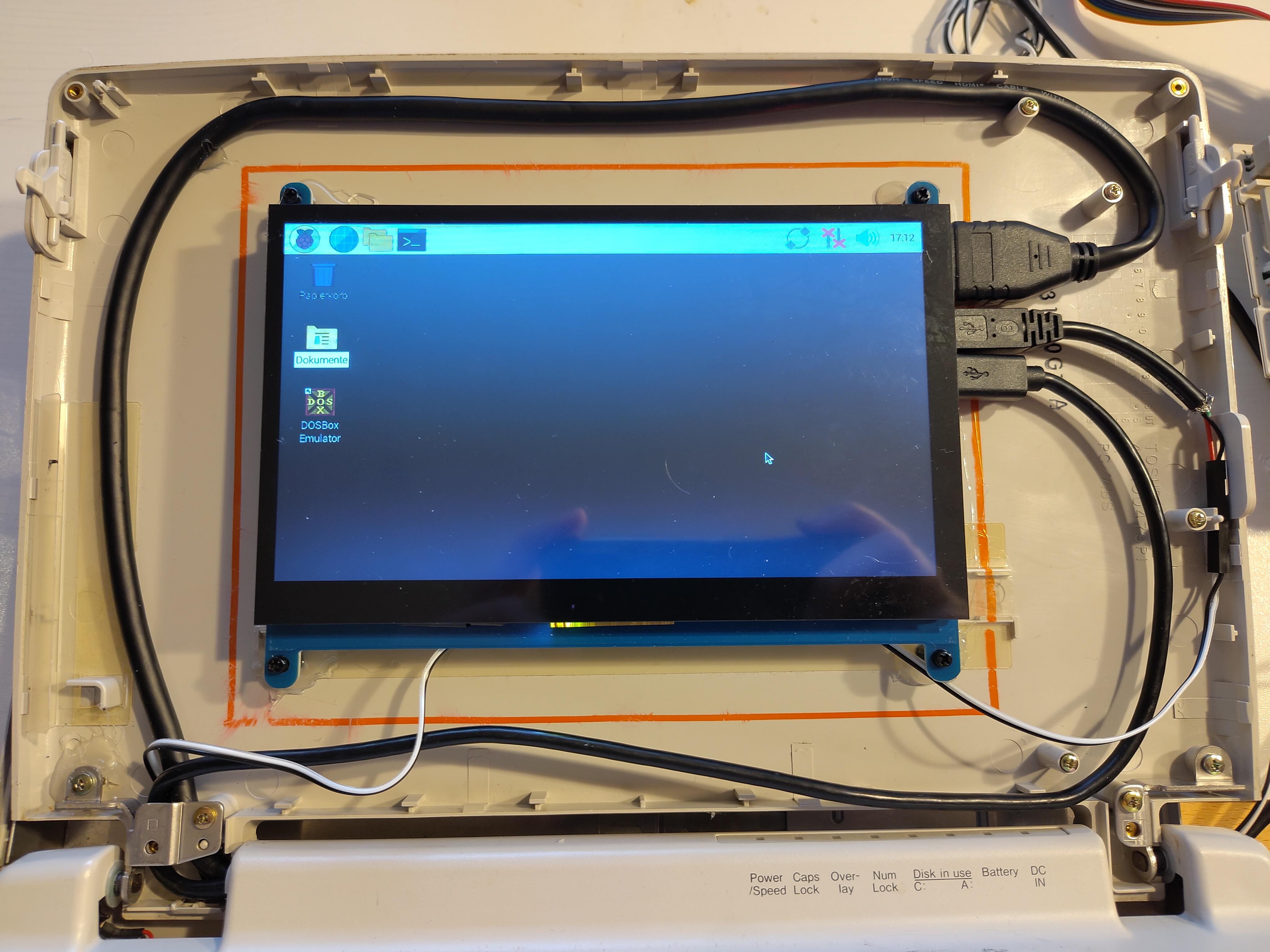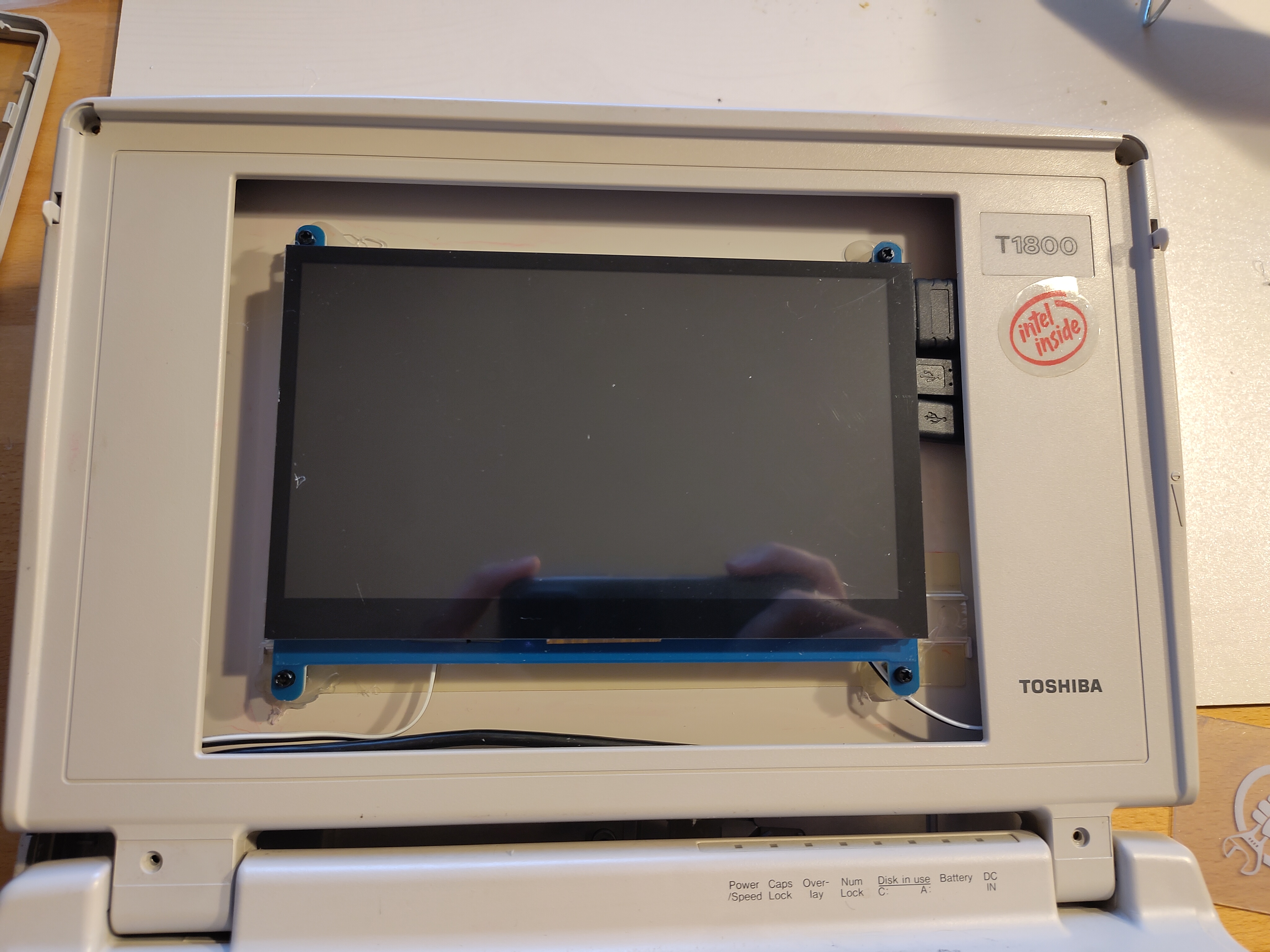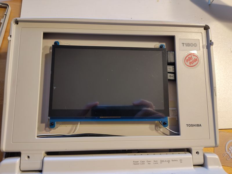 Das HDMI-Display, welches neu bestellt werden musste, sollte möglichst gut in den alten Displayrahmen hineinpassen und kostengünstig sein. Die Wahl fiel hier auf ein 7-Zoll-Einbaufarbdisplay, welches mit kapazitiver Touchfunktion ausgestattet war. Um die Schraublöcher in der Platine des Displays nutzen zu können, wurden Kunststoffgewinde mittels Heißkleber von innen an den Displaydeckel geklebt. Die Kabelführung (1x HDMI und 2x USB für Touch und Power) vom Display zum Laptop-Unterteil wurde dadurch ermöglicht, dass das Power-USB-Kabel aufgeschnitten und nur die beiden stromversorgenden Kabel als einzelne Leitungen in das Laptop-Unterteil geführt wurden. Später wurde dann alles mit einer dekorativen Pappe verkleidet: