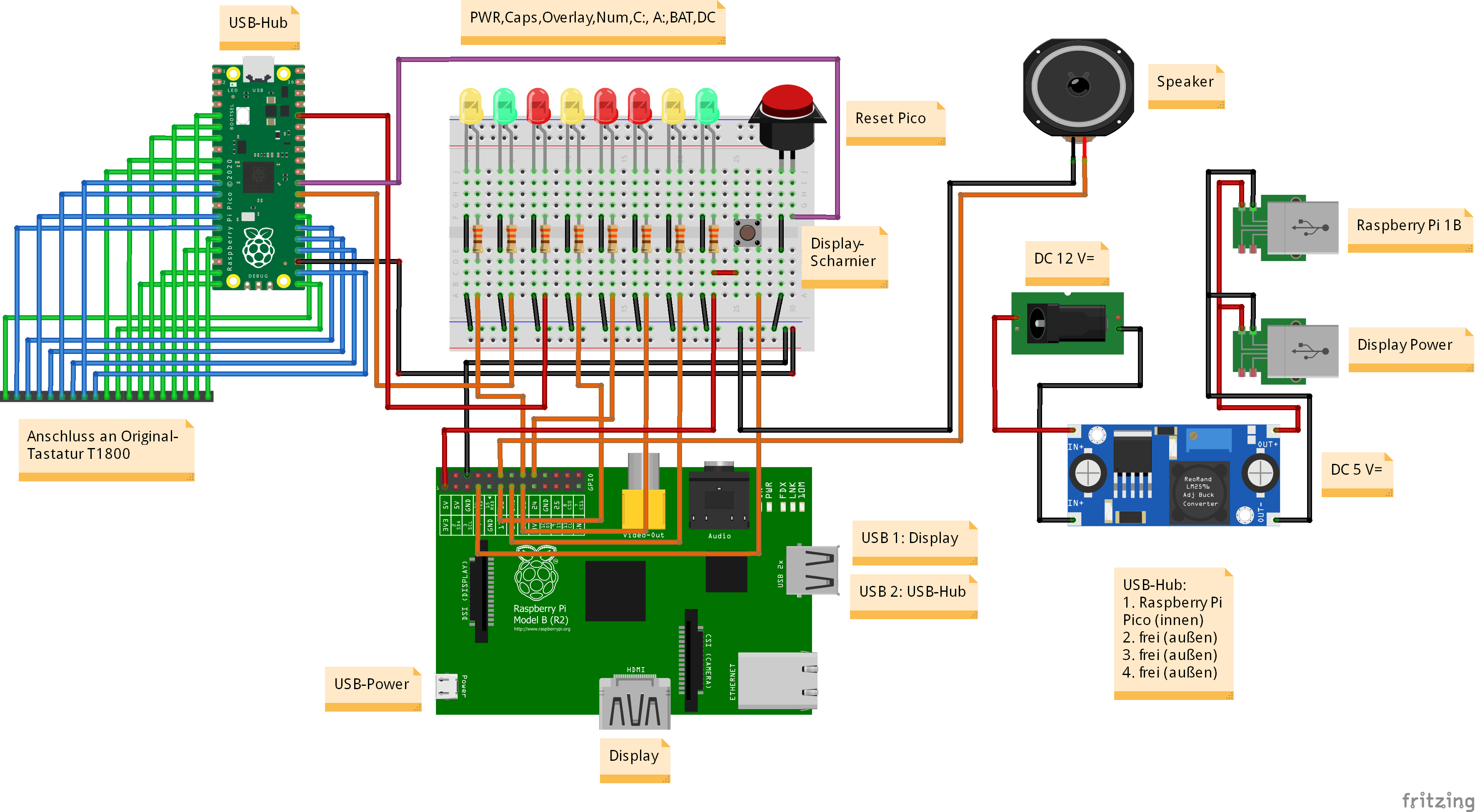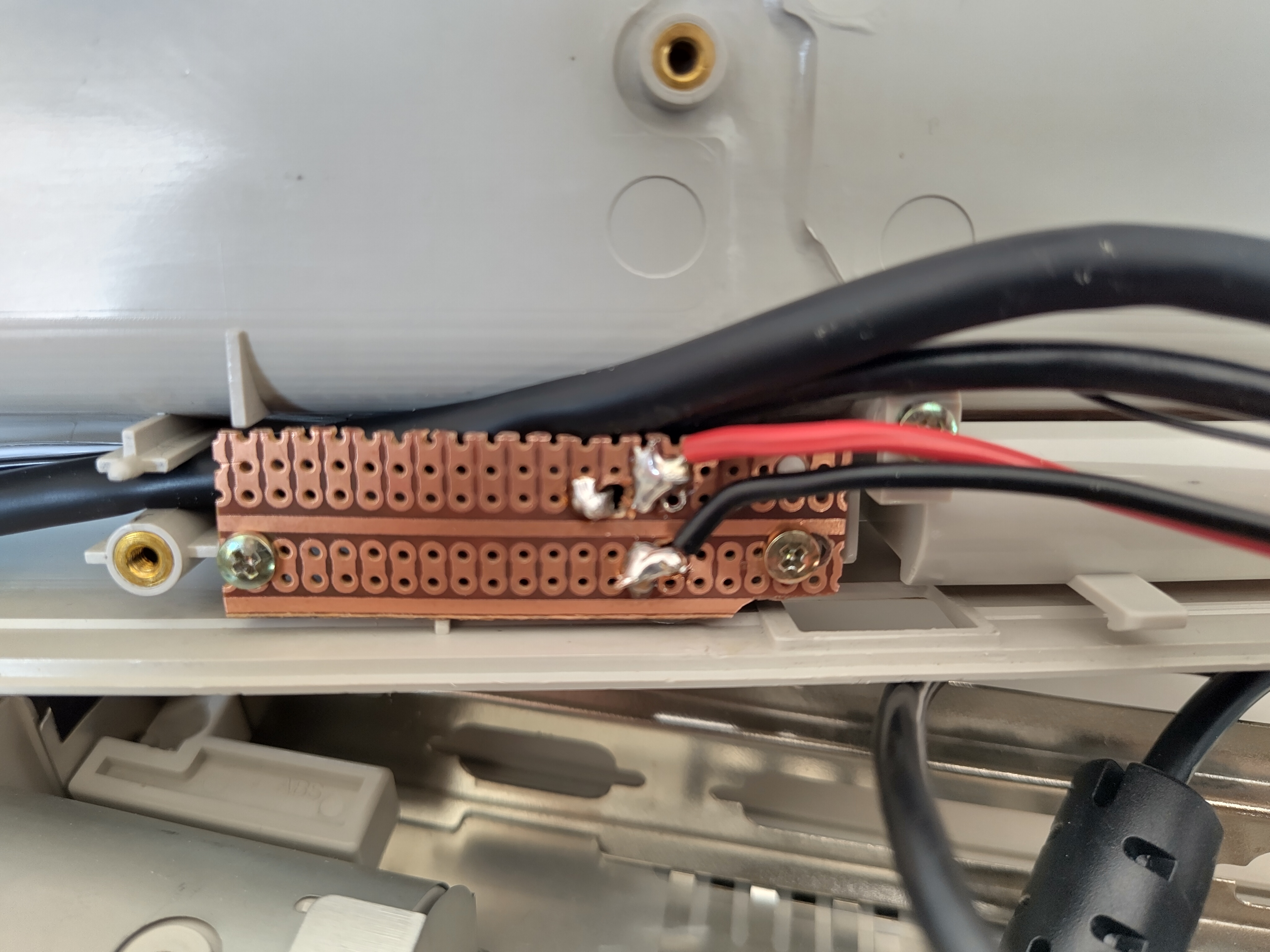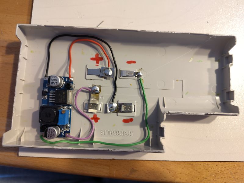 Die Stromversorgung, d.h. der DC-DC-Wandler, wurde in den alten Akku-Gehäuse untergebracht. Dies war umso leichter möglich, als von den Akku-Kontakten an der Unterseite des Laptop-Gehäuses zwei Adernpaare in das Laptop-Unterteil führten, die auf diese Weise - mit Dupont-Buchsen versehen - weitergenutzt werden konnten: Das dickere Andernpaar führt die 12 Volt Eingangsspannung von der Power-Buchse zum Spannungswandler; von dort transportiert das dünnere Adernpaar die 5 Volt Ausgangsspannung über eine Lochrasterplatine mittels umgebauter Micro-USB-Anschlusskabel sowohl zum Display als auch zum Raspberry Pi 1B, um beide Geräte mit Strom zu versorgen: